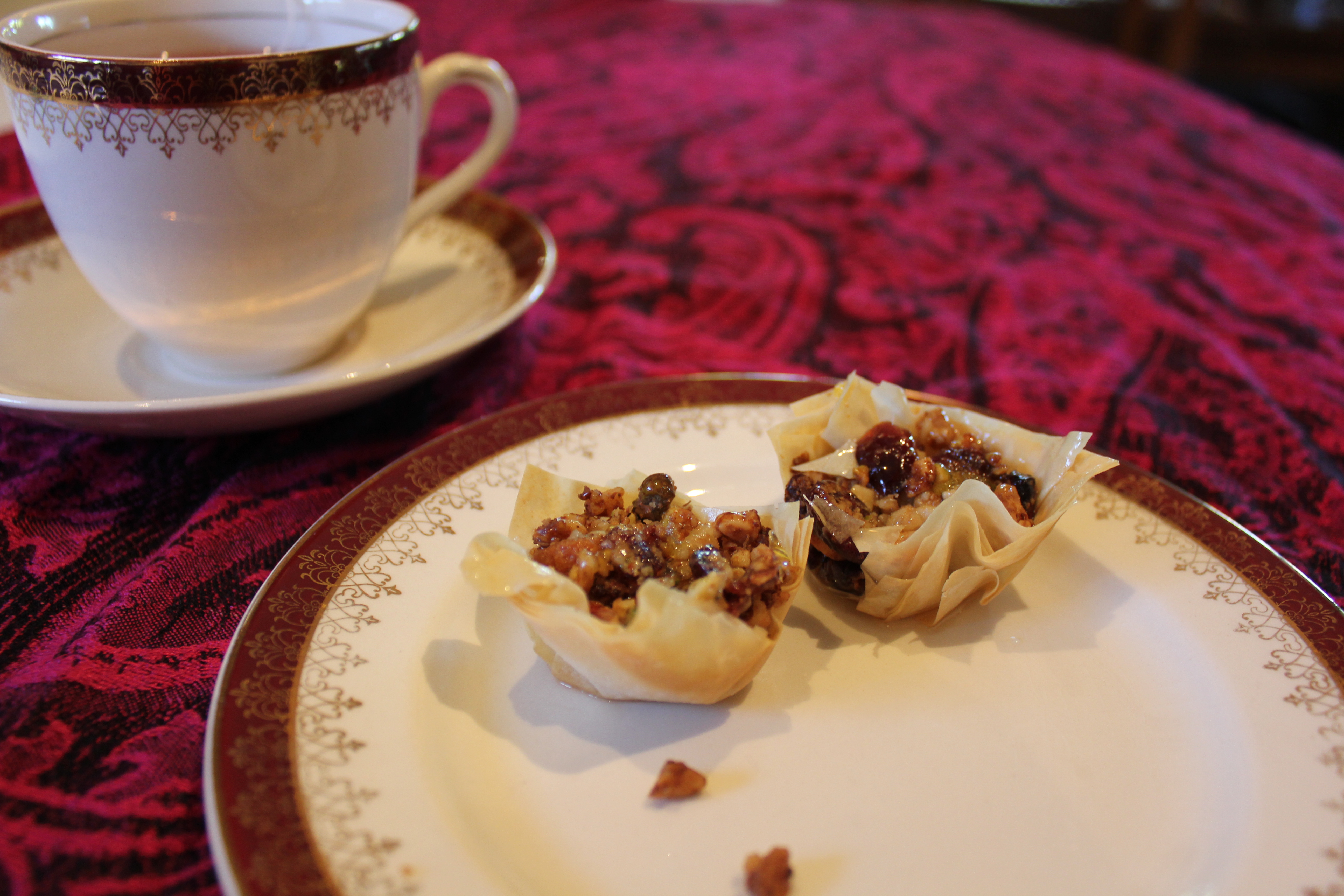 Whip the syrup off the heat, remove the rind and cloves and set it aside to cool for five minutes. In this time, scoop your trail mix into the awaiting filo cups. Now spoon the warm syrup over the baklava gems. If you’ve got the time and patience, you can also brush the edges of the filo with extra syrup.