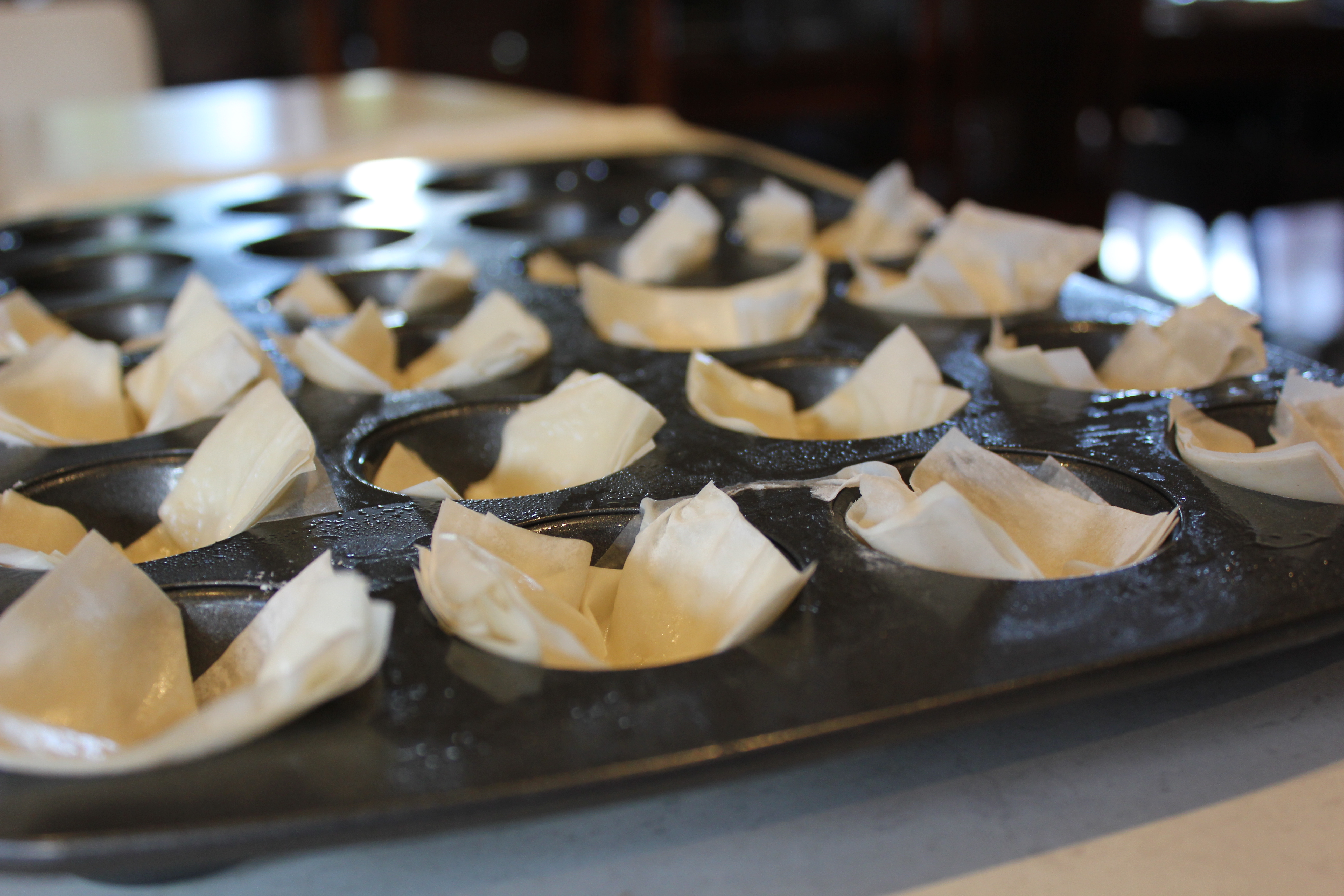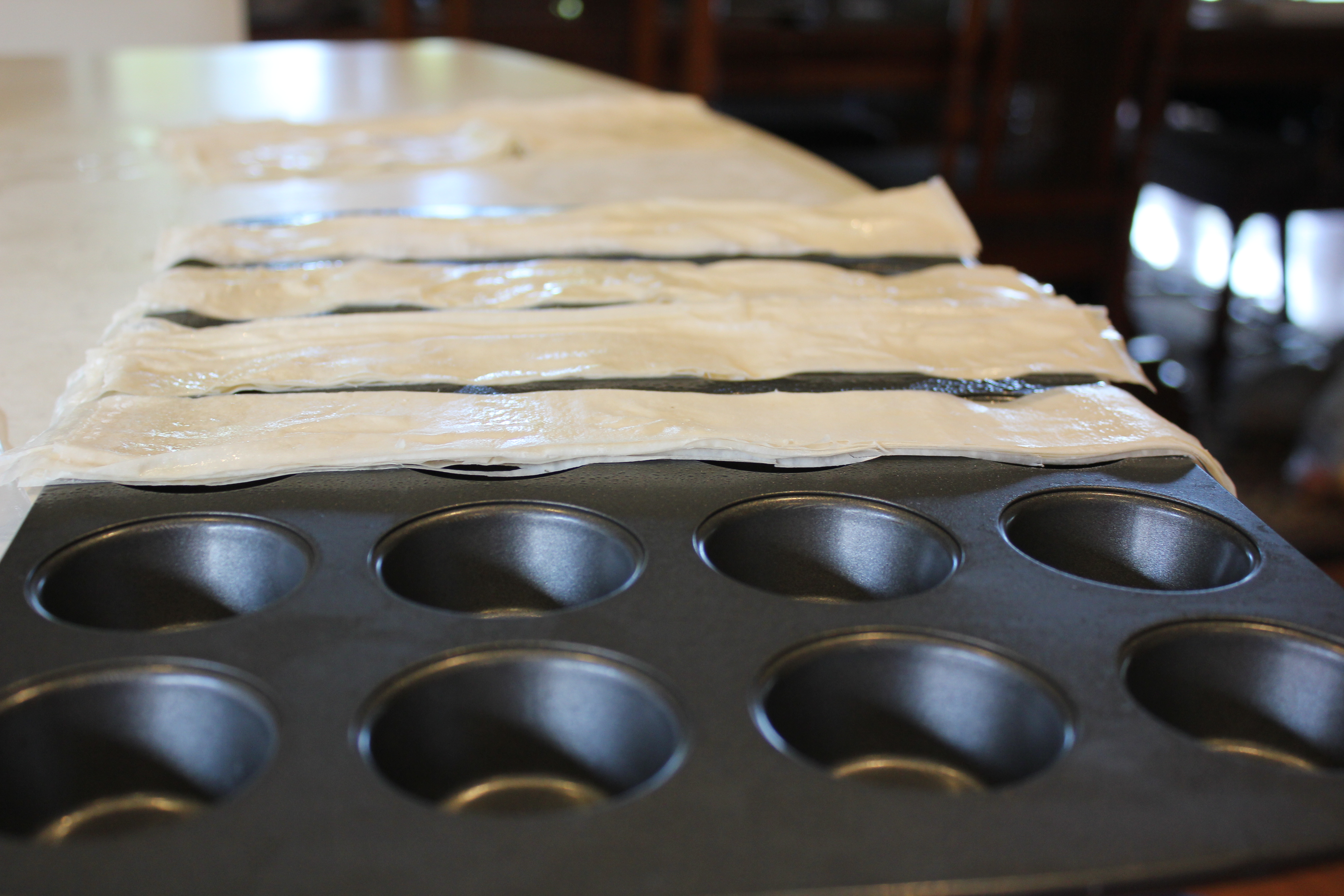 Cut your pastry strips to size, pushing the filo squares into the cups as you go along. Try to push them down into the cup so that you get four points rising from the cup and decent cavity to fill with your nut mixture.