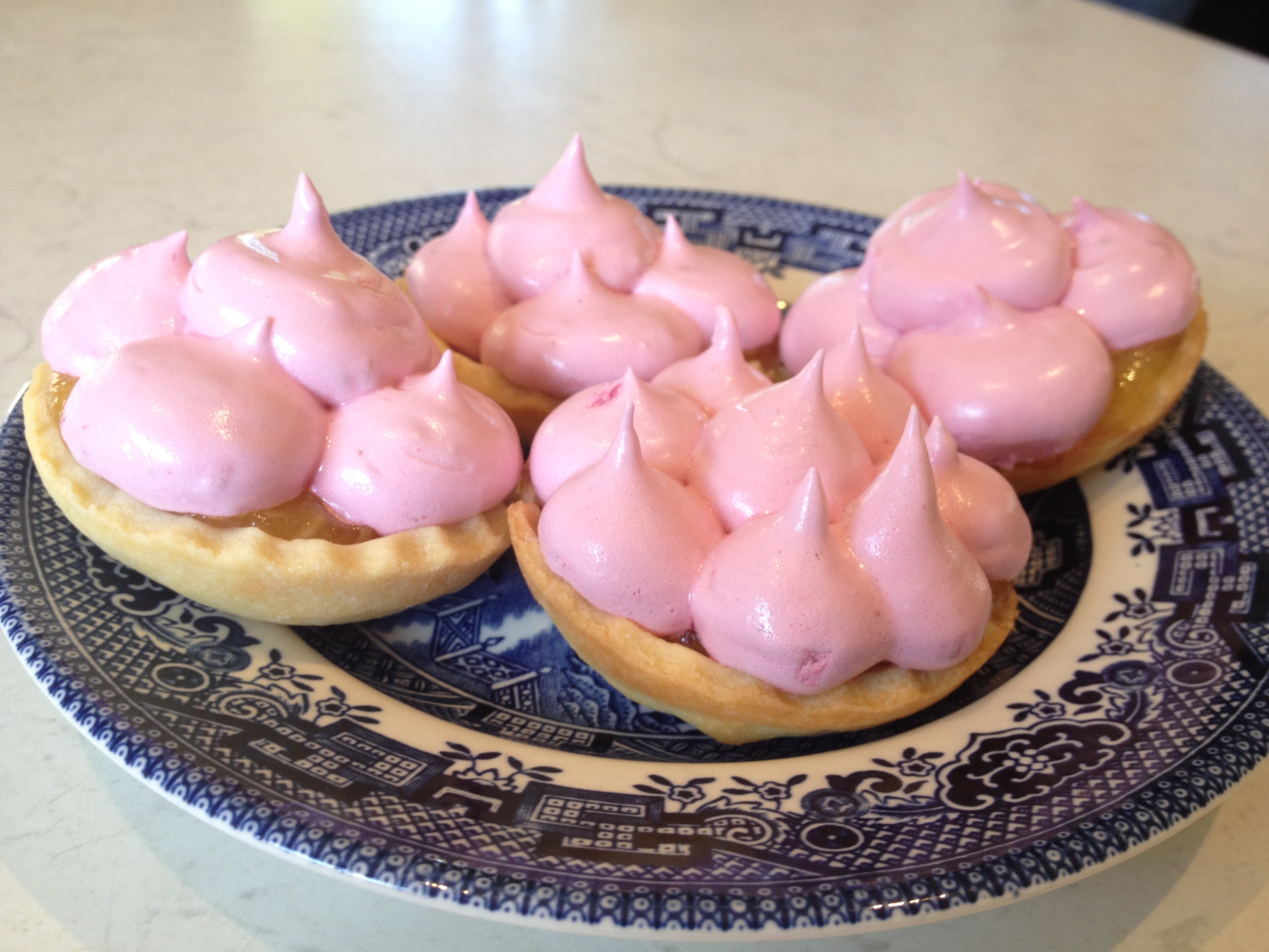 Take the muffin cases out of oven and let them cool for five minutes. Spoon two tablespoons of lemon curd into each pastry case and pop them back into the oven for ten minutes. When they come out of the oven set them to one side and turn the oven up to 240 degrees. Pipe or spoon the raspberry meringue onto the lemon curd (be generous!) and then put them in the middle tray of the oven with the door open for 10-15 minutes.