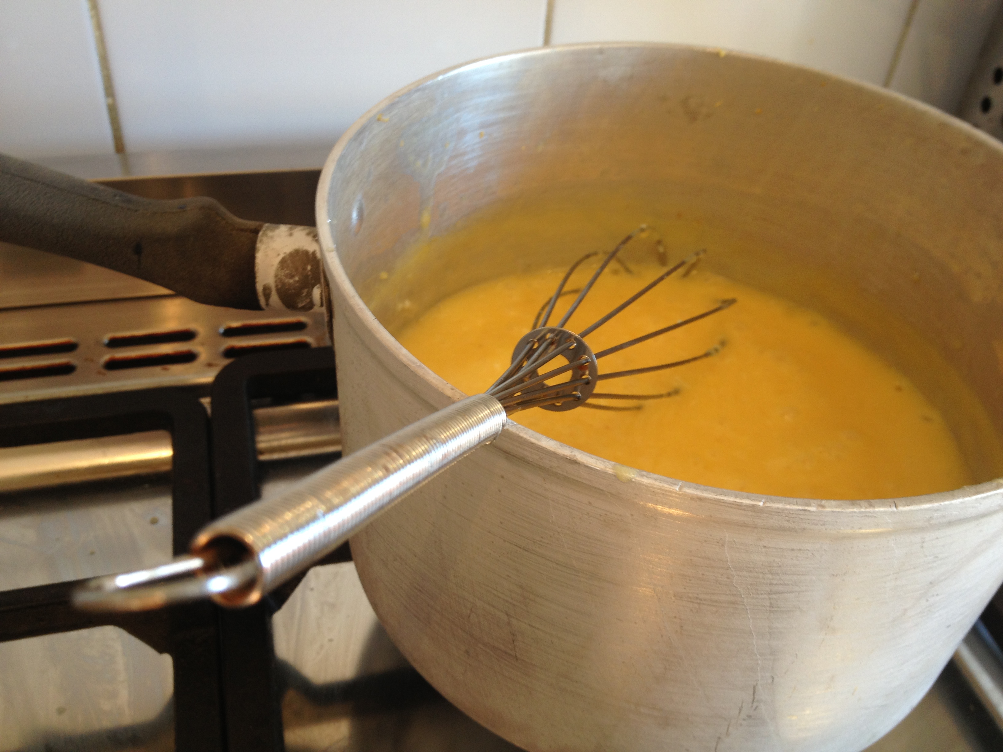 Zest and juice your lemons. Or juice then zest them – whatever works for you. Put the lemon juice, zest, sugar and butter into a pan over a medium heat. Stir the mixture until the butter is melted. Whisk the eggs and egg yolk together, then add it slowly to the lemony mixture. Turn the heat up to high and allow it bubble quite fiercely. Whisk it for about five minutes (making sure it doesn’t burn) until it starts to thicken. You can also use your whisk to fish out any chunky bits of lemon that may have snuck through when you juiced the lemons. Take off the heat and transfer into a cool bowl so it can cool.