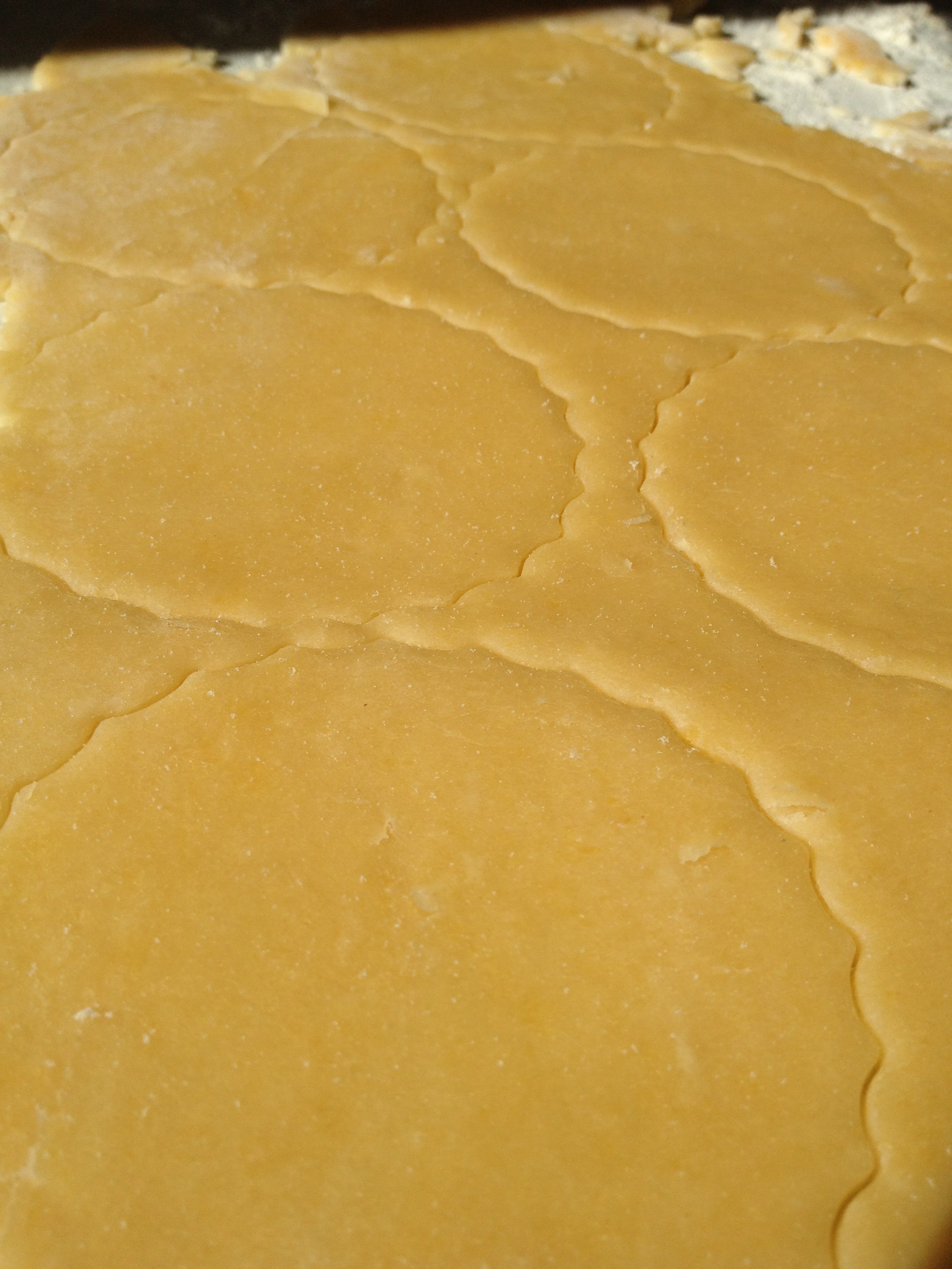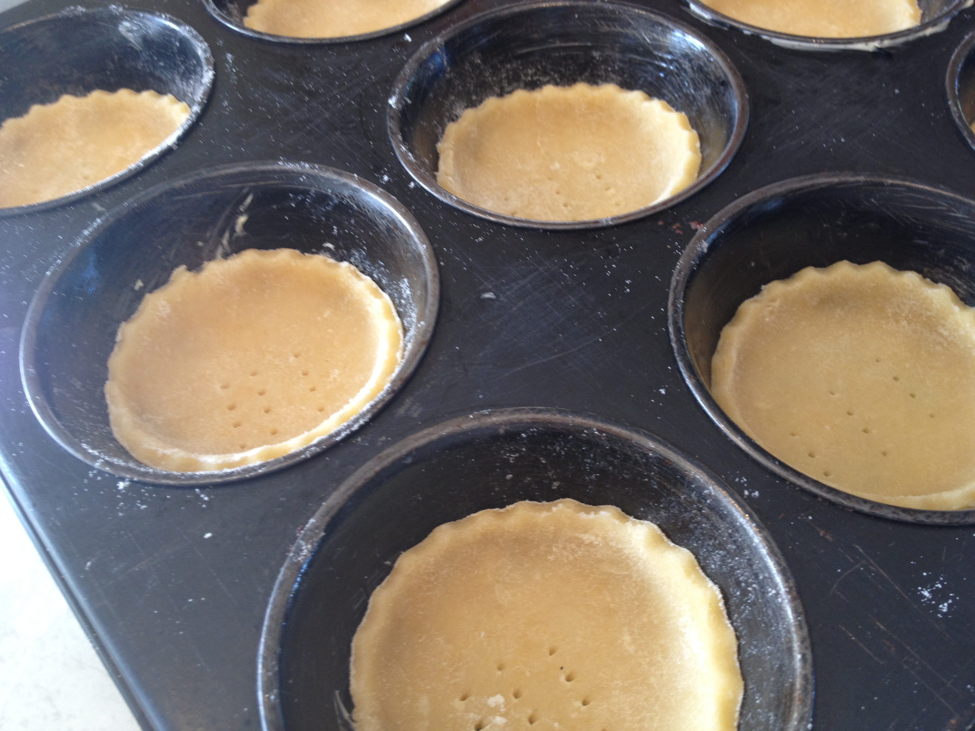 Grease two 12 cup muffin moulds and preheat the oven to 180 degrees. Take the dough out of the fridge and spread flour over a clean surface. Spread your rolling pin with flour too to stop the dough from sticking to it. Roll your dough out very thinly and use a cutter that is bigger than your muffin cups. Press the circles of pastry into your greased tins. Prick each circle at least three times and then pop them into the oven for ten minutes.