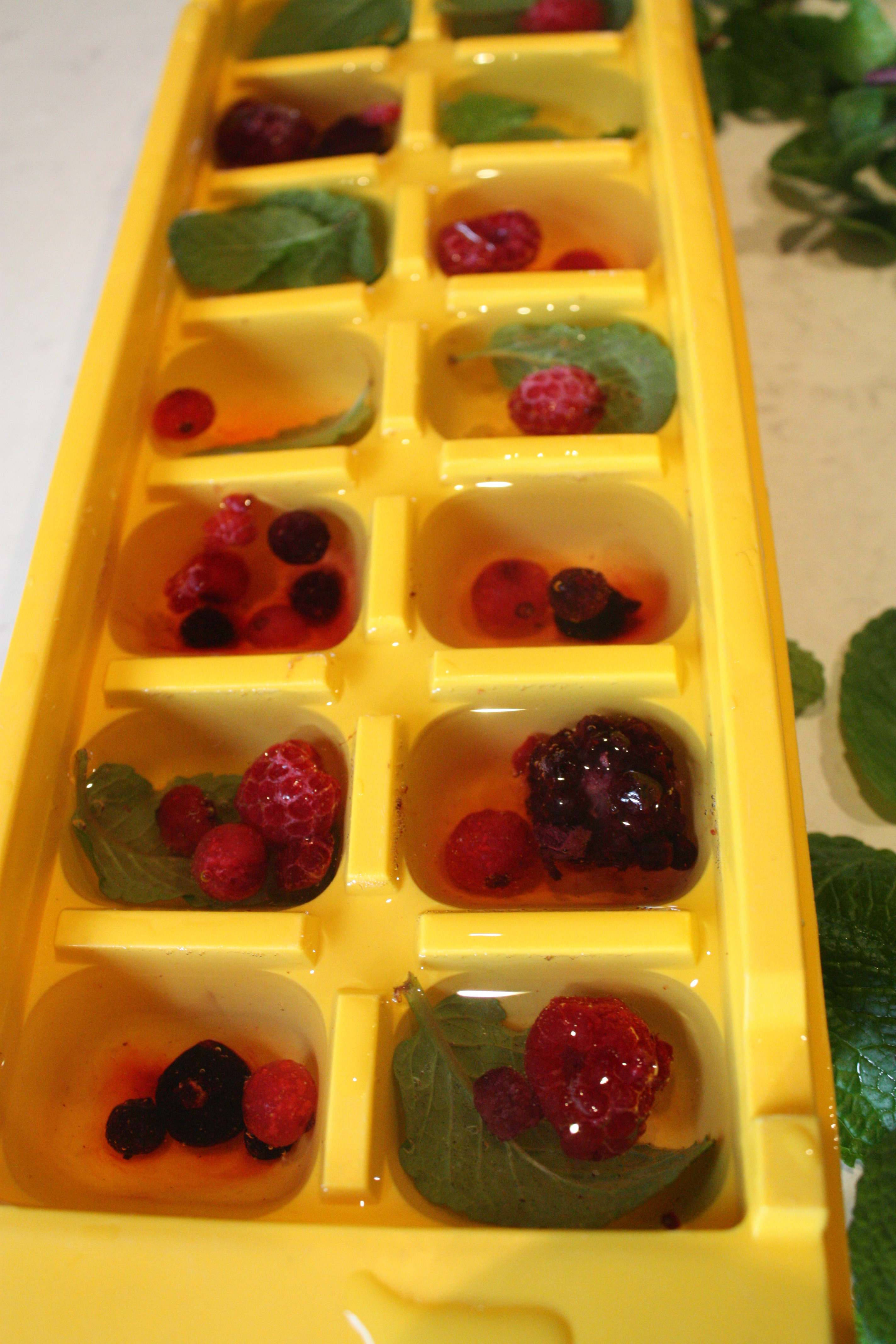 Try not to over-pack your ice cubes because you want a contrast between the ice and the berries and mint frozen inside them.