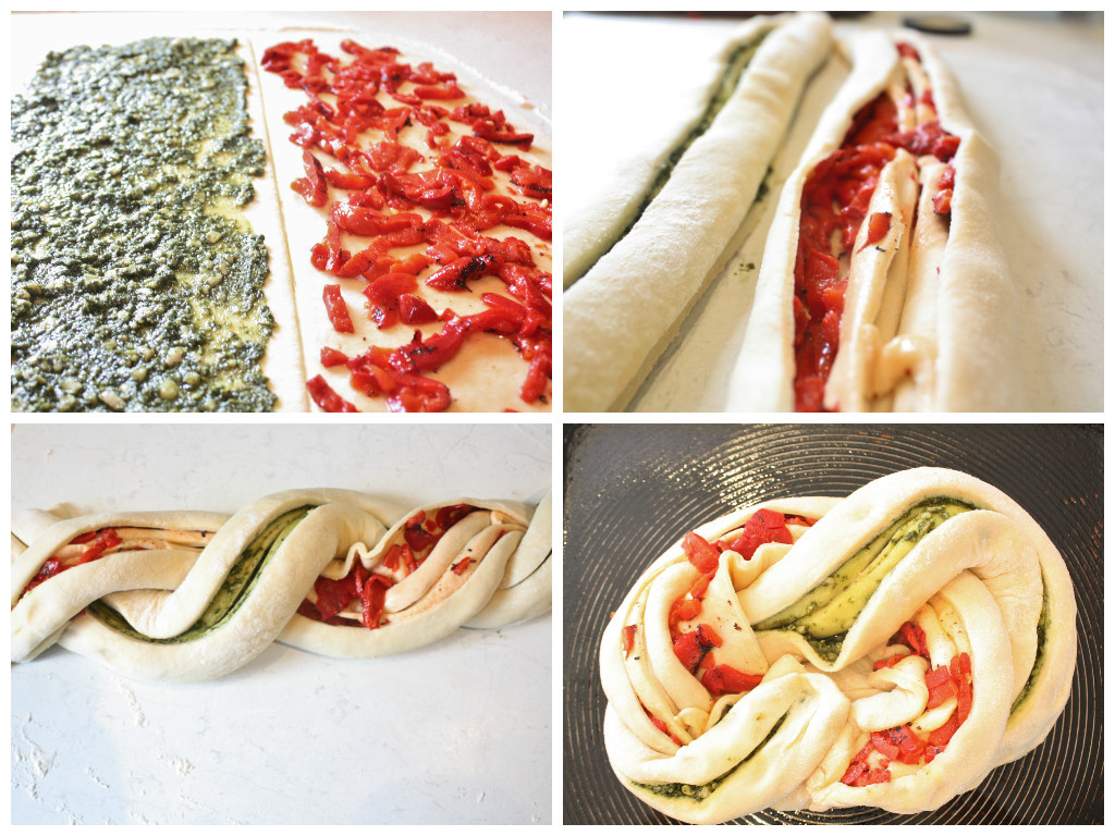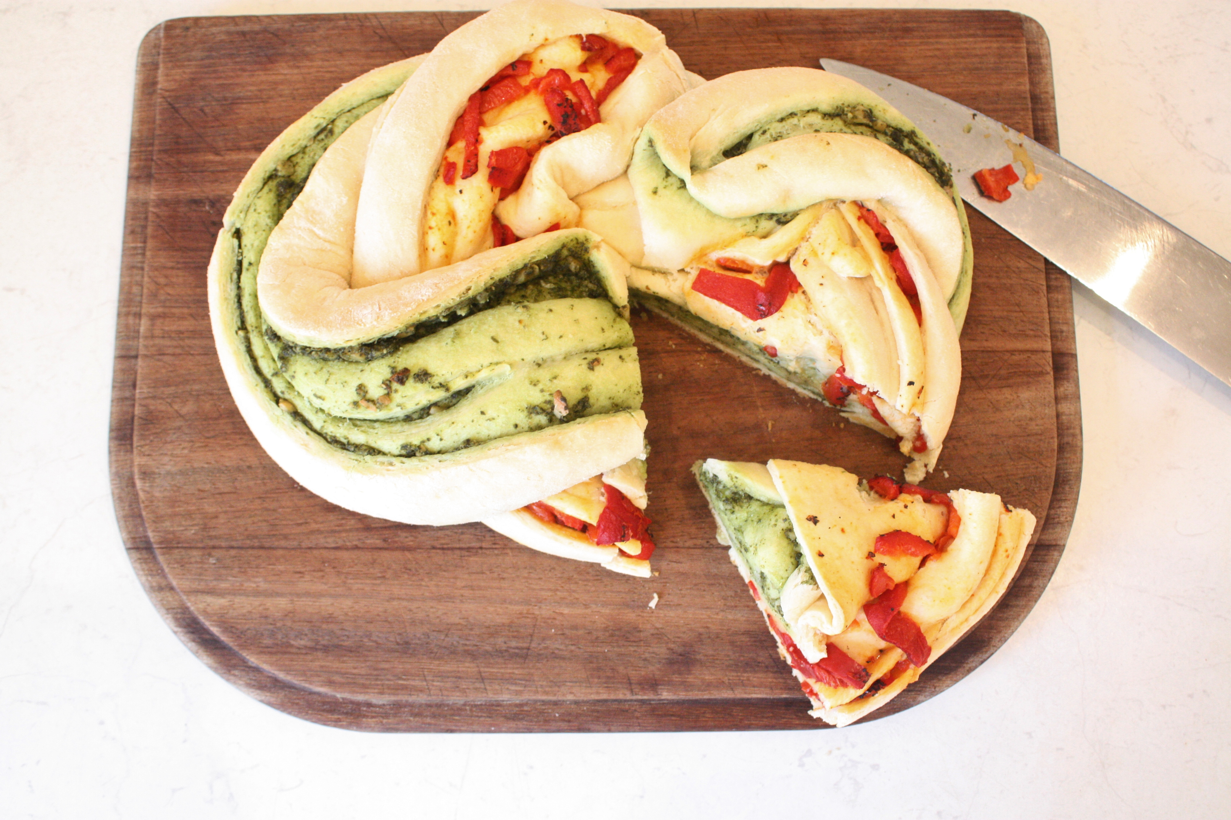 Preheat the oven to 180C. Lightly flour a surface and roll the dough out into a rectangle of about 30x40cm. Chop the rectangle in half lengthways. I found it easiest to do this using an old metal school ruler a knives tend to drag the dough unnecessarily. Spread one filling over one half of the dough an the other filling over the remaining half, then roll them (starting from one of the 40cm edges) into a sausage. When you have two sausages, slice halfway through the dough to expose the innards of the sausage (sorry for the kind of gross description, but it makes sense). Sidle the sausages up next to one another and plait them loosely, folding one over the other as best as possible. Don’t worry about being neat, the beauty of this bread is that it tastes delicious and looks good, regardless of your plaiting skills. Take each end of the plait and turn them in towards one another so that you get a pretzel-like shape.