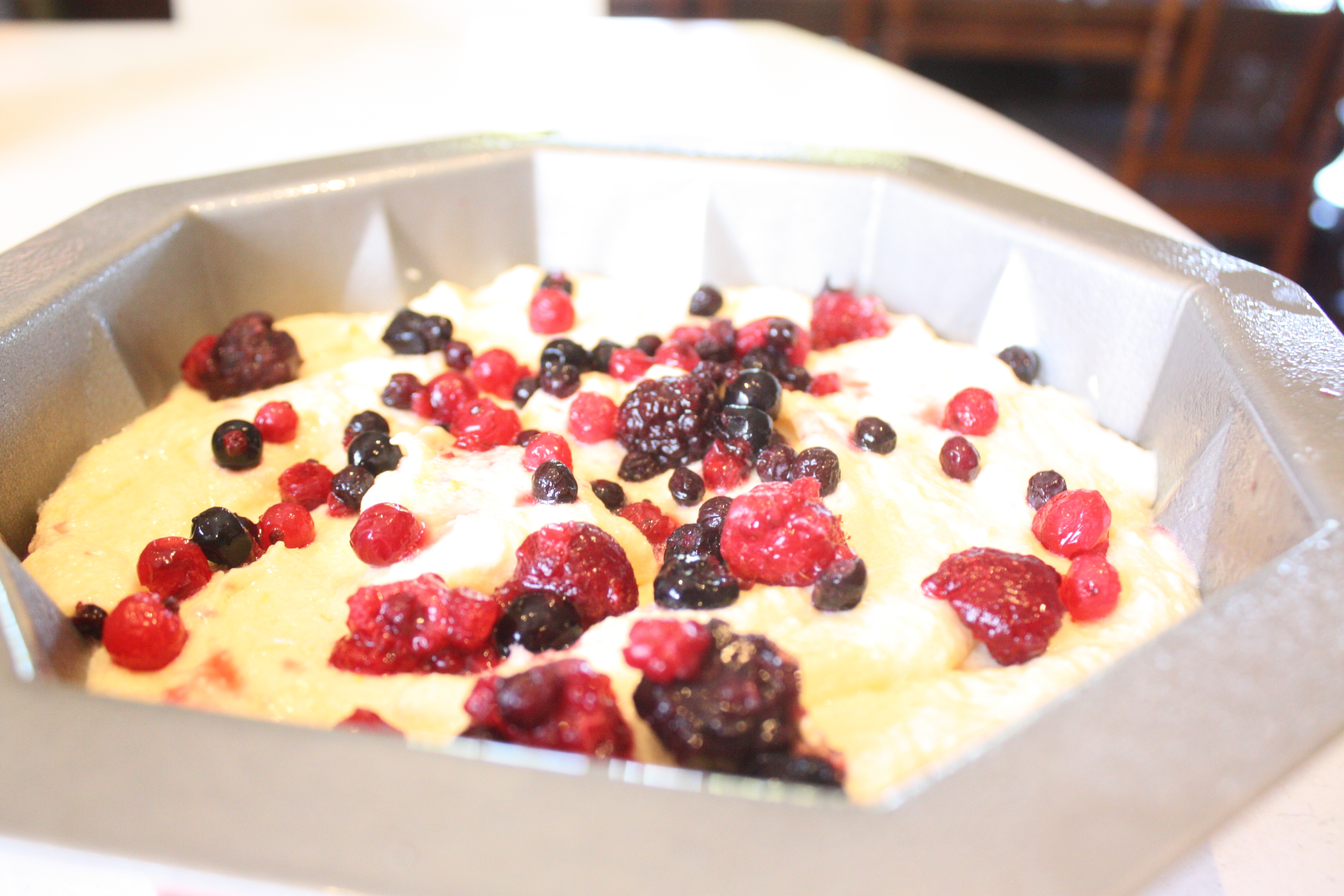 Pour the mixture into your greased tin and sprinkle the berries over the top of the cake. Press the berries down using your fingers or a skewer to varying depths within the batter. The batter is thick enough that the berries shouldn’t sink too much while the cake bakes. Bake for 40 minutes or until golden brown.