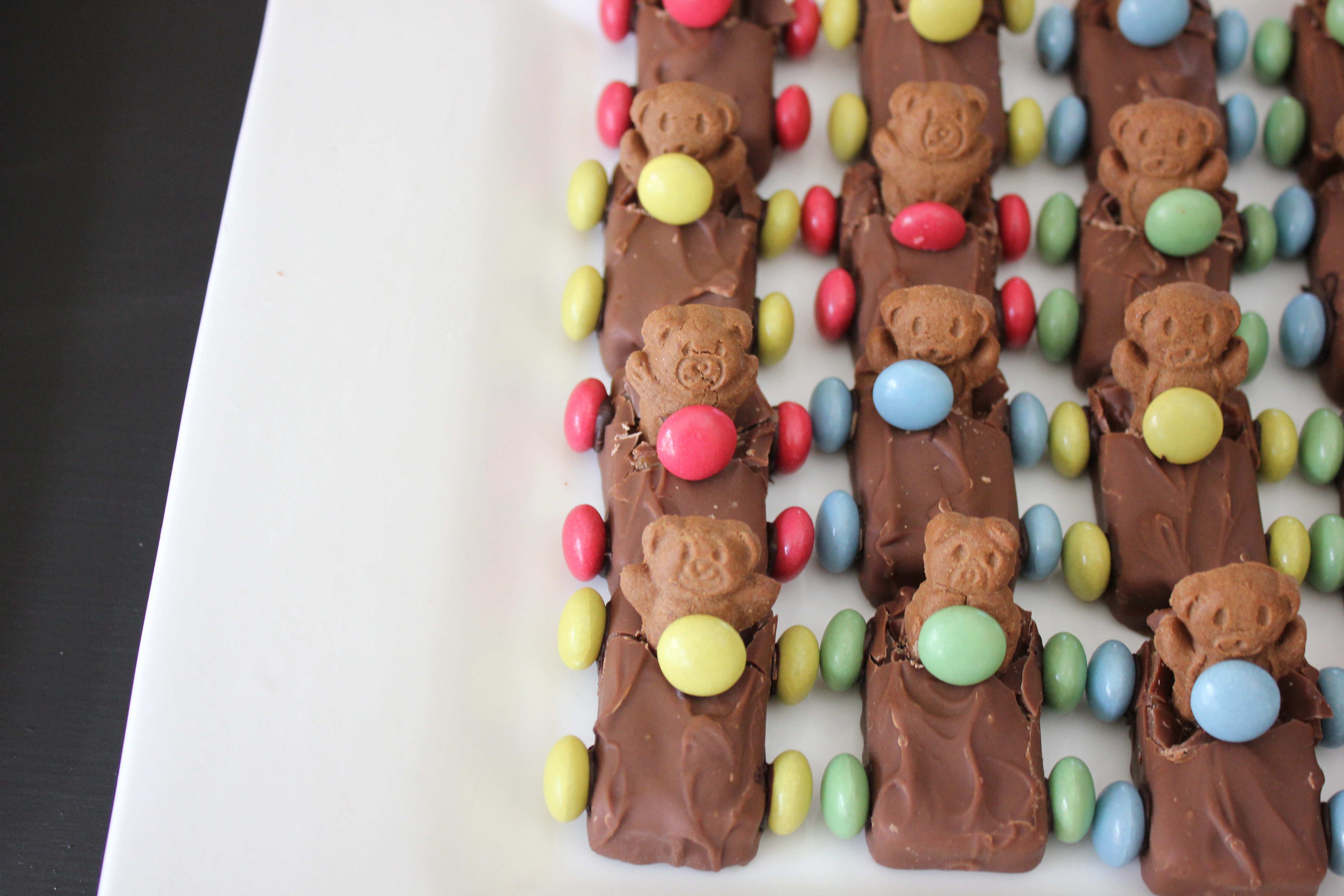I bought all of my ingredients at Aldi, and the ingredients I picked bear an uncanny resemblance to products most people would know as Mars bars, Tiny Teddies and Smarties. It doesn’t matter whether you use knock-offs or the branded ones, these teddy racers will still taste delicious.