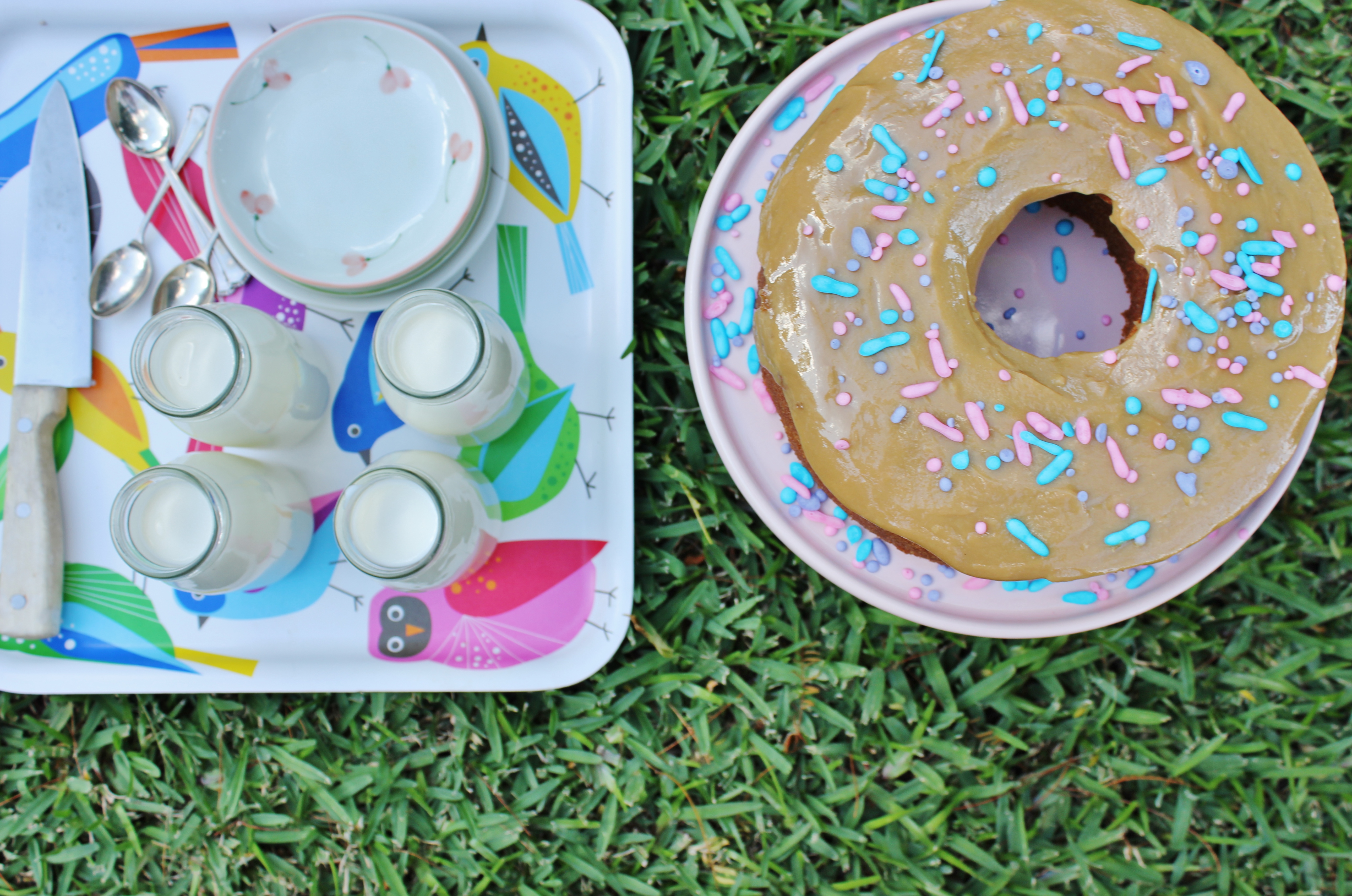 I tried making my own sprinkles yesterday (and Instagrammed it, as I do everything – check them out here), so I put them to good use on my caramel doughnut cake.