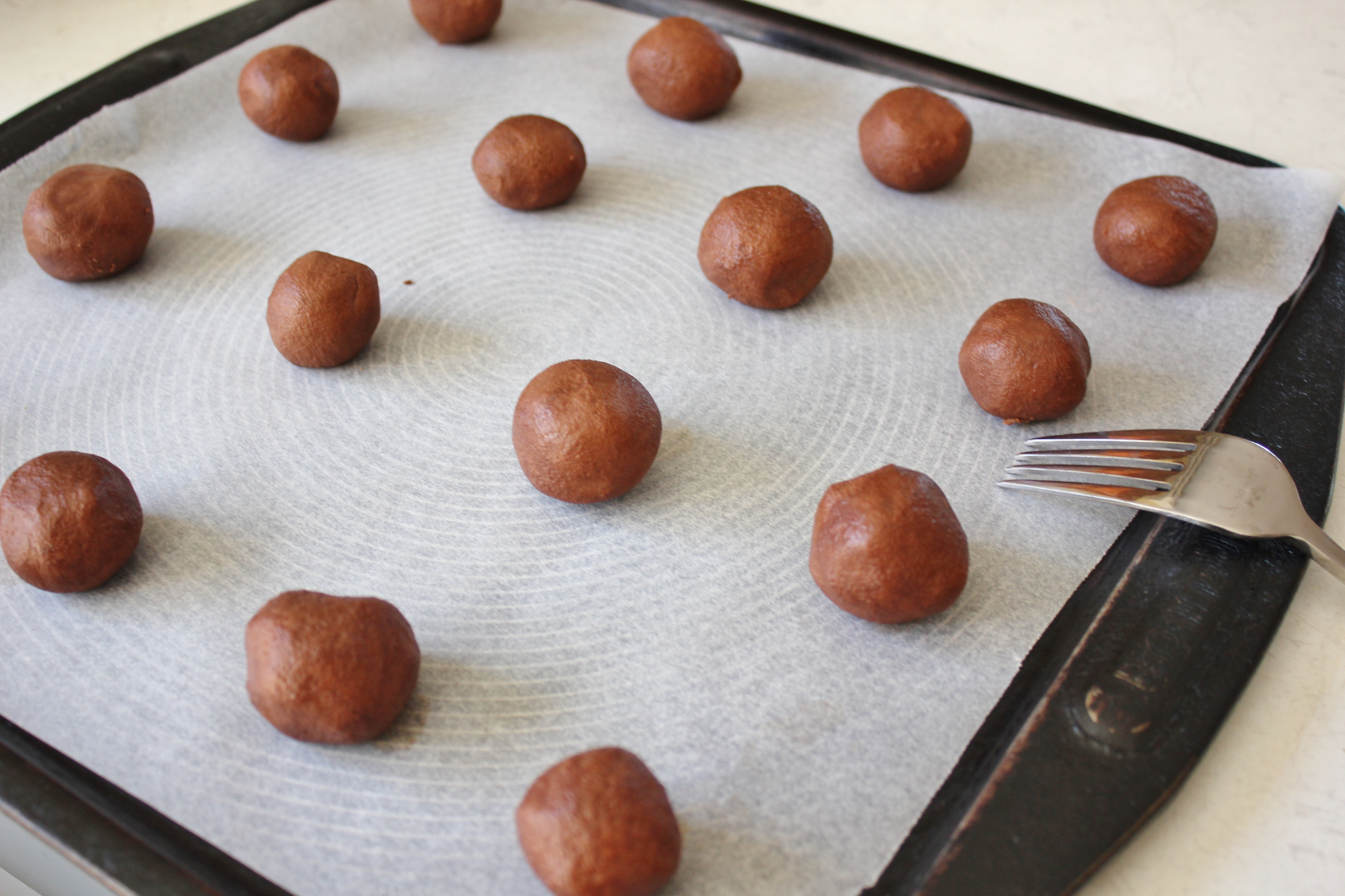 forkWhen you have a tray full of soft doughy spheres, grab a fork and use it to lightly flatten them, pressing a pattern into them as you go. To avoid messing up the pattern or the smooth dough, pressed the fork down and then slowly pull it back towards yourself.