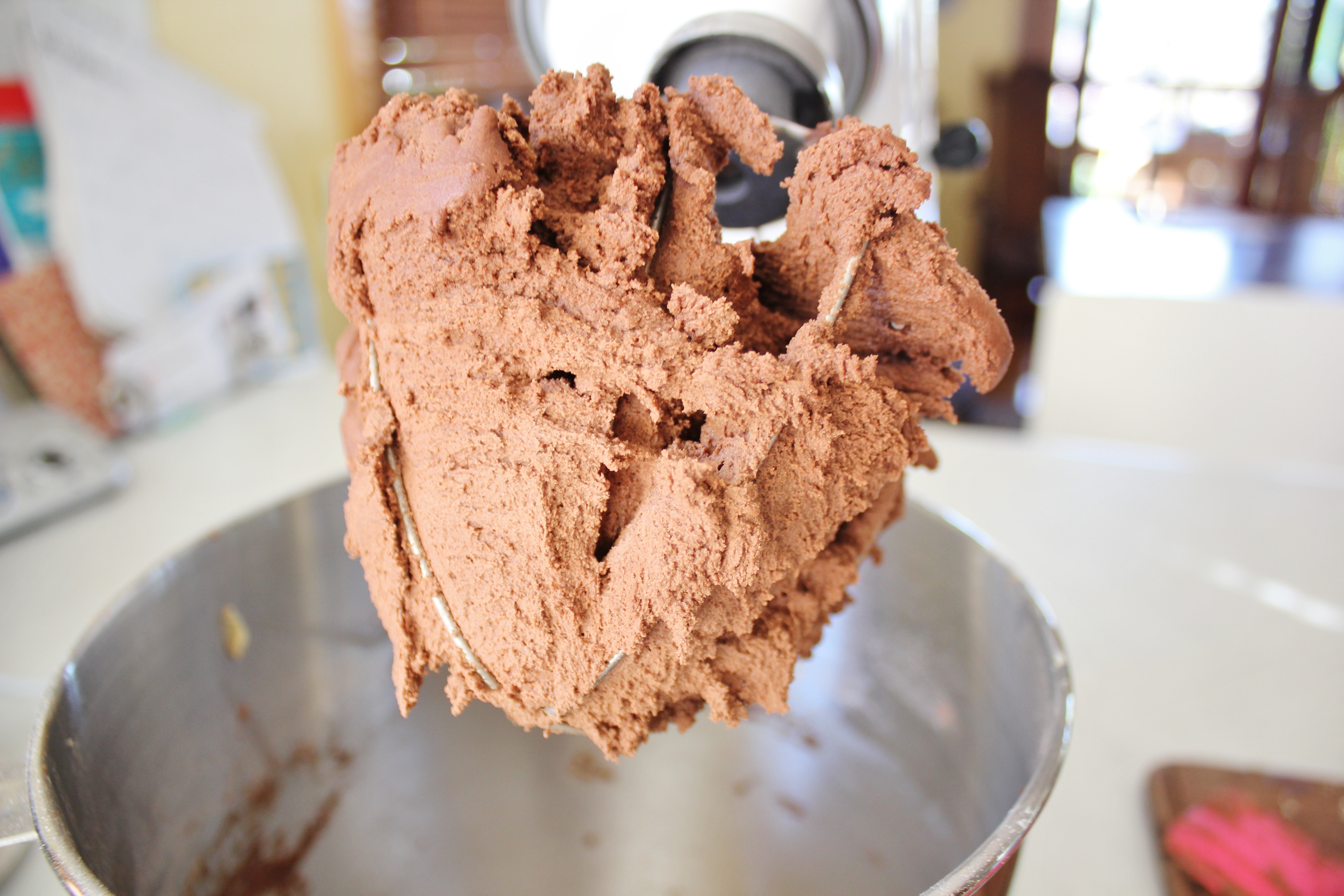 Add the cocoa, plain flour and cornstarch into the butter mixture and mix until you get a soft dough. It kind of looks like mousse, it’s light and smooth and delicious (seriously, this mixture is addictive.)