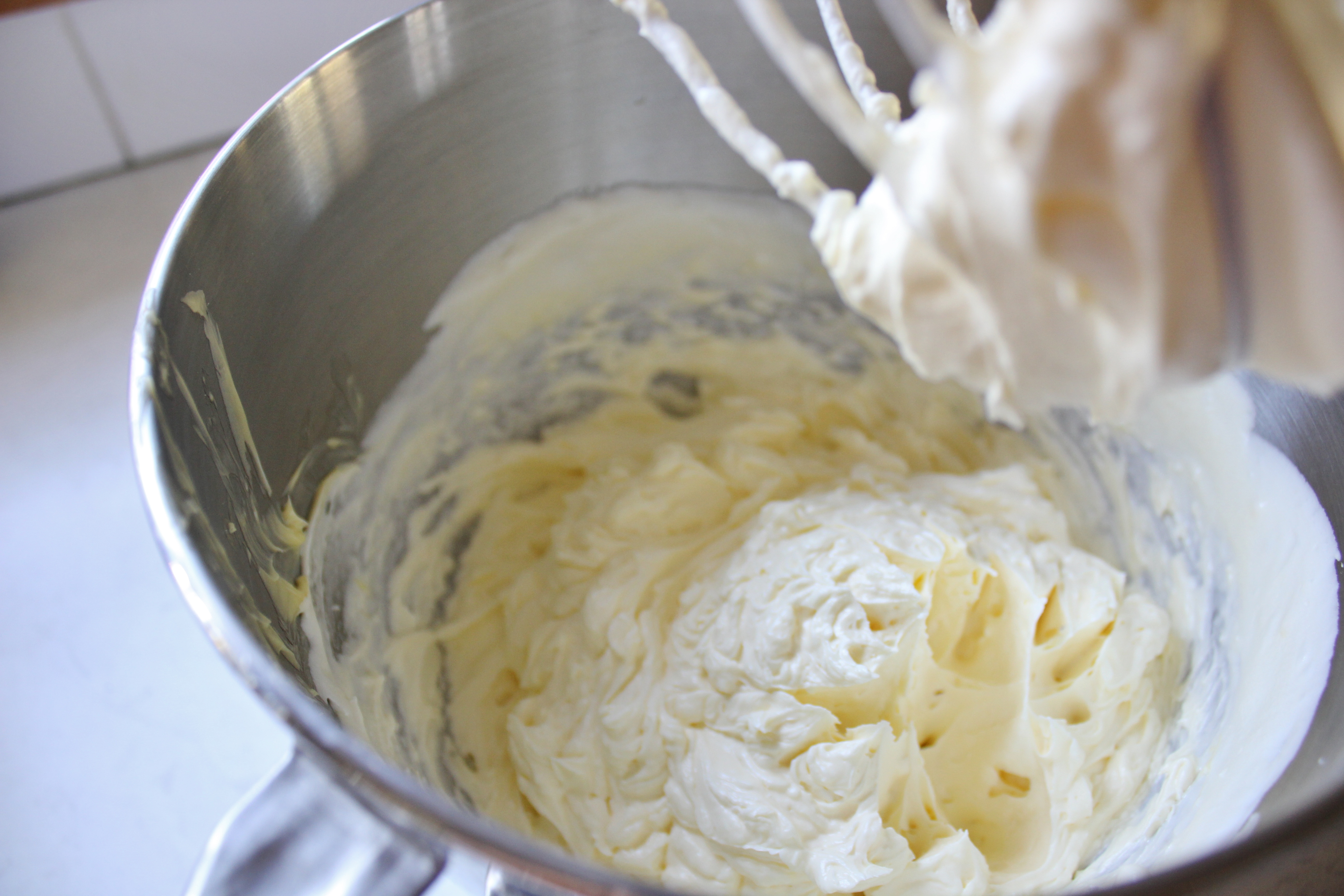 If you’ve got a stand mixer, switch to the flat beater. This part of the process requires you to mix slowly, so be patient. Cube your butter and add it to the mixture a few cubes at a time, mixing after each addition. By the time you’ve added all of the butter cubes you’ll probably be stressing out. The mixture will have deflated, it will look like lumpy milk and you’ll think that I’ve misguided you – but I’ve not, I promise!