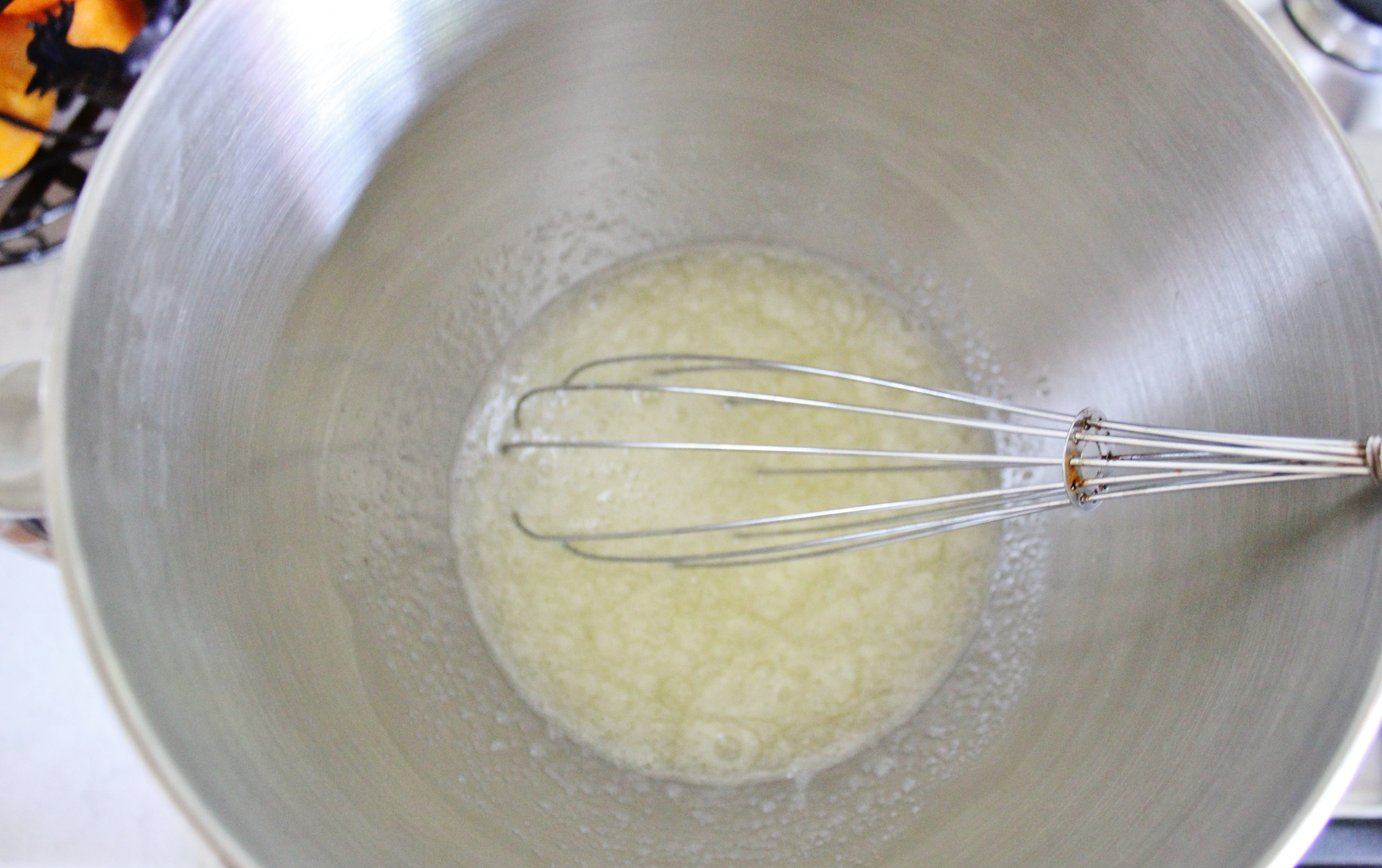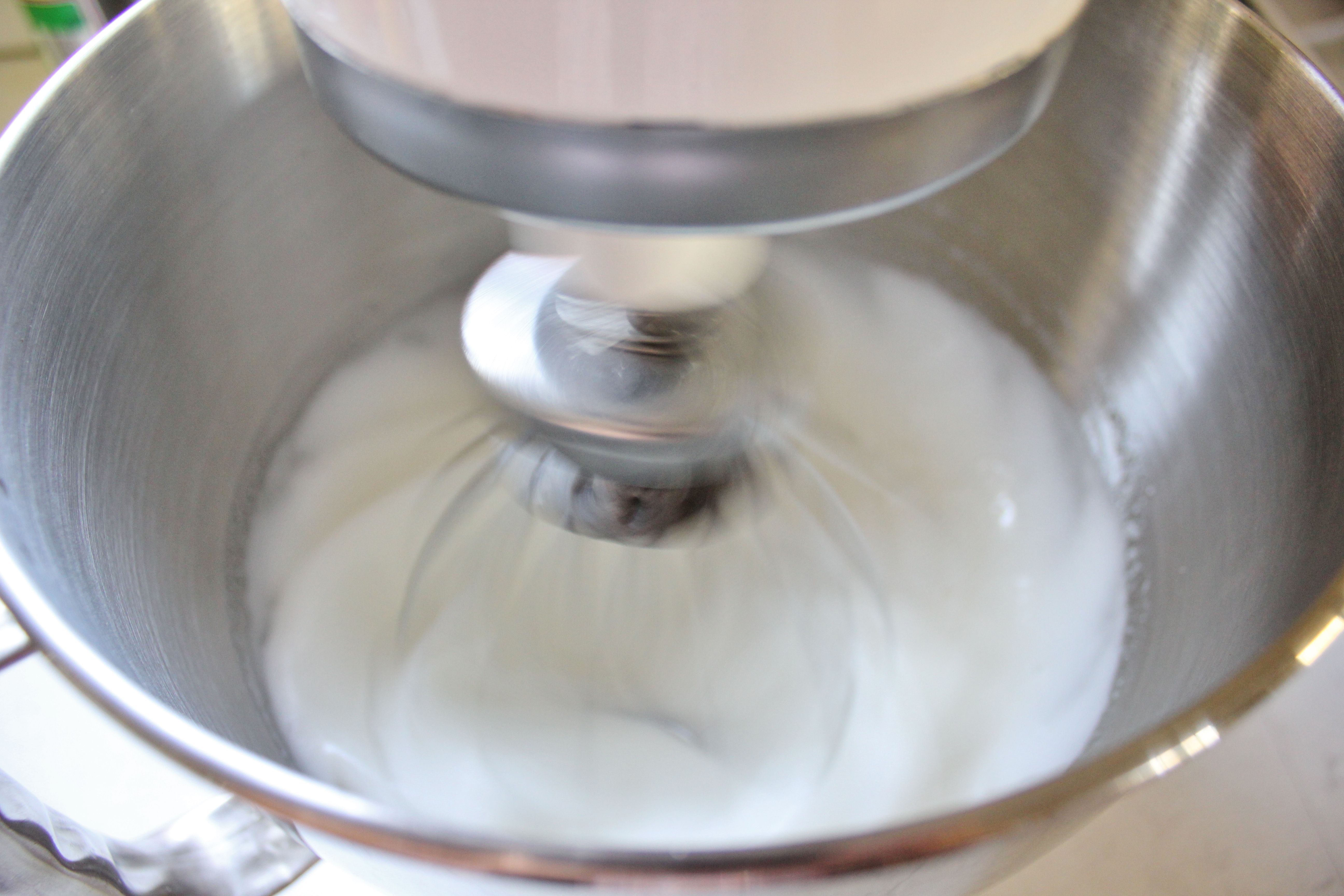 Separate the egg whites and yolks from one another. You only want the whites in your super clean bowl. Set up a pan of water on the stove and bring it to a boil. Pop your bowl over the top of it (making sure that he bowl doesn’t touch the water) and gently stir the sugar into the egg whites. Keep stirring until all the sugar has dissolved (should take about 5 minutes) and you start to smell the egg white cooking. DON’T allow it to cook, you don’t want a weird egg whitey omelette!