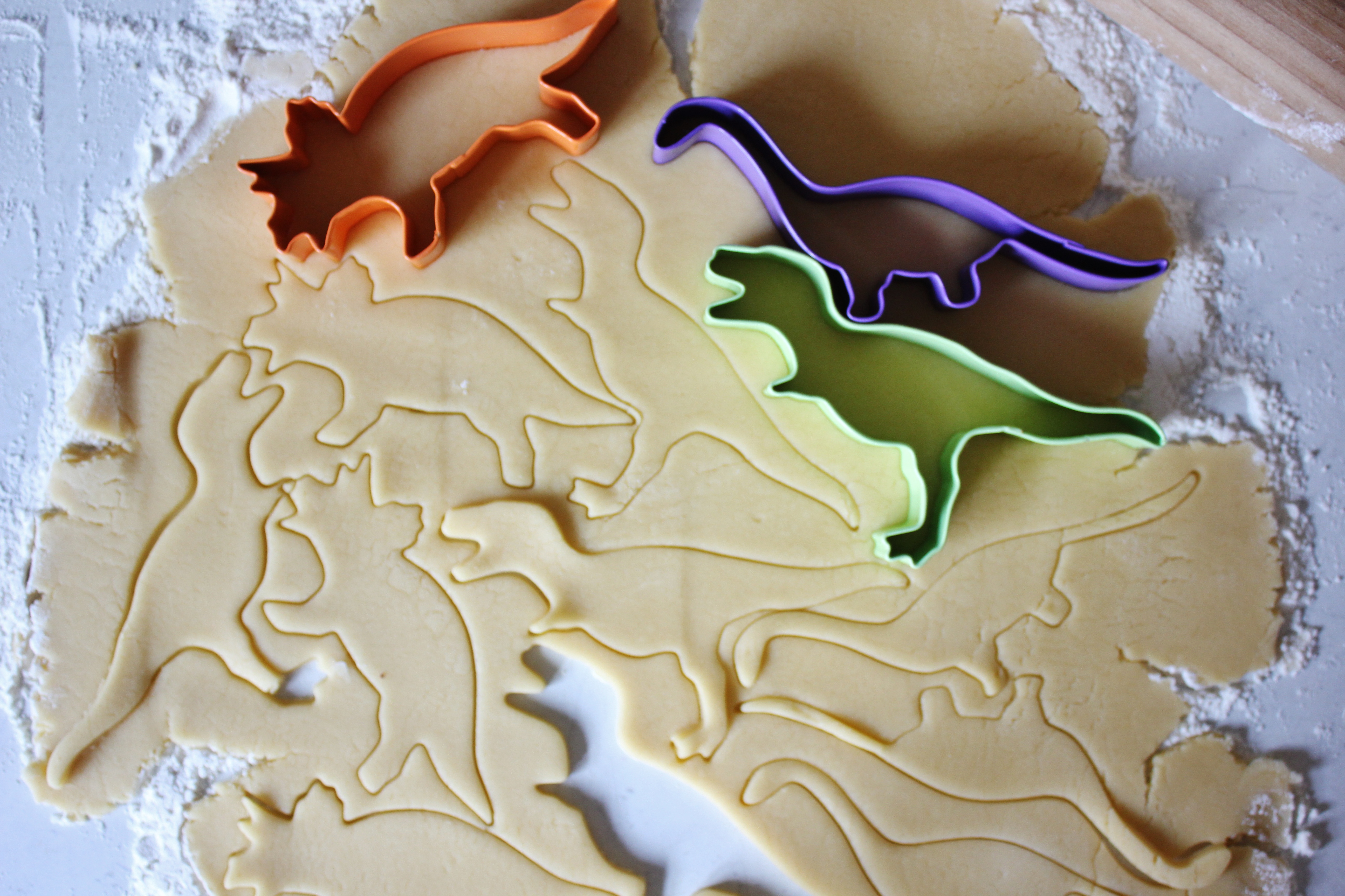 I kept these biscuits quite thin because I figure that kids (and adults!) are going to be eating enough sweets around Halloween, and you don’t want them to overdo it on the sugar! You can roll this mixture out to whatever thickness you want, it holds its shape well. If you don’t have dinosaur biscuit cutters, use whatever shapes you have. Make spooky ginger bread men, or use a tumbler to cut out circles and decorate them like eyeballs.