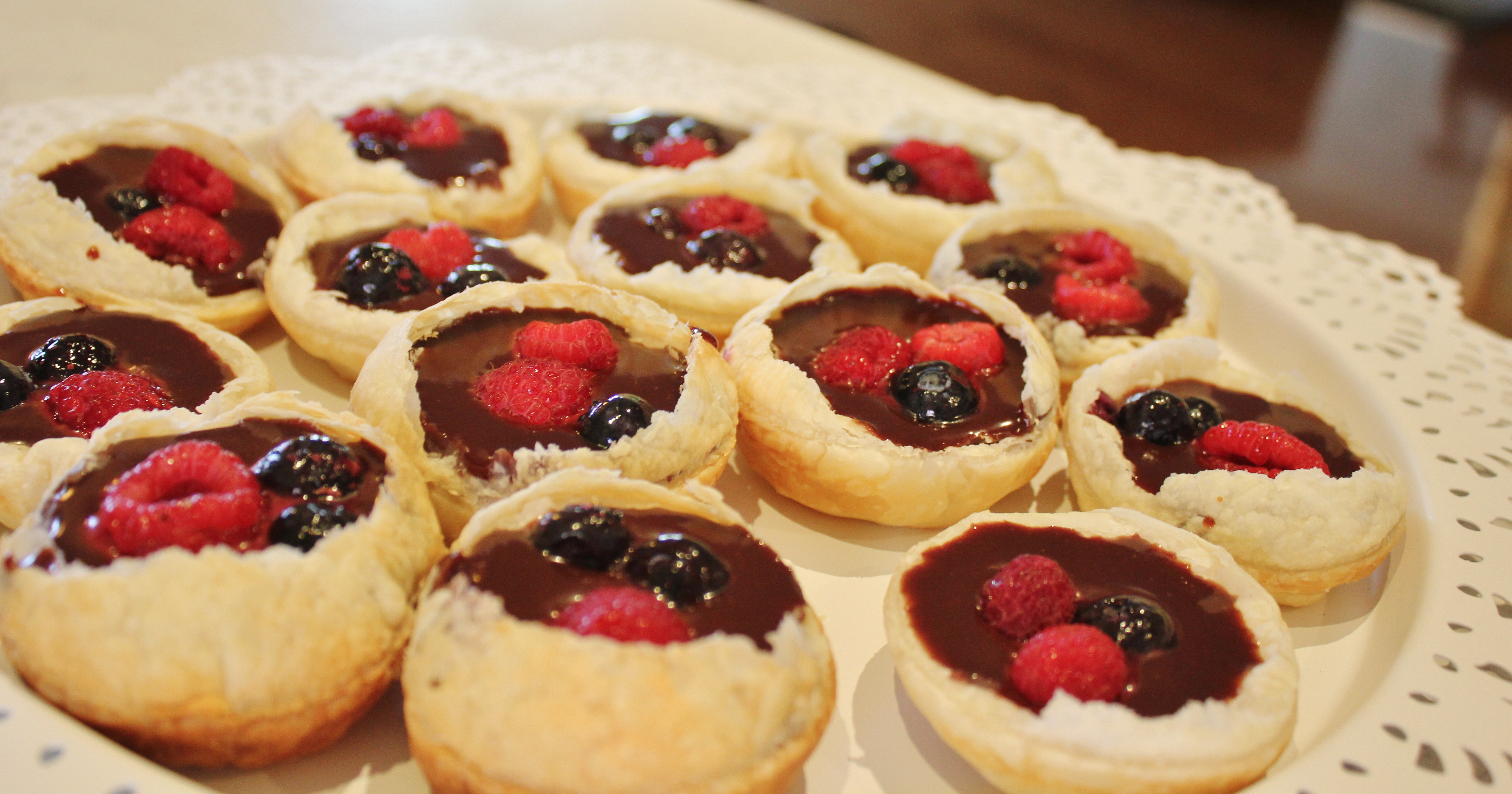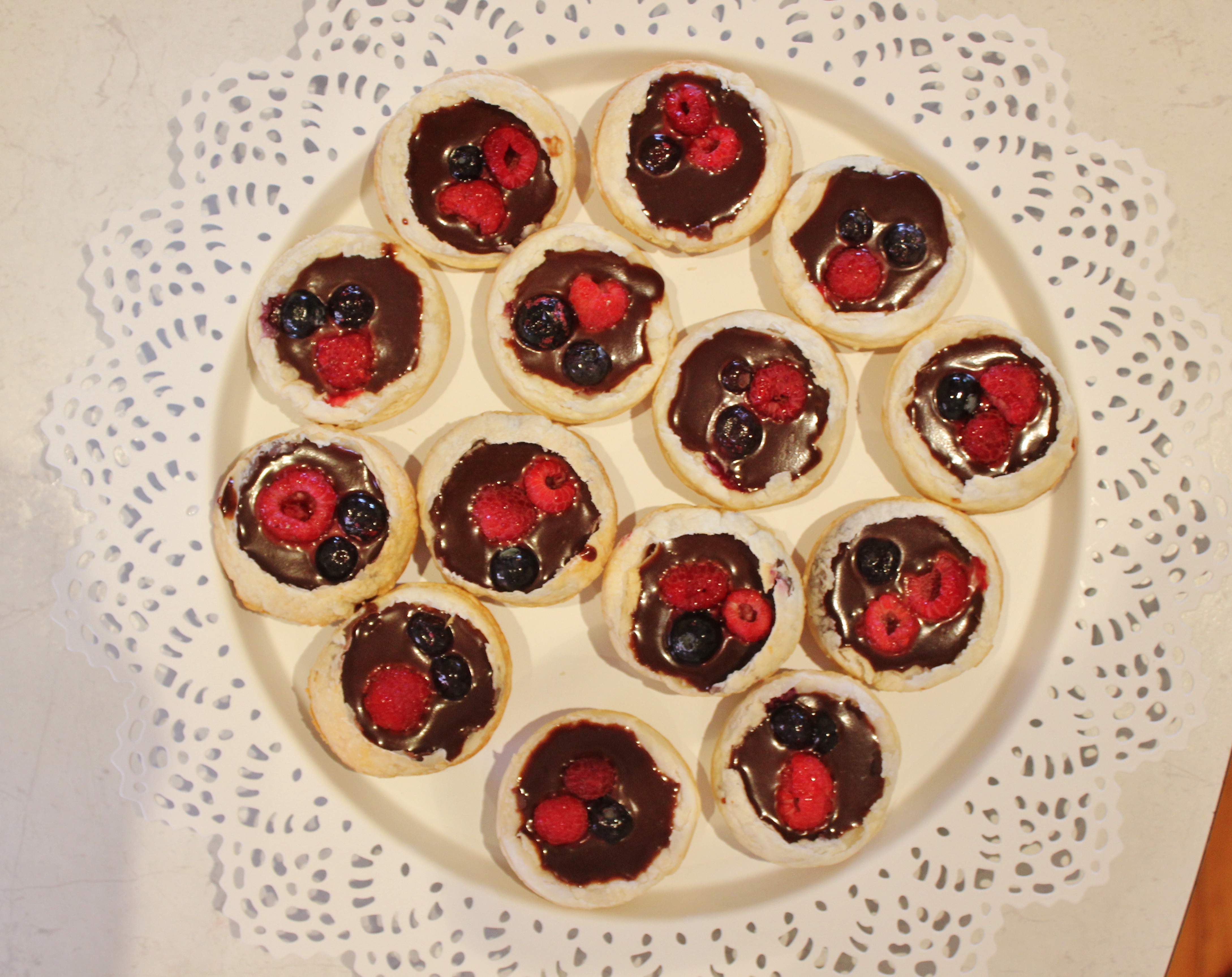 Transfer your pastry rounds onto whatever plate you’ll serve them from and start filling them with the chocolate mixture. Fill them up to just below the brim, leaving some room for the berries. You’ll probably have a little bit of chocolate mixture left over – pop it in the fridge and use it later as warmed up chocolate sauce on ice cream, or eat it straight from the fridge like fudge.