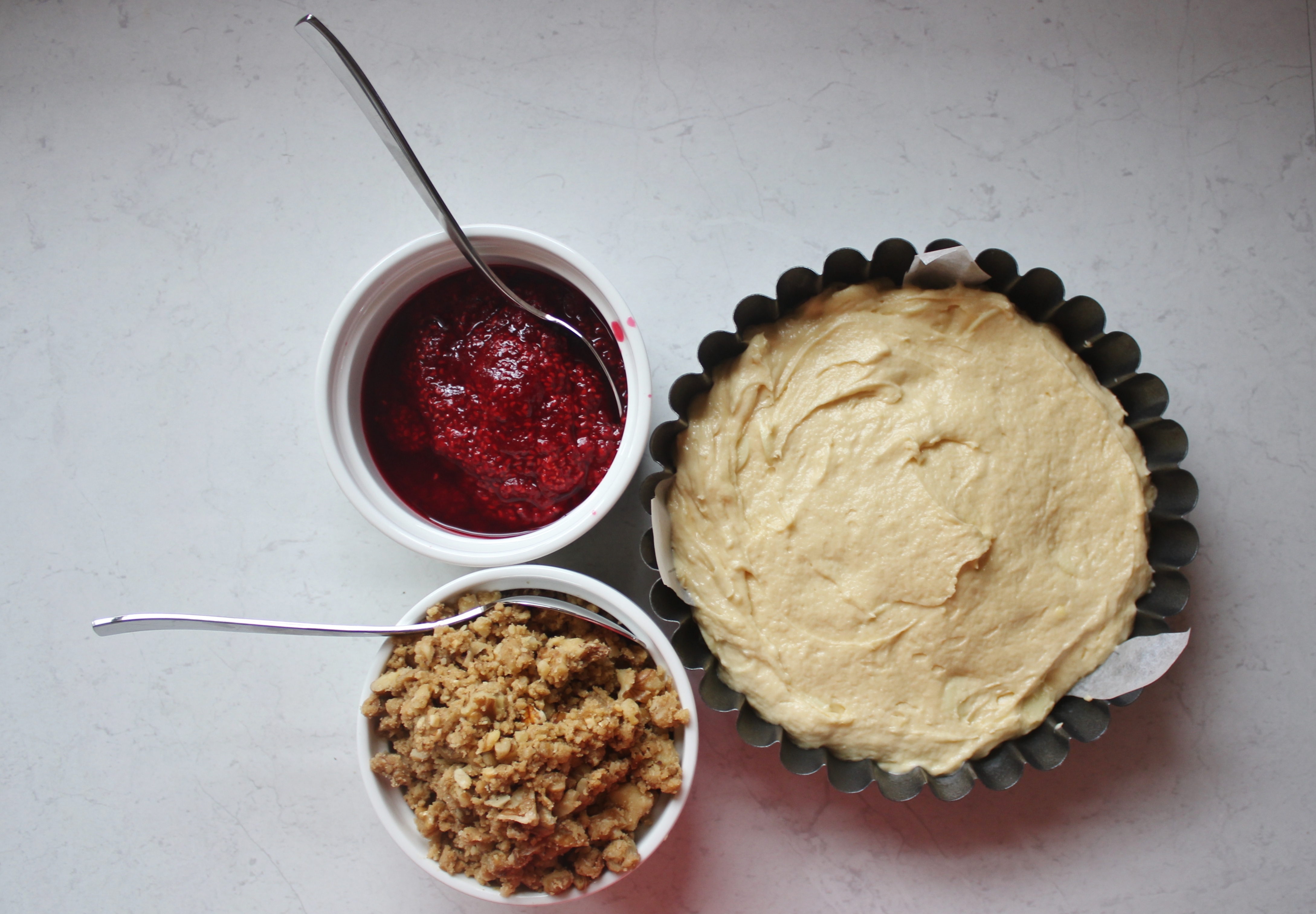 Spread the cake mixture evenly around the flan base, then top with the mushy raspberry left over from earlier. Spread the raspberry almost to the edge of the tin, leaving a tiny gap.