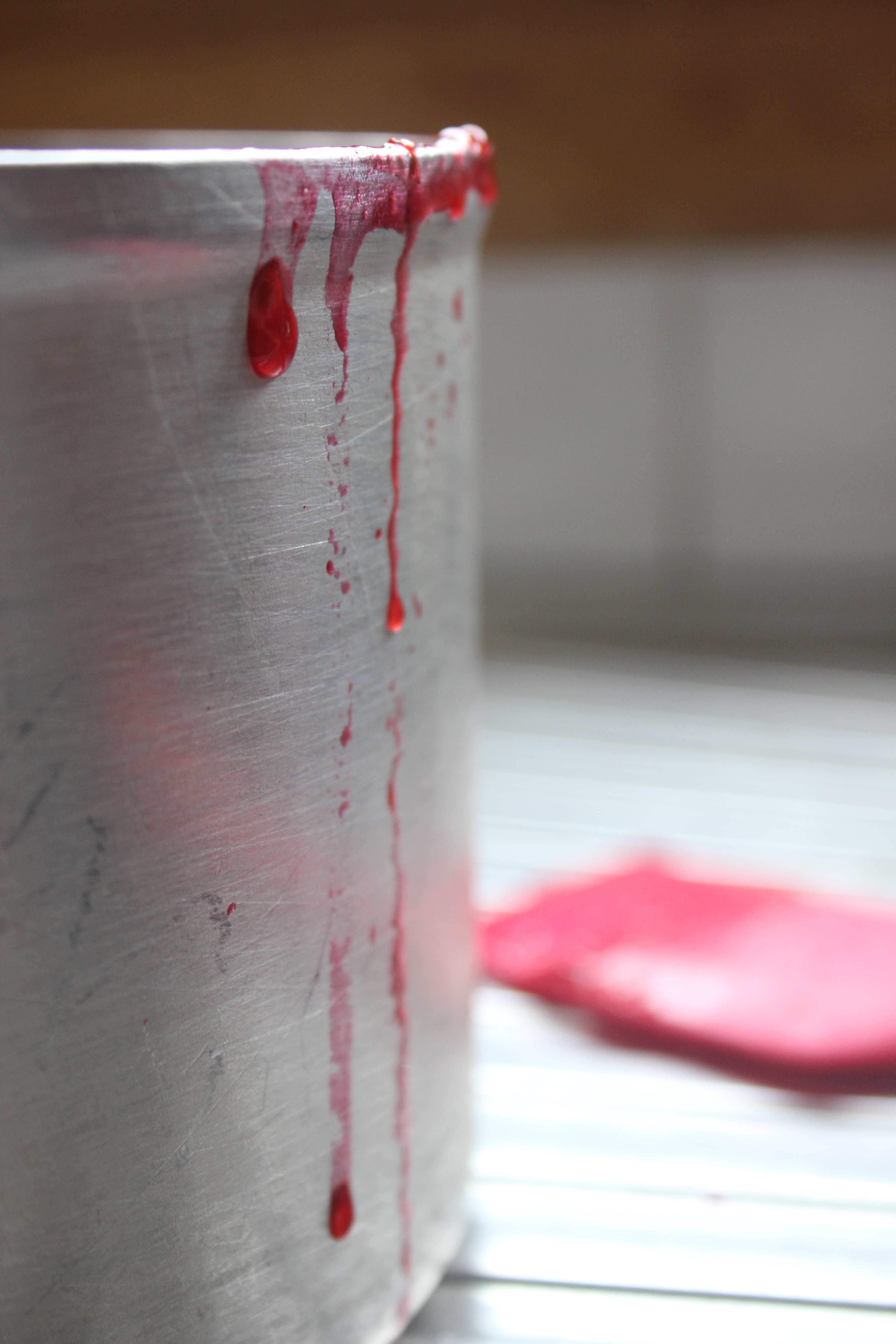 Take the raspberry mixture off the heat and strain the syrup off from the squashy bits. You want both parts of the raspberry mixture, but you need the liquid and solids separate. Put your syrup into a gravy boat or pouring receptacle of some description and put it in the fridge. The syrup not only smells delightful, but it’s a vivid pink colour as well. Put the remaining raspberries in a bowl and set them to one side to cool.