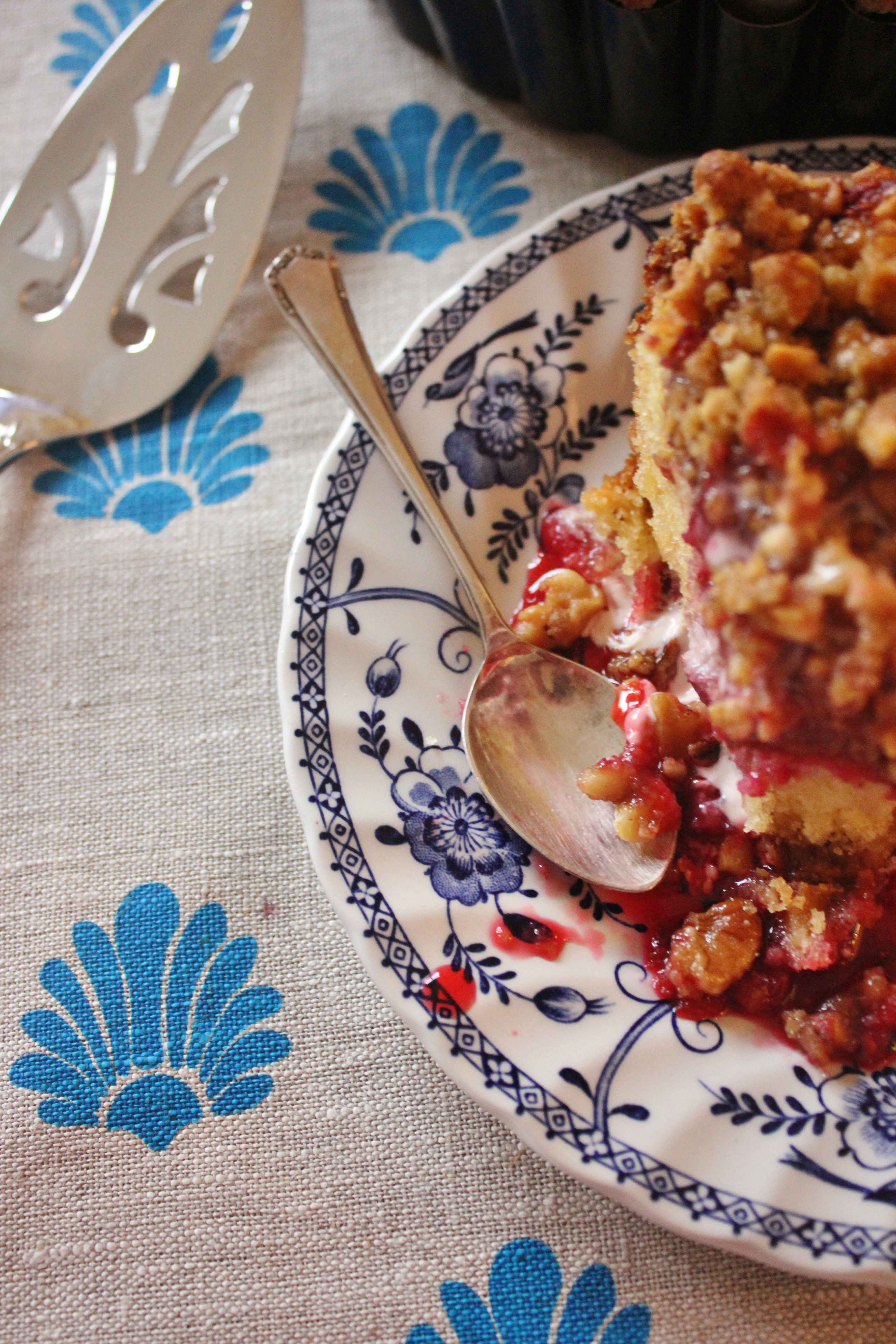 I think it’s fairly obvious that I’m in love with this crumbly cake, this cakey crumble. I’m also slightly in love with the art deco tea towel used in this shoot, it’s made of natural linen and is part of a range of beautiful linen made by AquaDoorDesigns.