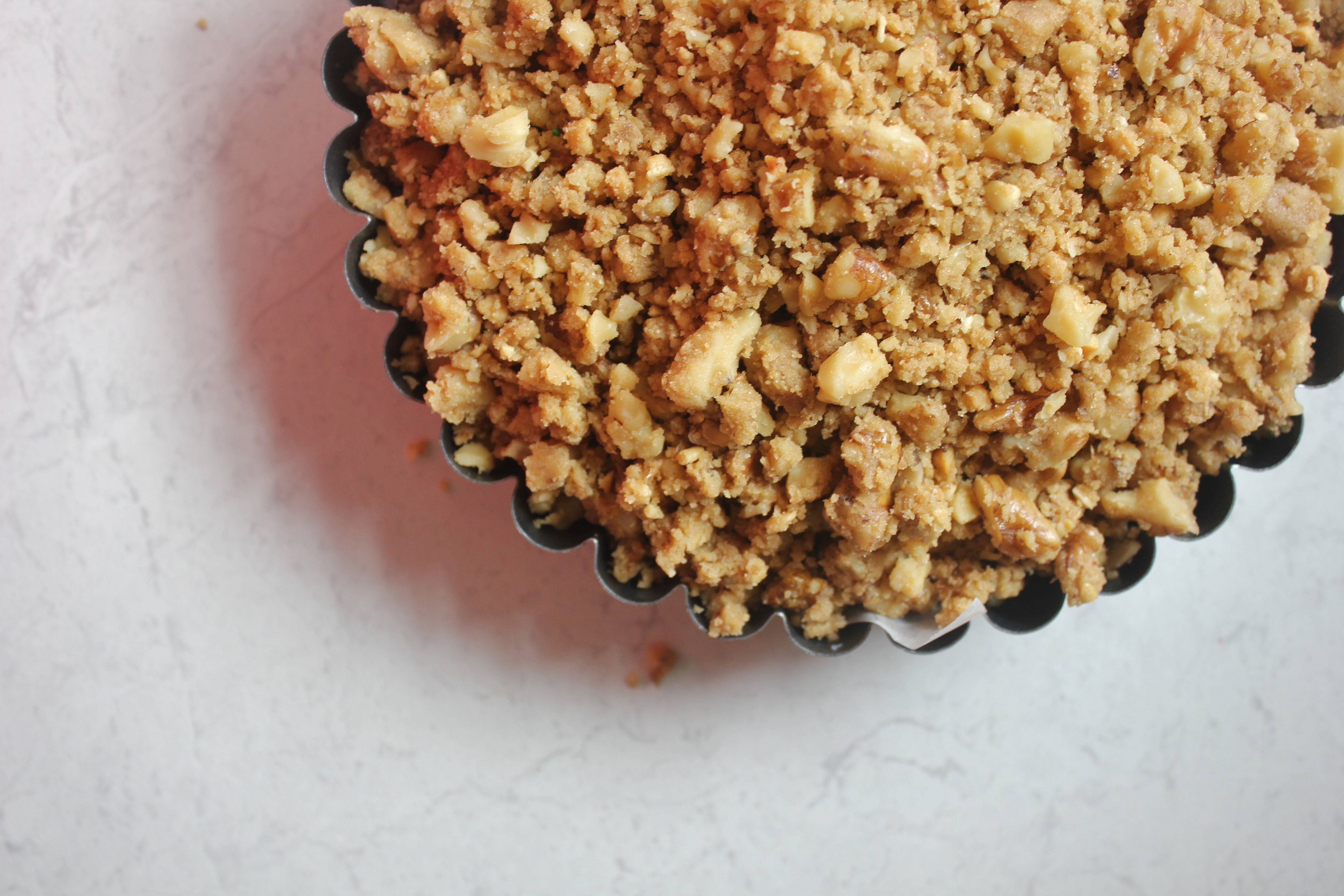 Rub together the flour and butter and brown sugar so that you have a mixture that resembles breadcrumbs. Roughly chop your walnuts, ensuring that you have a nice mixture of chunky and little, itty-bitty pieces and throw them into the mixture as well. Give it a good mix and set to one side.