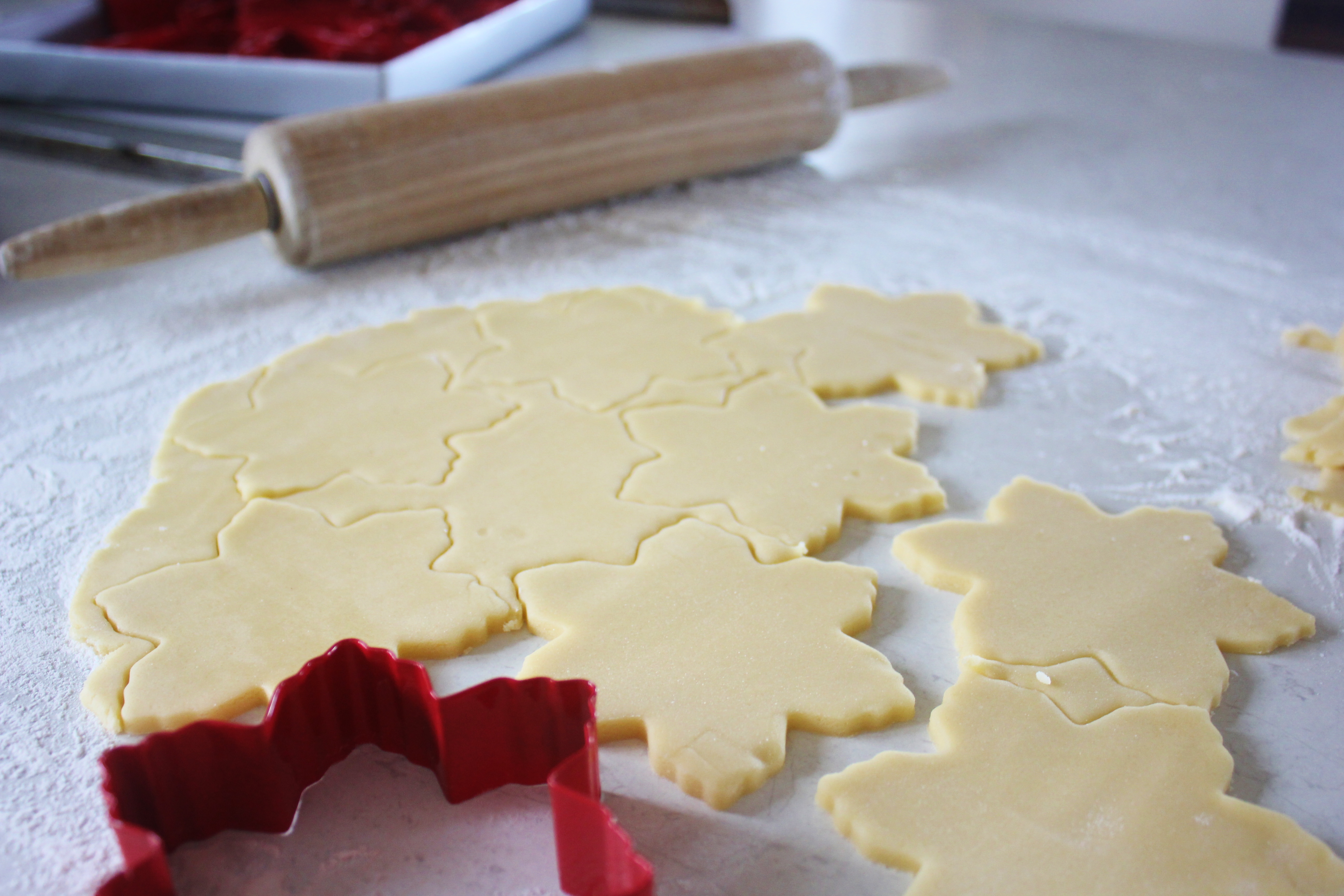 Lightly flour a clean surface and roll out your chilled dough to your desired thickness (I made my biscuits about 5mm thick, but they can be thicker) and use your Christmas cookie cutter to cut as many shapes out of the dough as possible. Line your baking trays with biscuits, re-roll the dough and repeat.