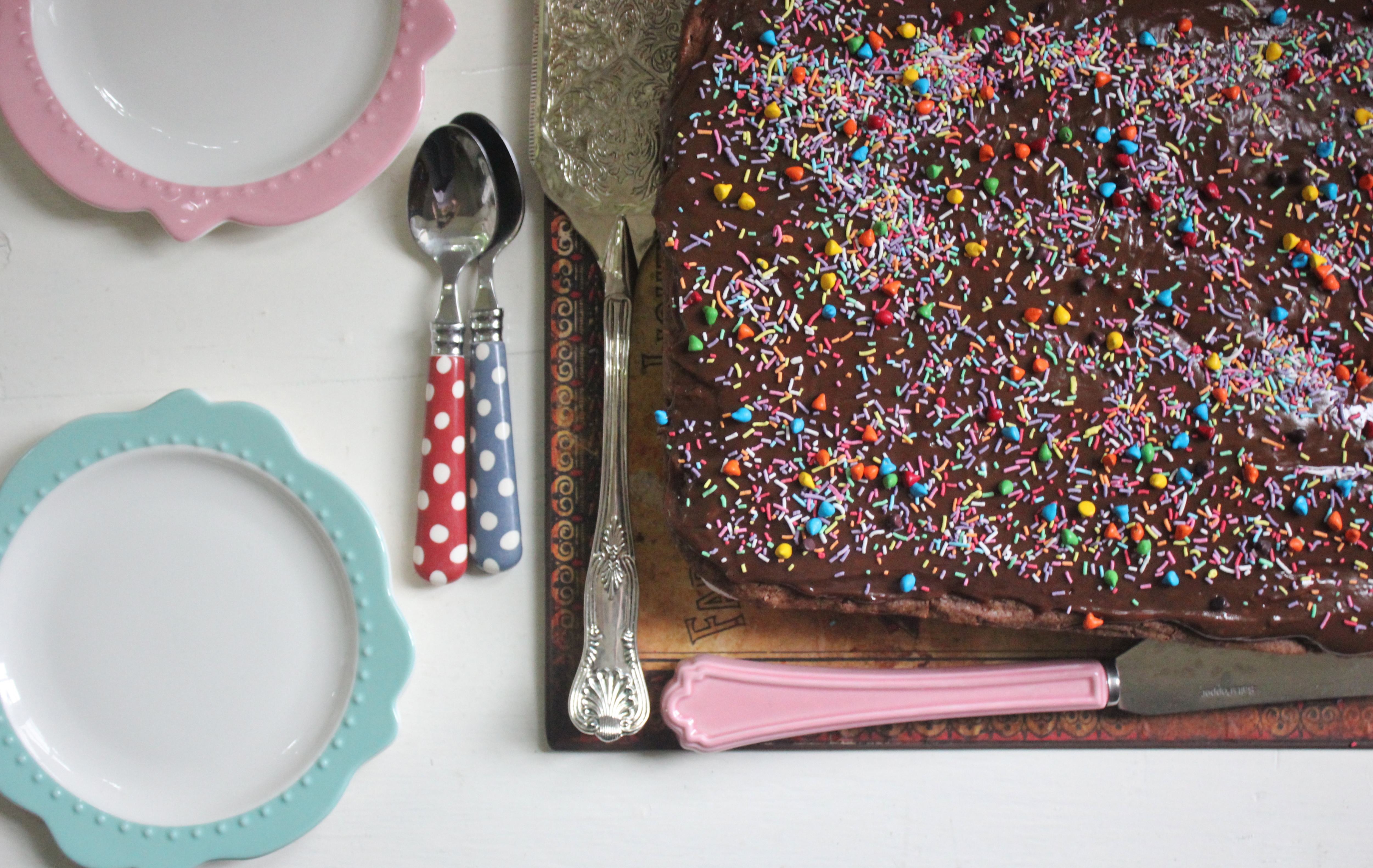 The chocolate cake, once cooked, is perfect for large gatherings; children’s birthday parties, big family functions, picnics, etc. If you were to ice this cake and decorate it, it would be perfectly palatable. It’s moist and chocolatey and just sweet enough.