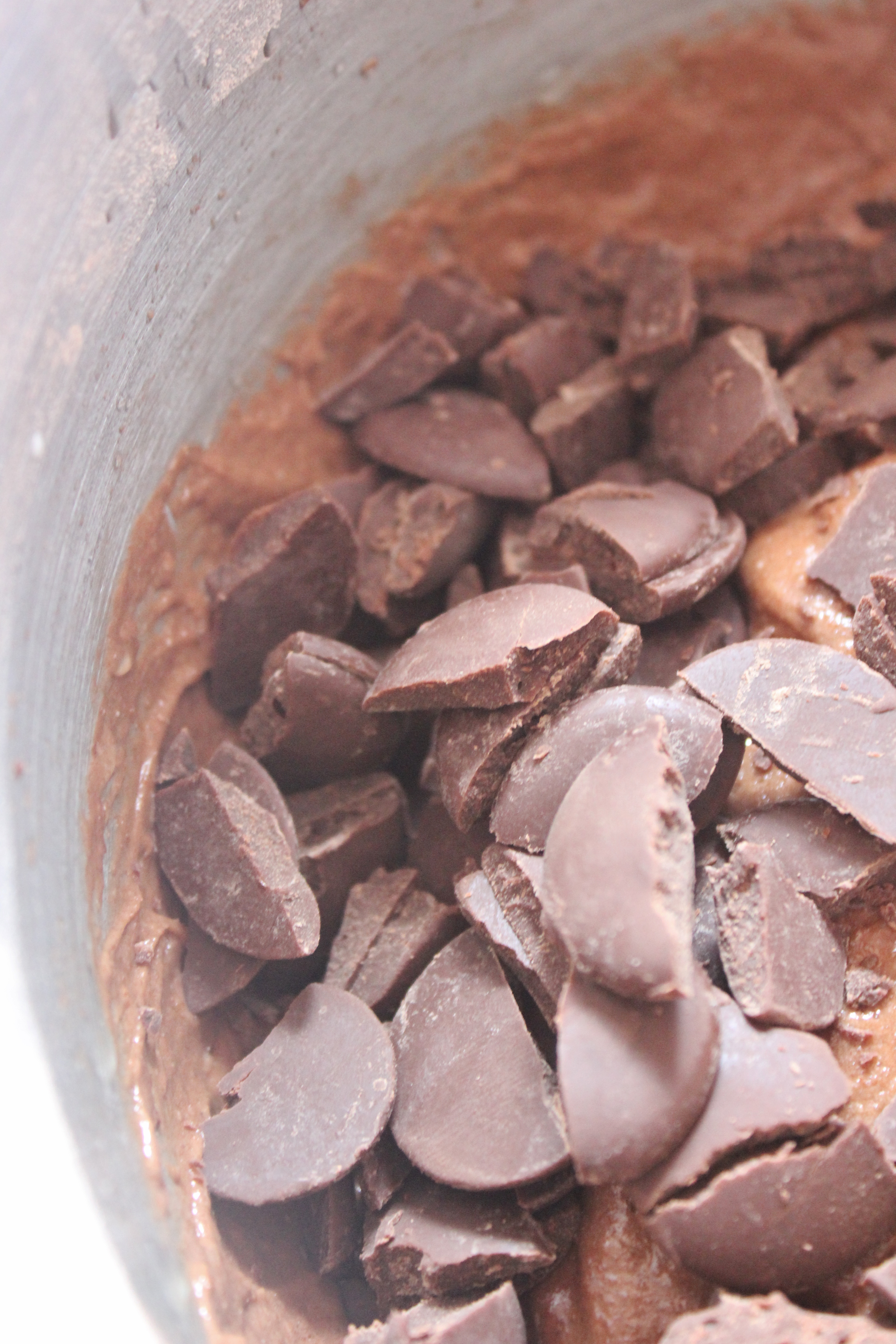 Add in the milk and canola oil gradually – if you add them in too fast you’ll find it harder to mix because there will be too much liquid too quickly. Once the mixture is shiny and consistent, pop the chocolate chips in as well.