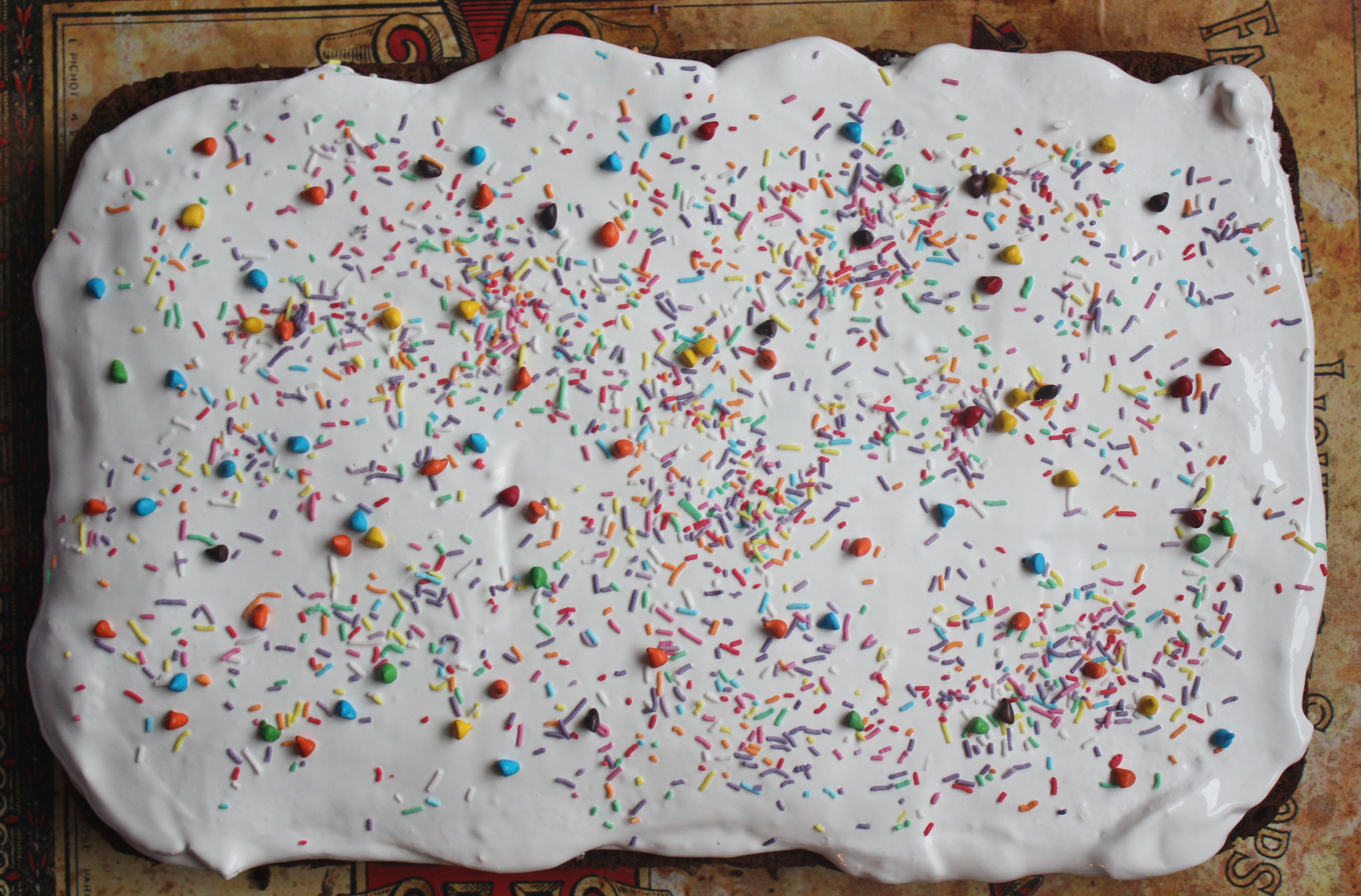 If you’re not satisfied with a plain, lovely, chocolatey sheet cake, whip out your corn syrup, sugar, vanilla and egg whites. This is about to get ten times more delicious.