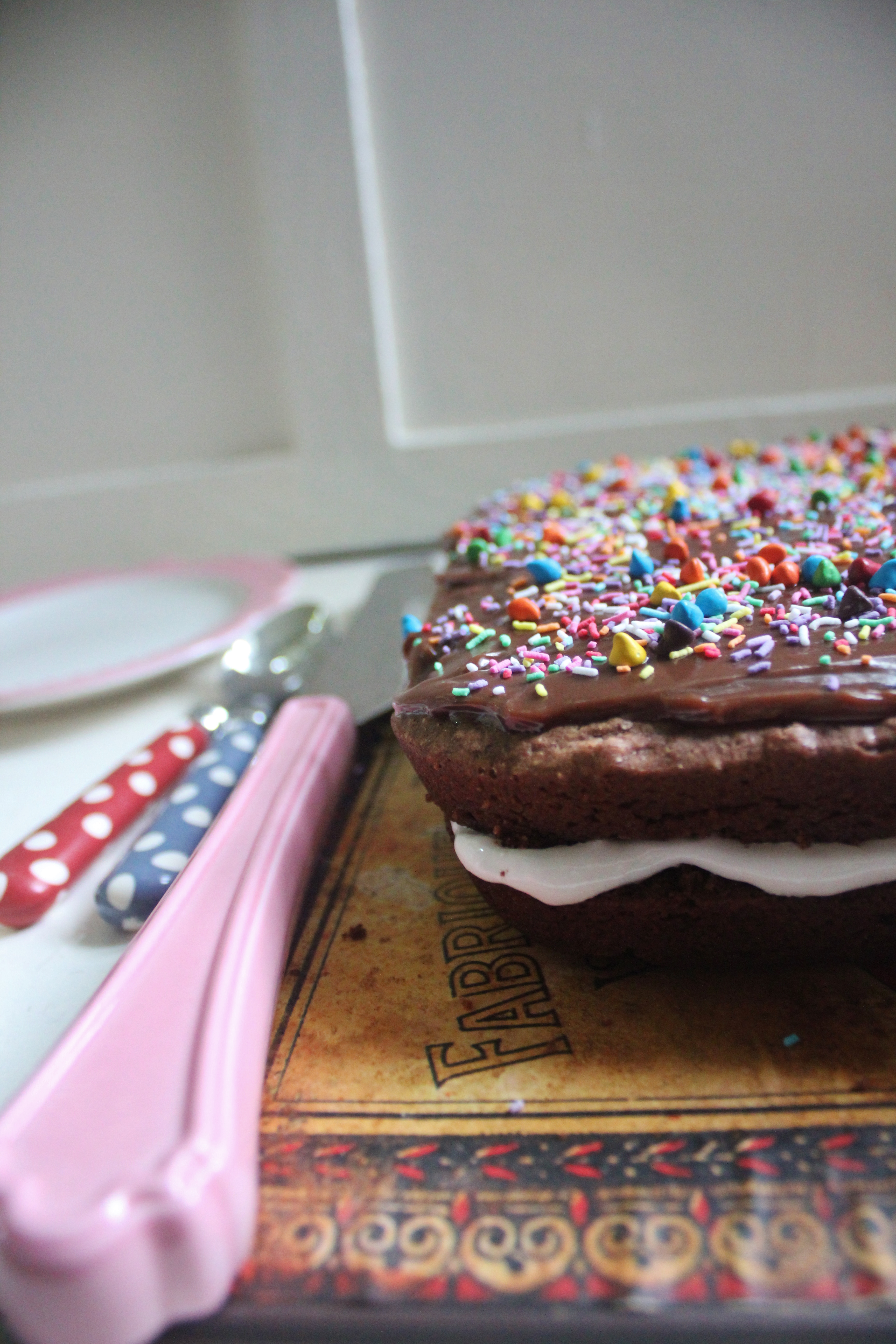 firstYou can use all of the marshmallow fluff on this cake, but I reserved 1 ½ cups of it to use at a later date, it keeps for a week. Top the marshmallow with sprinkles or choc chips of your choosing, then flip the top of the cake onto this layer to sandwich the marshmallow between two slices of cake.