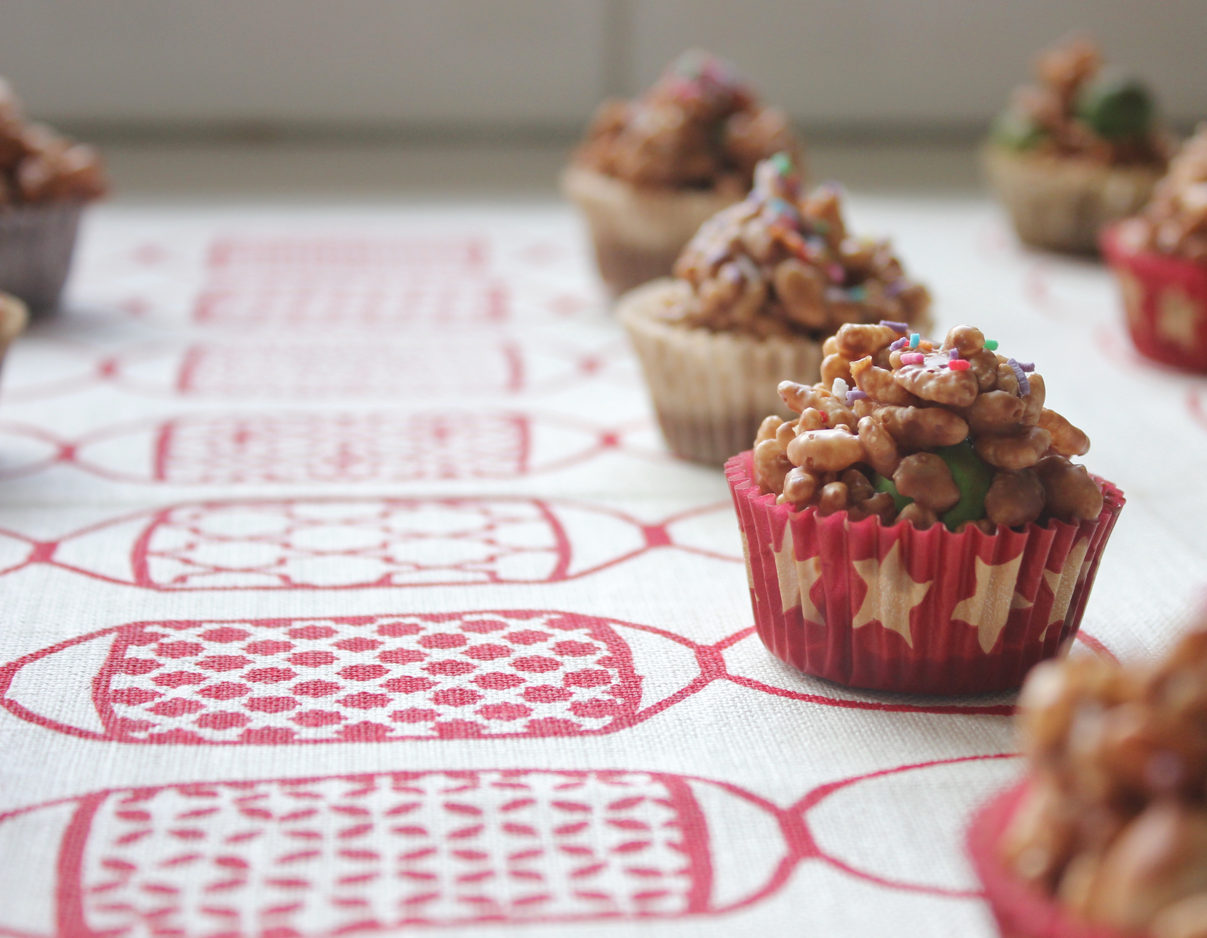 Scoop a tablespoon of mixture into each cupcake pan and press down lightly with the spoon. Top with sprinkles, if desired.