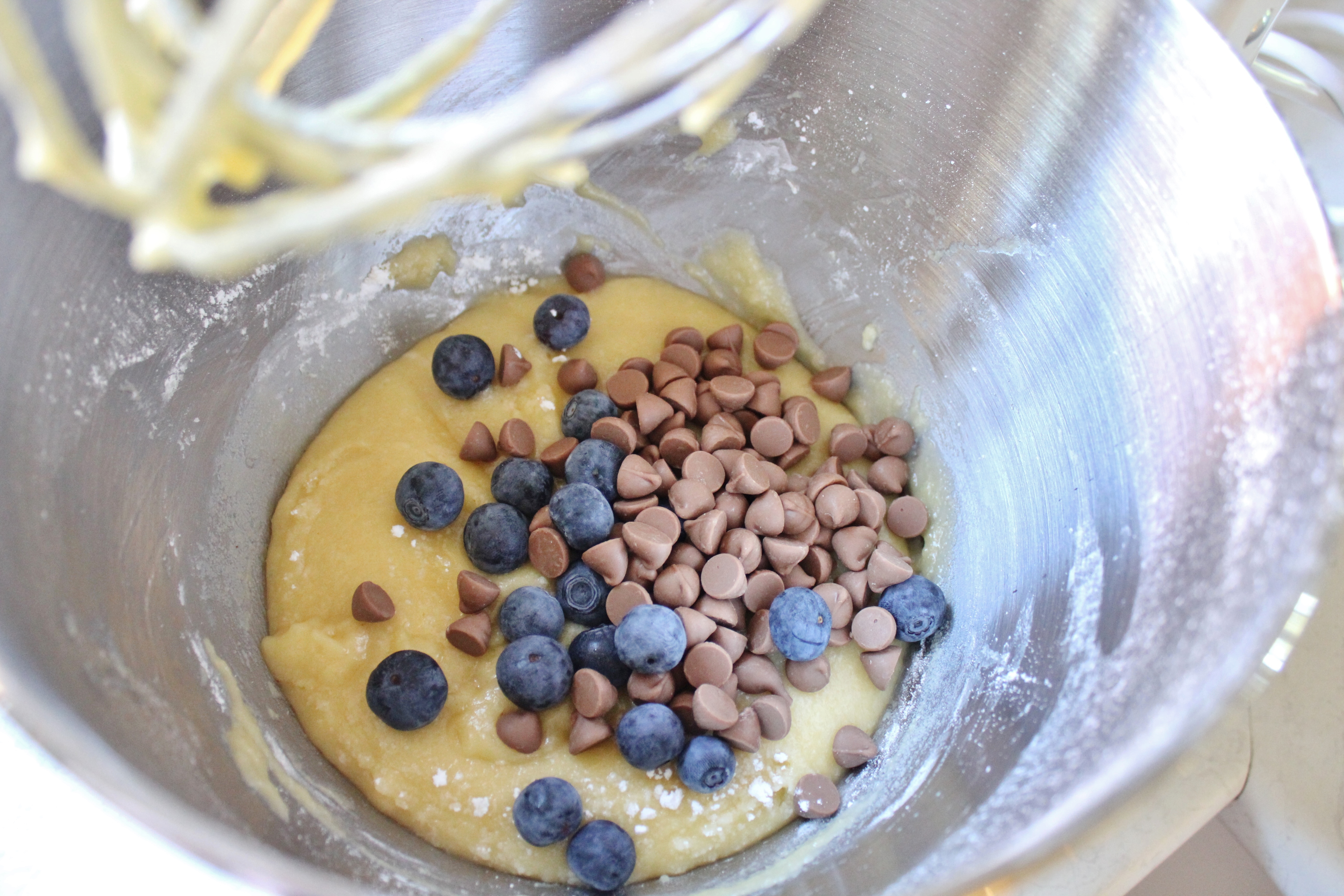 Whisk your egg whites on a medium speed for about one minute, or until they start to froth up slightly. Melt your butter in the microwave and add it to the egg whites. Sift your almond meal and icing sugar straight into the bowl, then add the plain flour in, mixing until everything is just combined. Pop the blueberries and choc chips into the mixture, then mix them gently until they’re well distributed throughout the mixture.