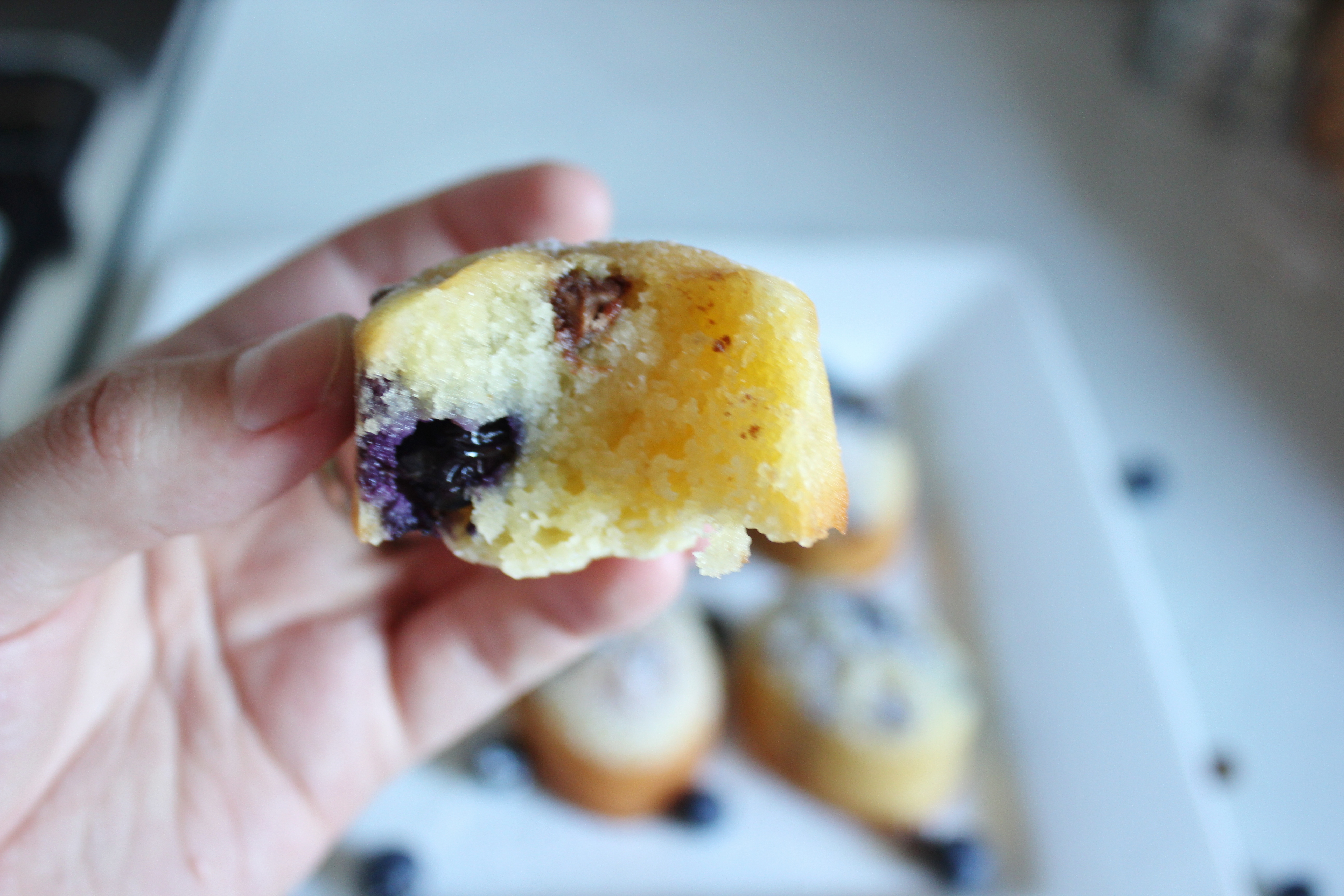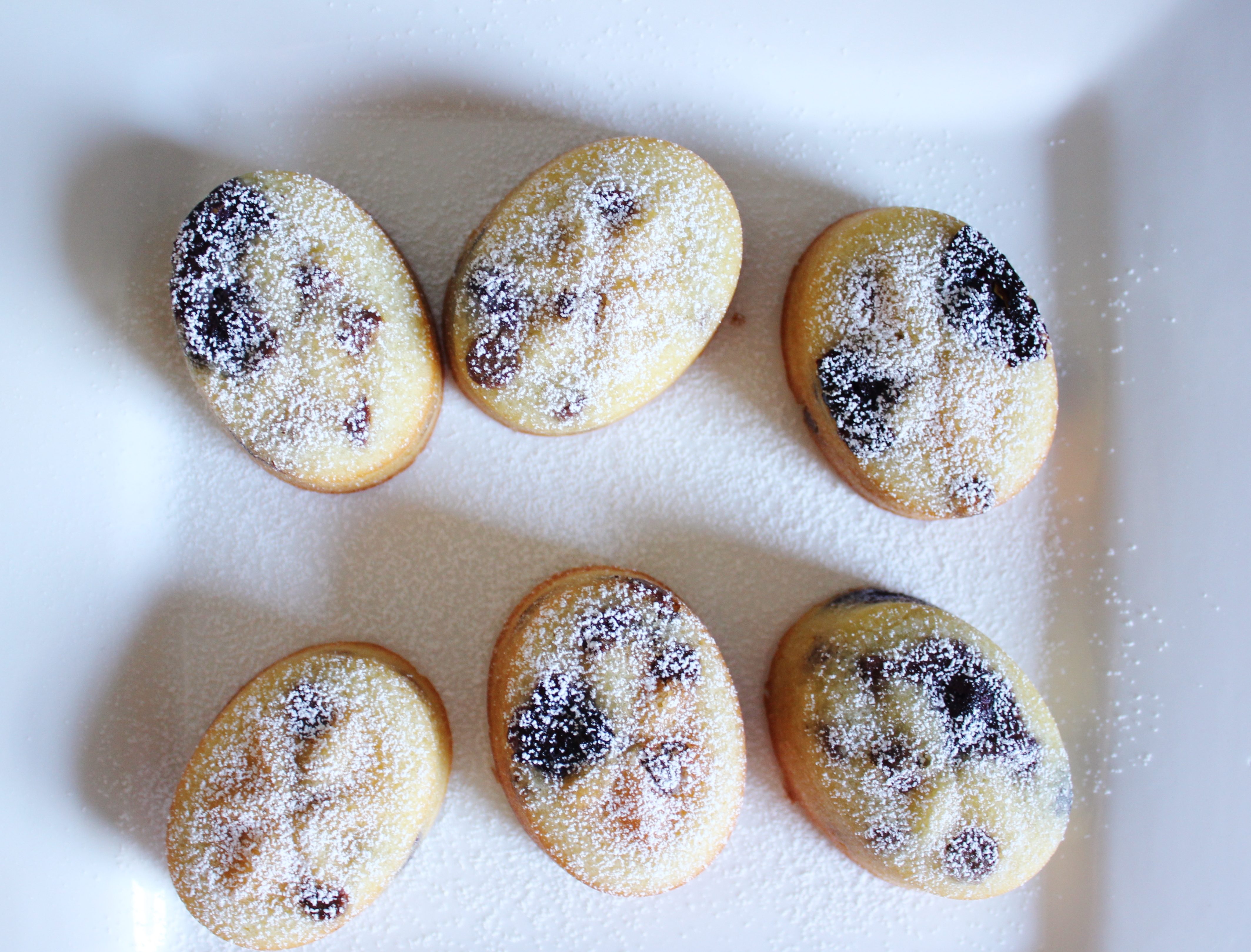 Let them cool for 2 minutes, then turn the tin upside down onto a cooling rack. Let them cool completely, dust with icing sugar and serve with blueberries and chocolate.