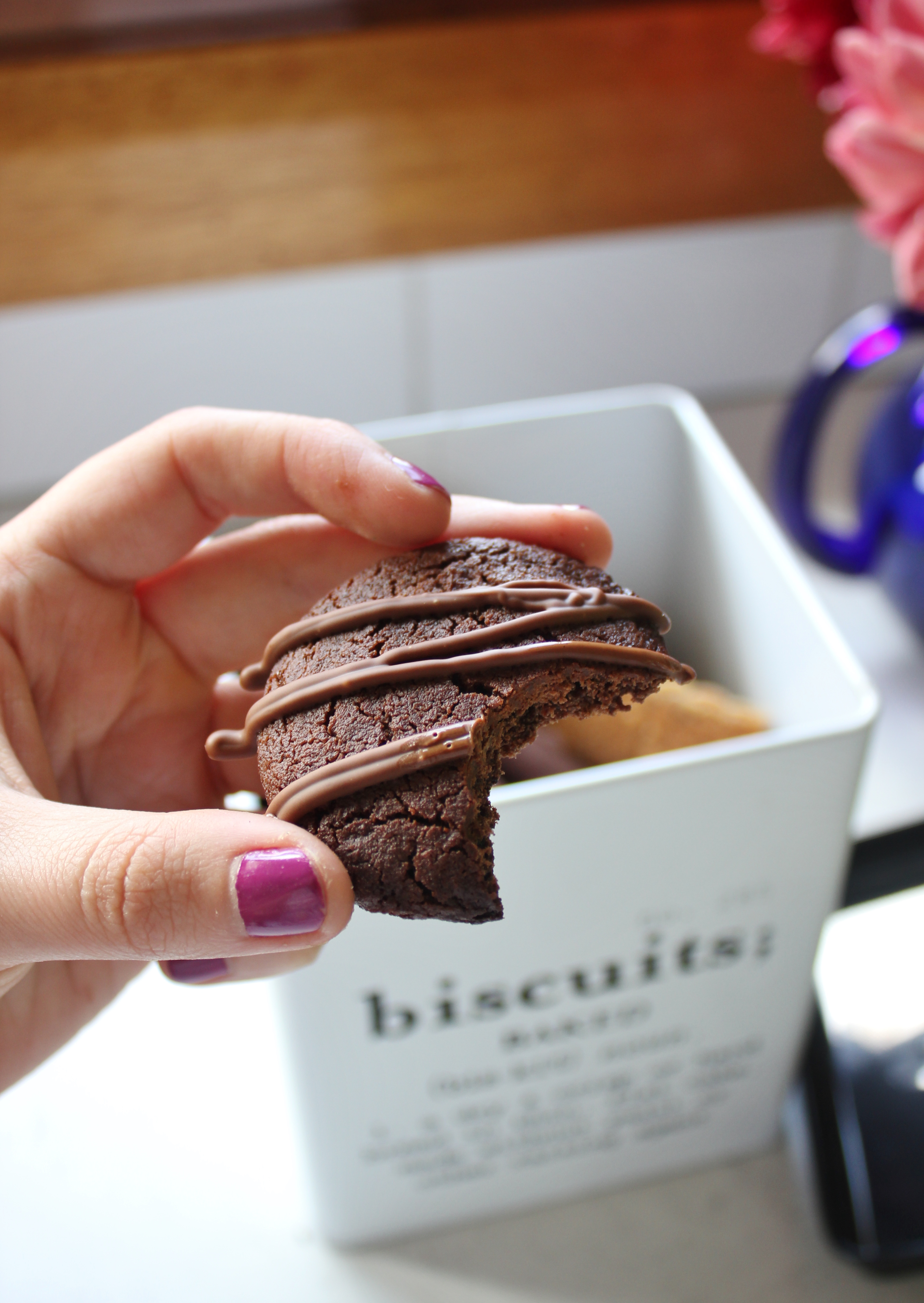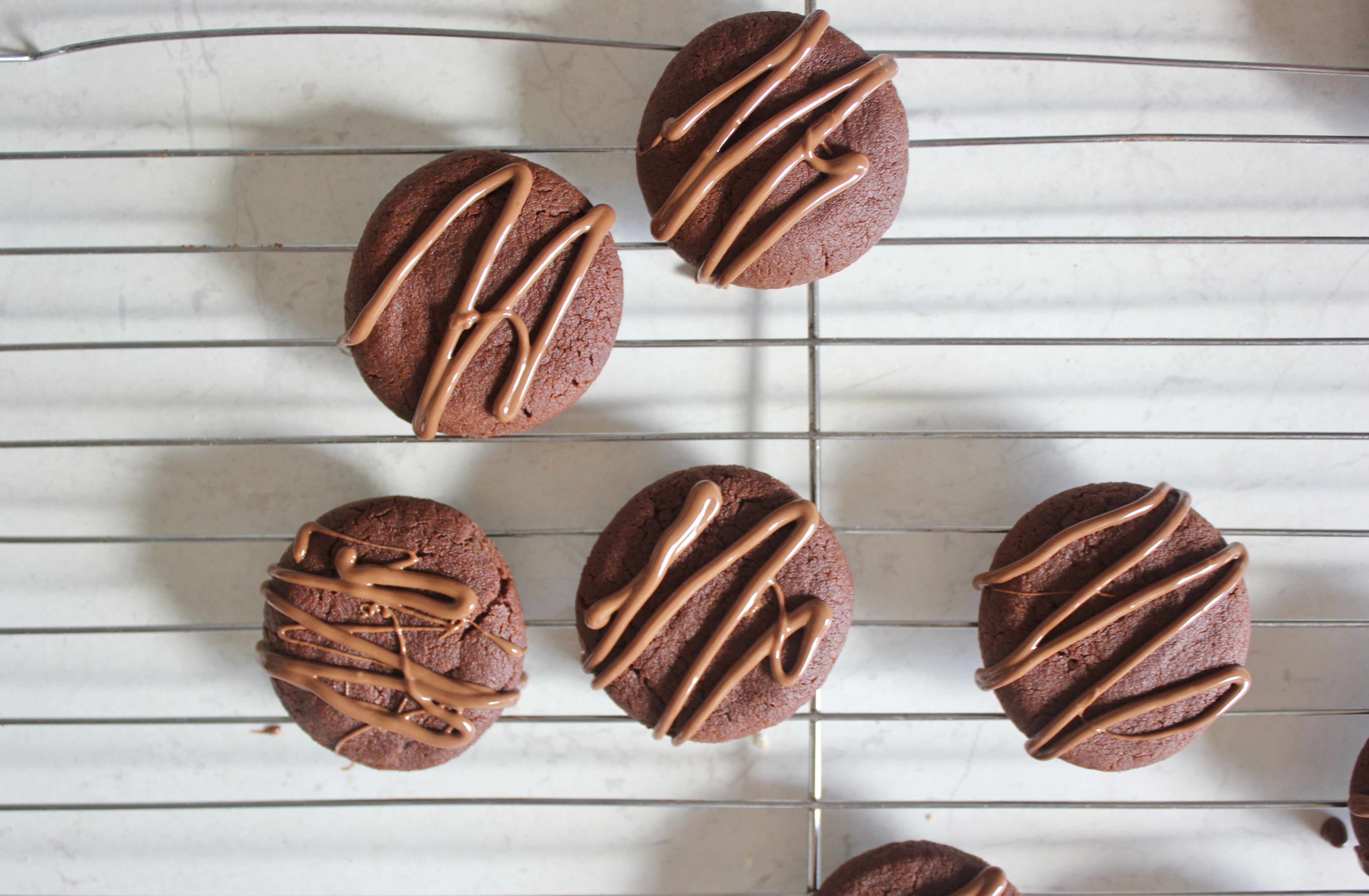 For complete chocolate overload, melt 30g of milk chocolate, spoon into a snap lock bag and snip the end off so you can drizzle melted chocolate over the cooling biscuits. Drizzle in whatever fashion you like (I chose simple zig zags), it looks artistic no matter how you do it!