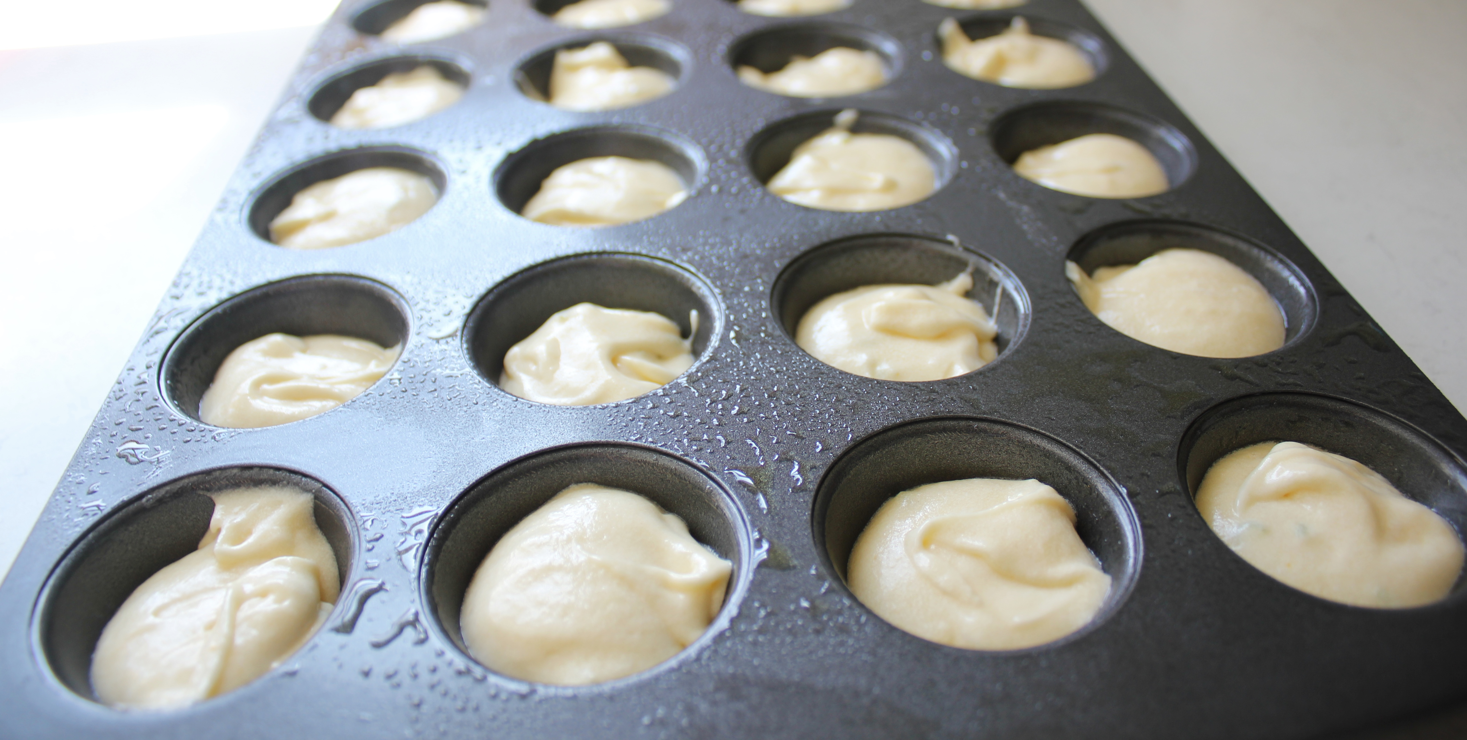 uncookedPreheat your oven to 180°C and grease a 24 capacity mini cupcake tin.