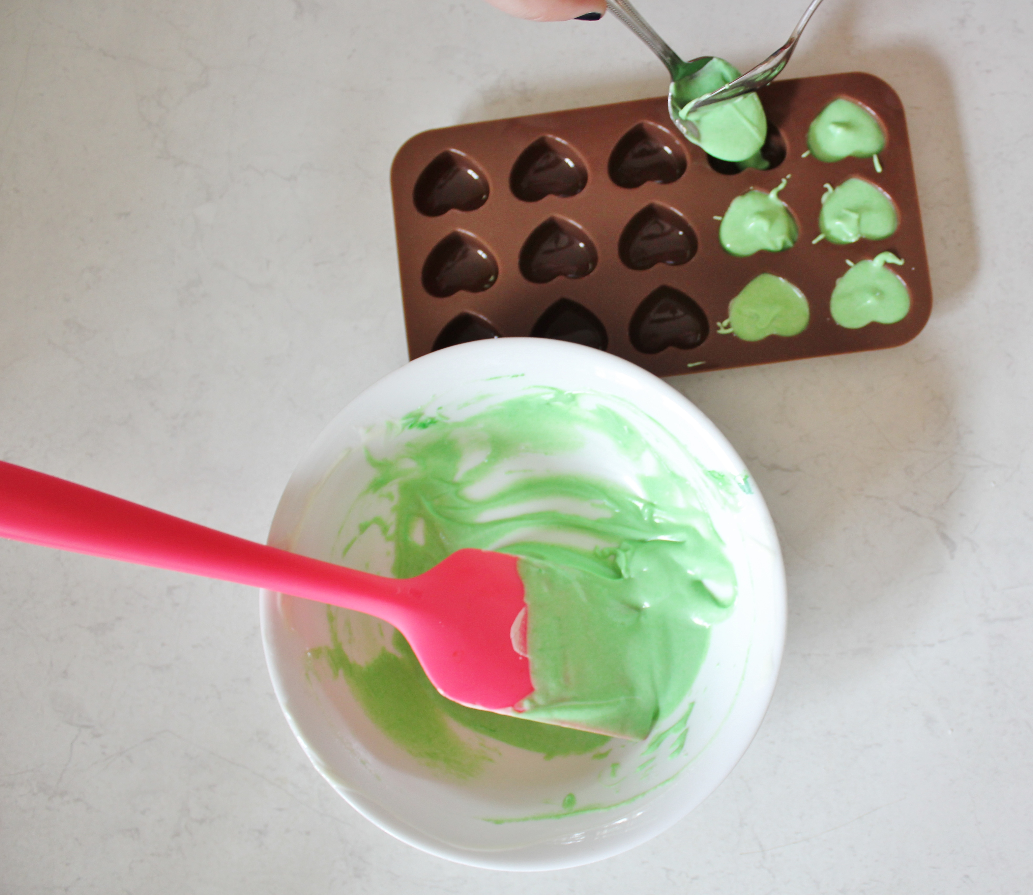 doneTake the warm chocolate and add your food colouring slowly until you achieve your desired green-ness. Spoon the mixture into the moulds and refrigerate for 20 minutes. Remove from the fridge and test whether they’re done by pulling the sides of the mould away from the chocolate to see if the chocolate is set yet – if the chocolate stays in one piece, it’s done.