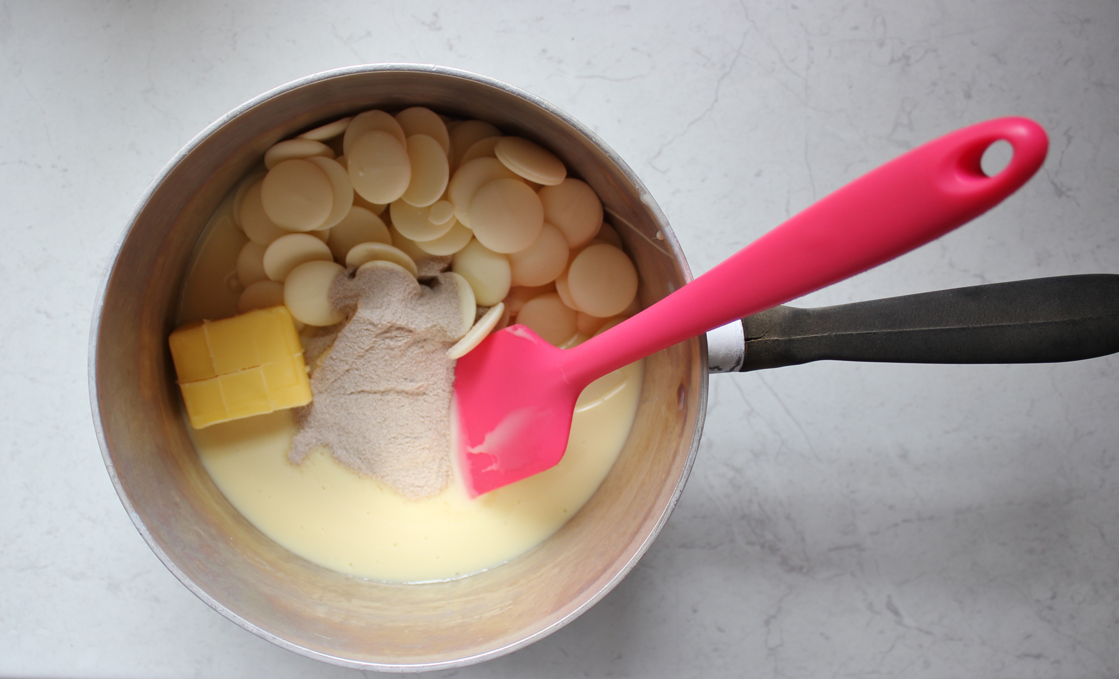 White chocolate, I’ve realised, is not really chocolatey tasting at all – it’s smooth and sweet and that’s about it…not that there’s anything wrong with this! In being so indistinct, white chocolate lends itself perfectly to other flavours, it welcomes them openly – it works perfectly with the caramel of the sweetened condensed milk, and also complements the spicy, warm notes of the chai flavouring.