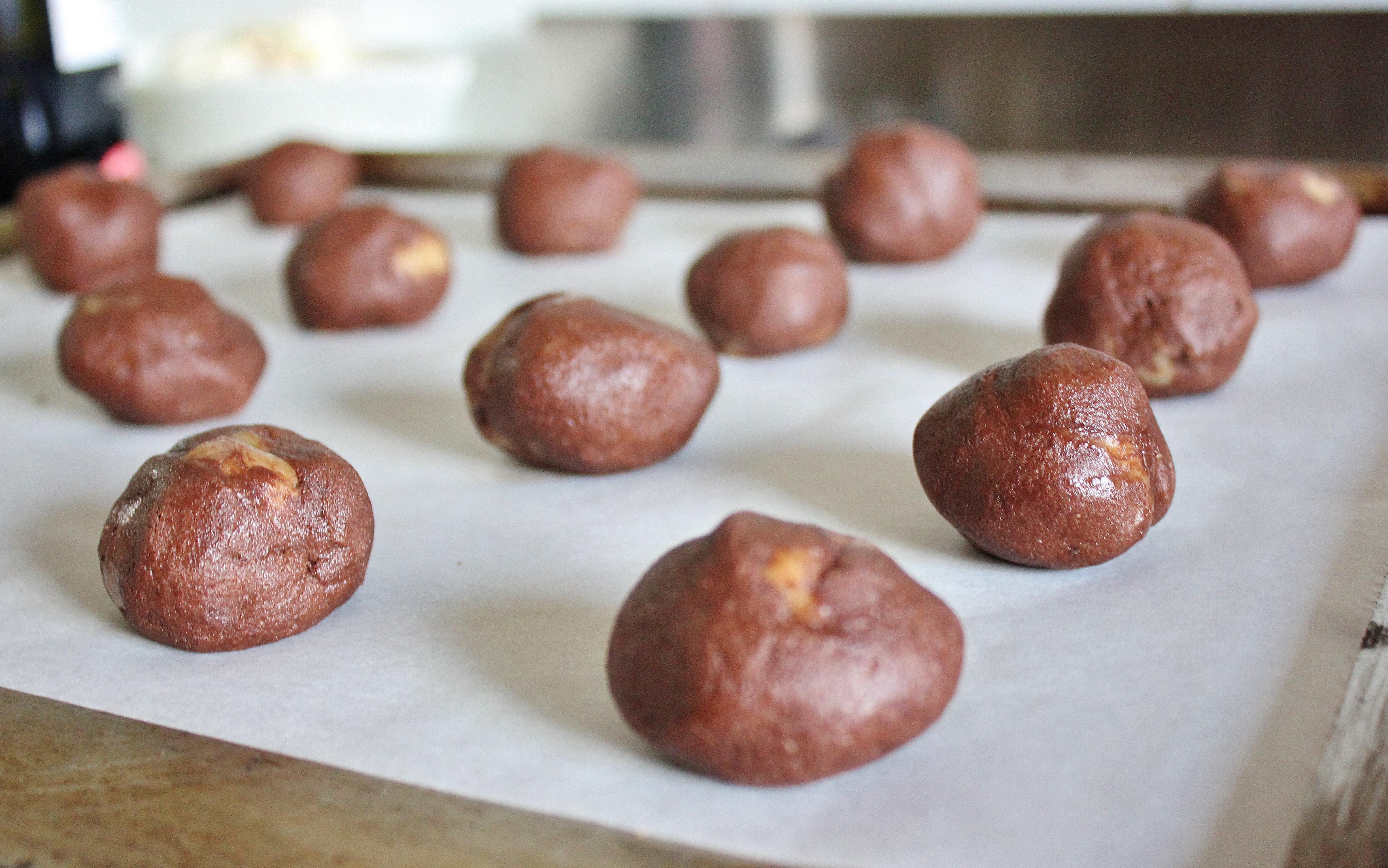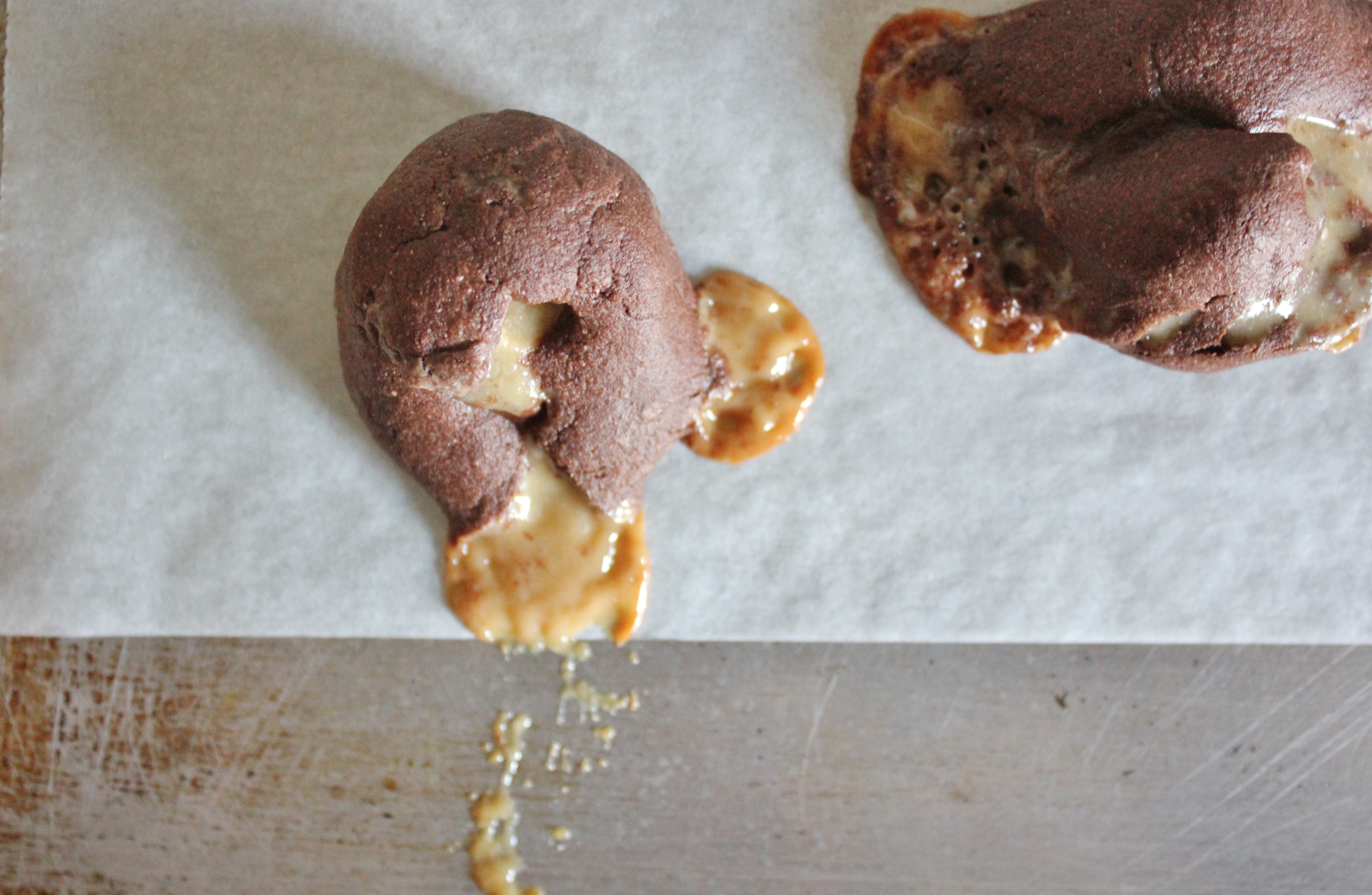 rollMeasure out tablespoons of mixture and roll them into balls in your hands. If possible, try to ensure that most of the fudge is on the inside of the balls, otherwise it will spill out as they’re baking. You can see some of mine spilled out (and my father made some rude remarks about their likeness to excrement), but they were still delicious.