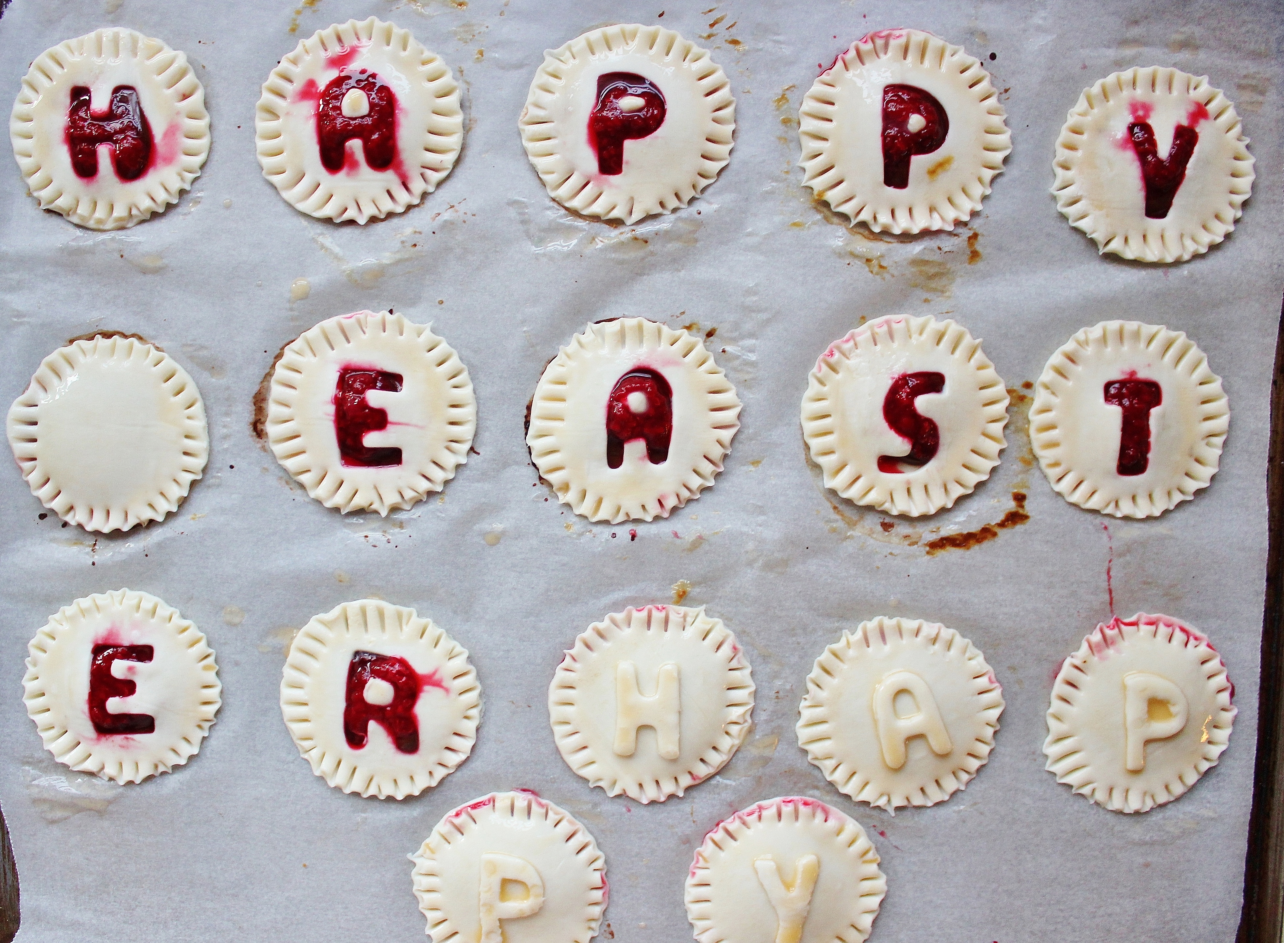 happyPlace your tops over the Nutella and raspberry filled rounds, then brush with egg wash.  Grab the letters that you reserved and place them on any empty lids. Brush with egg wash again.