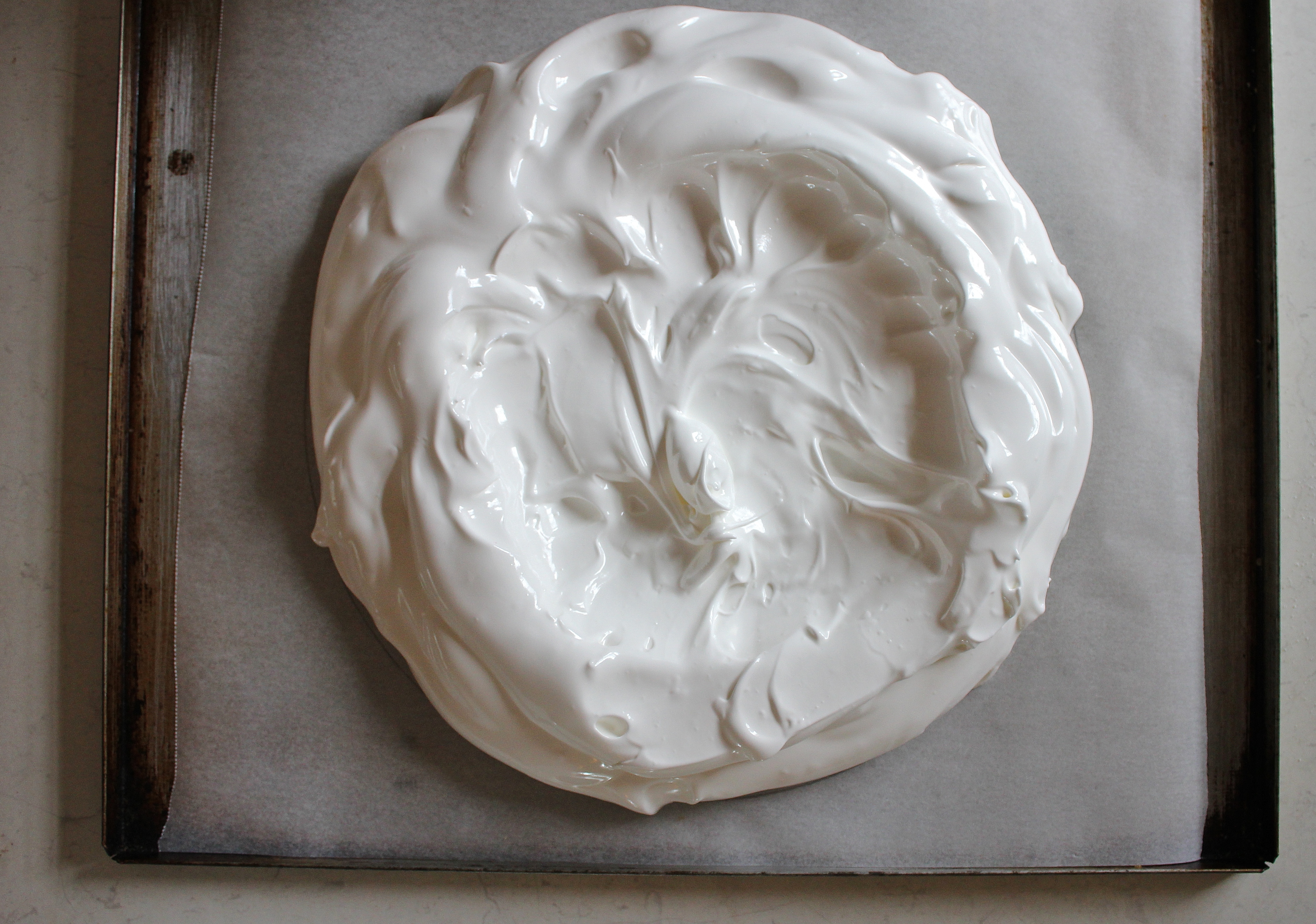 Preheat your oven to 150°C. Grab some baking paper and trace the outline of a dinner plate (it should be about 22cm.) Flip the baking paper so that the egg whites don’t touch the pencil and start to fill the circle with egg whites. There’s no need to be neat, just scoop the egg whites evenly into the circle and then smooth out with a spatula. Try to create a nest shape so that you can fill the middle of the pavlova with your cream later on.