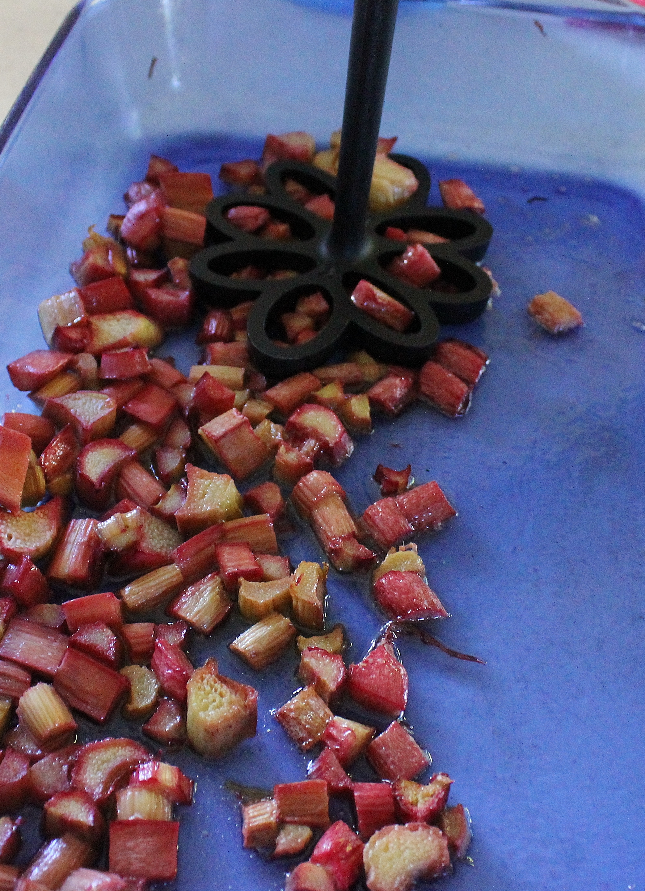 rhubarbWhen your dough has 30 minutes of rising left, preheat your oven to 180°. Grease a large baking tray with the 20g of butter and put your rhubarb in the tray. Roast for 20 minutes, until softened. Take them out of the oven and allow them to cool slightly, then mash into a pulp.