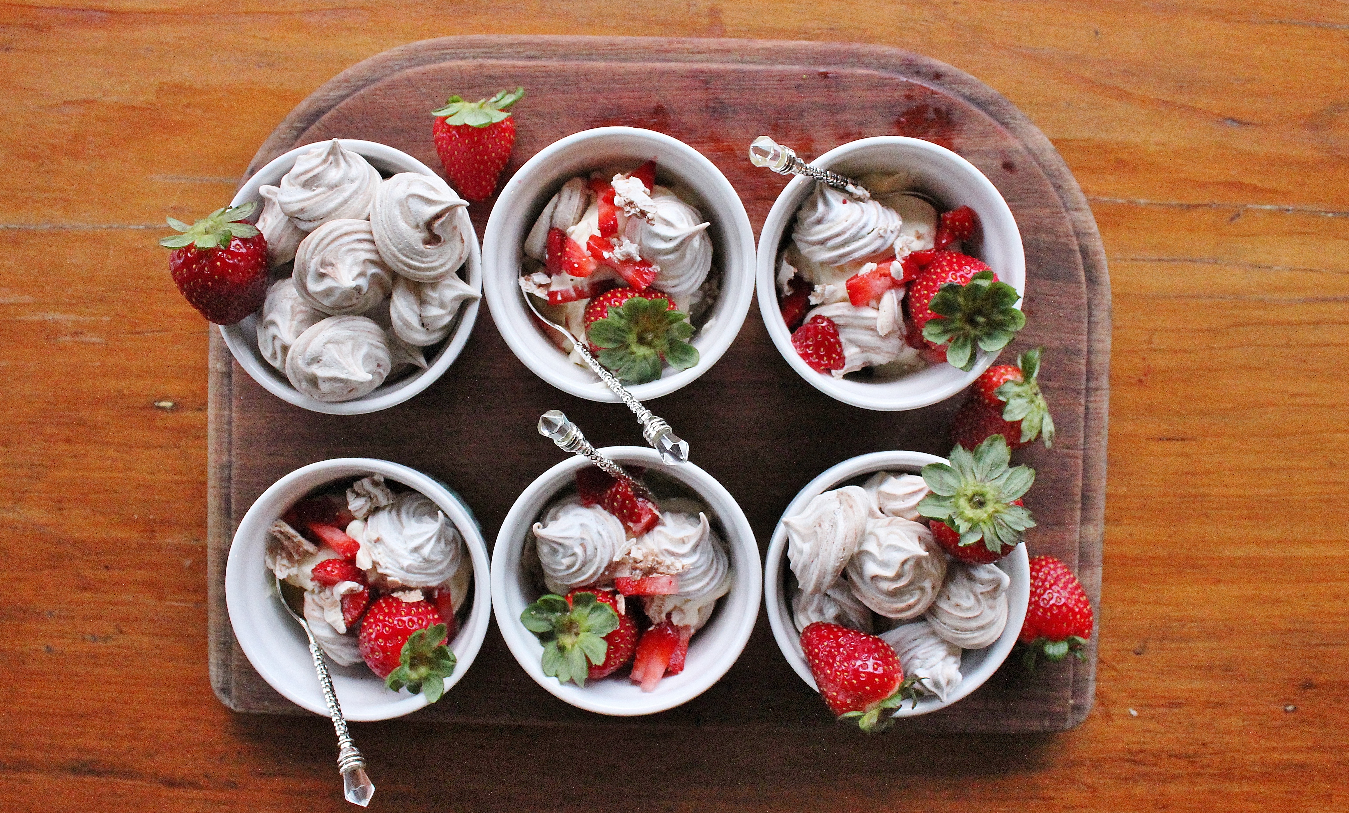 Grab some ramekins or small bowls and layer your ingredients to your specifications. I went: meringue, cream, strawberry cubes, meringue, whole strawberries. But you can do it in whatever fashion you like – the ingredients are such classic flavours that they taste good no matter what is on your spoon.