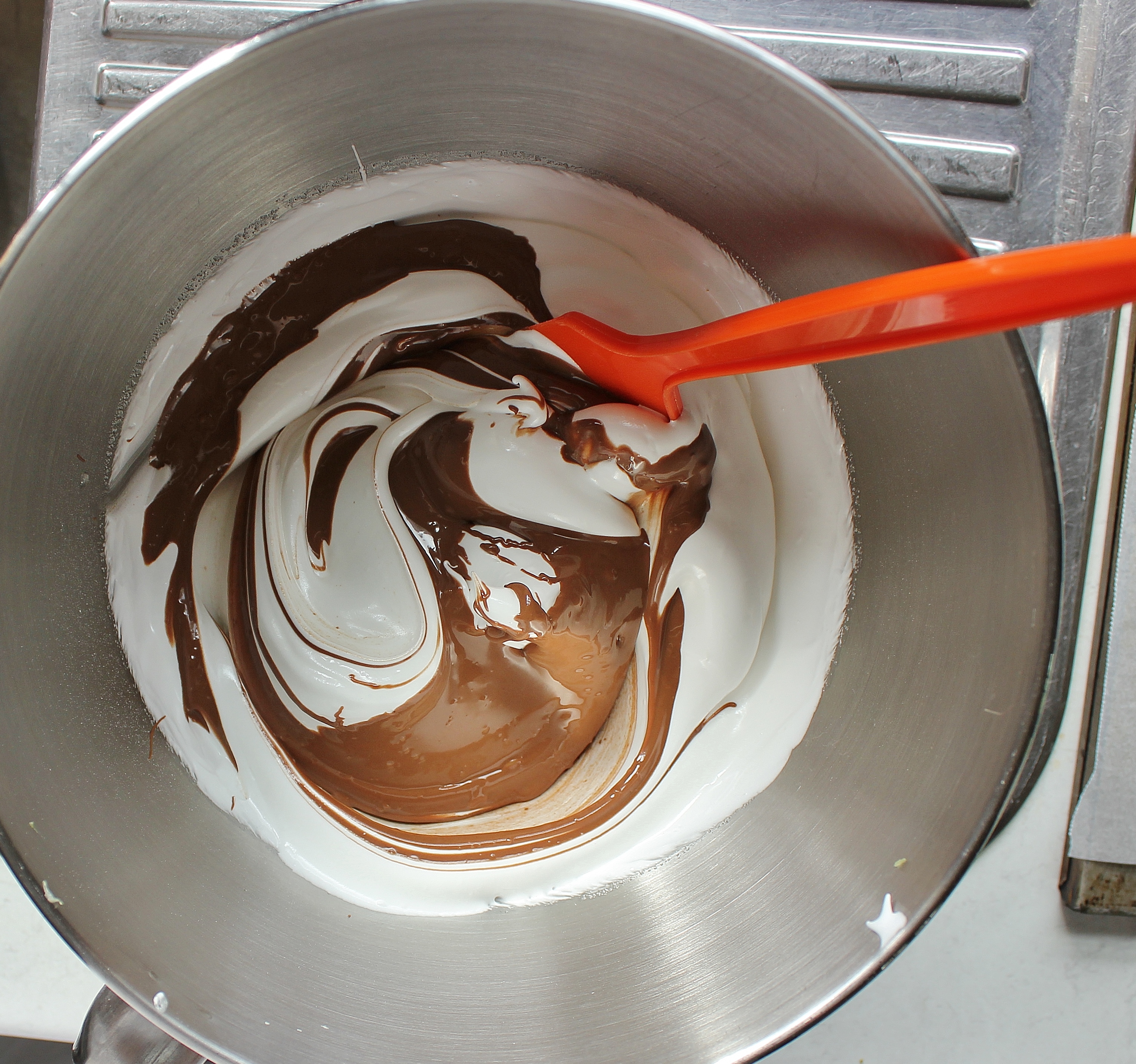 Melt your chocolate in a bowl and fold it into the meringue. You only need to fold it gently about four times, any more than this and you’ll lose the swirly look.