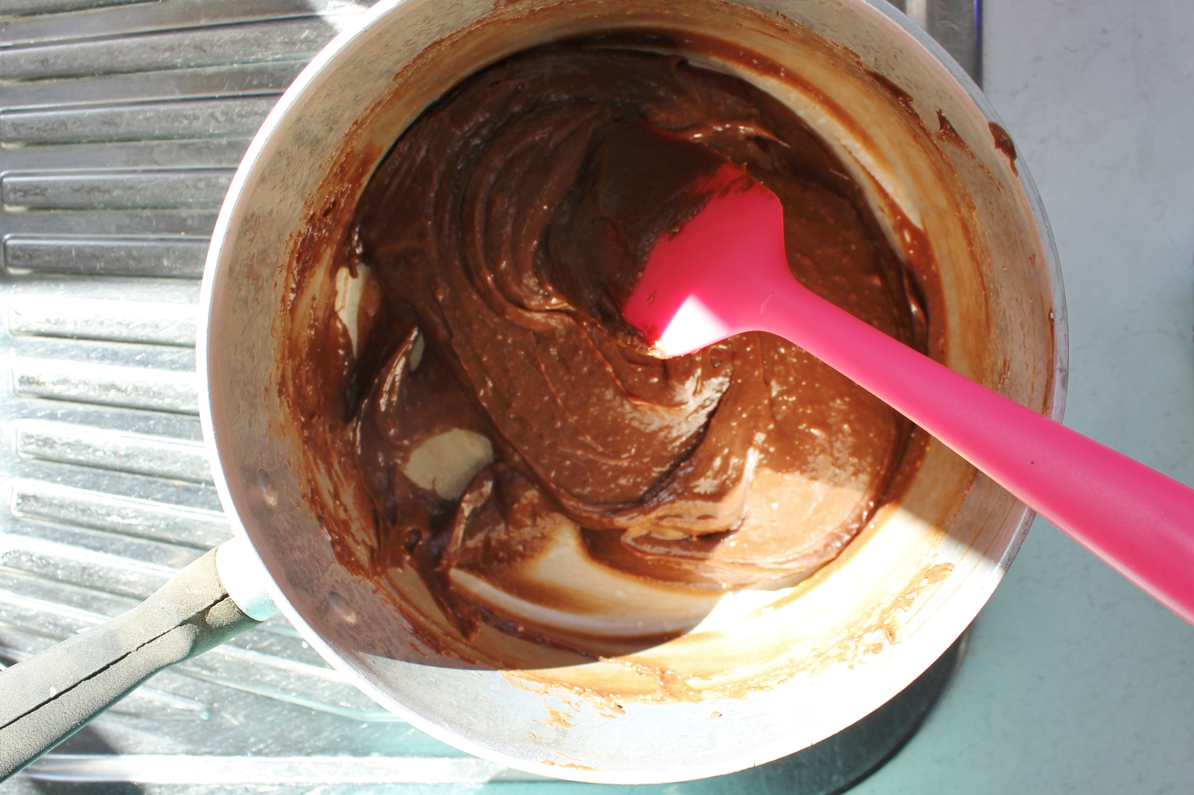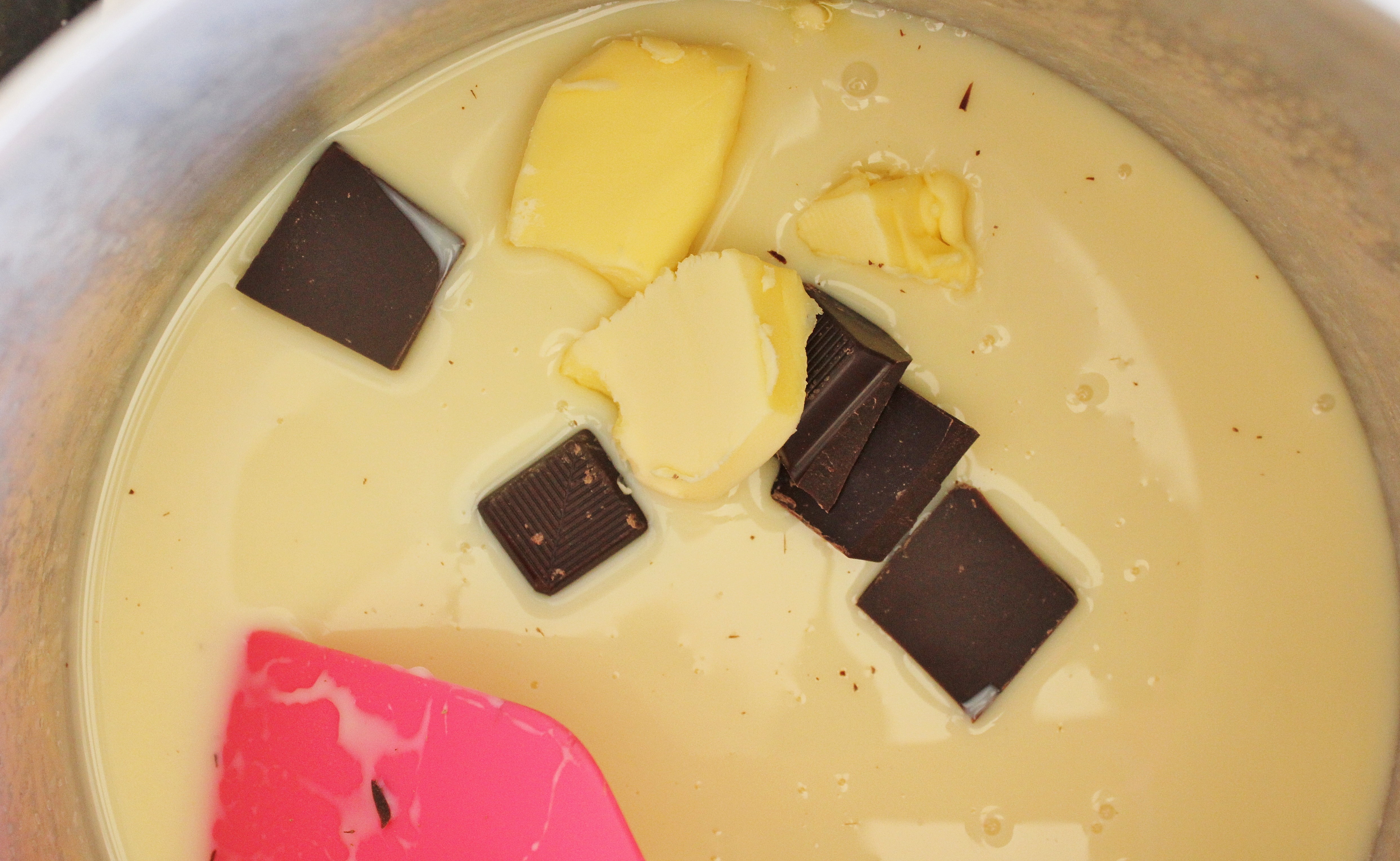 meltPop your chocolate, butter and sweetened condensed milk in a pan over a medium-low, mixing until the ingredients are melted and combined. Turn the heat down to low, add the egg yolk and mix well. Continue stirring as the mixture slowly bubbles away.