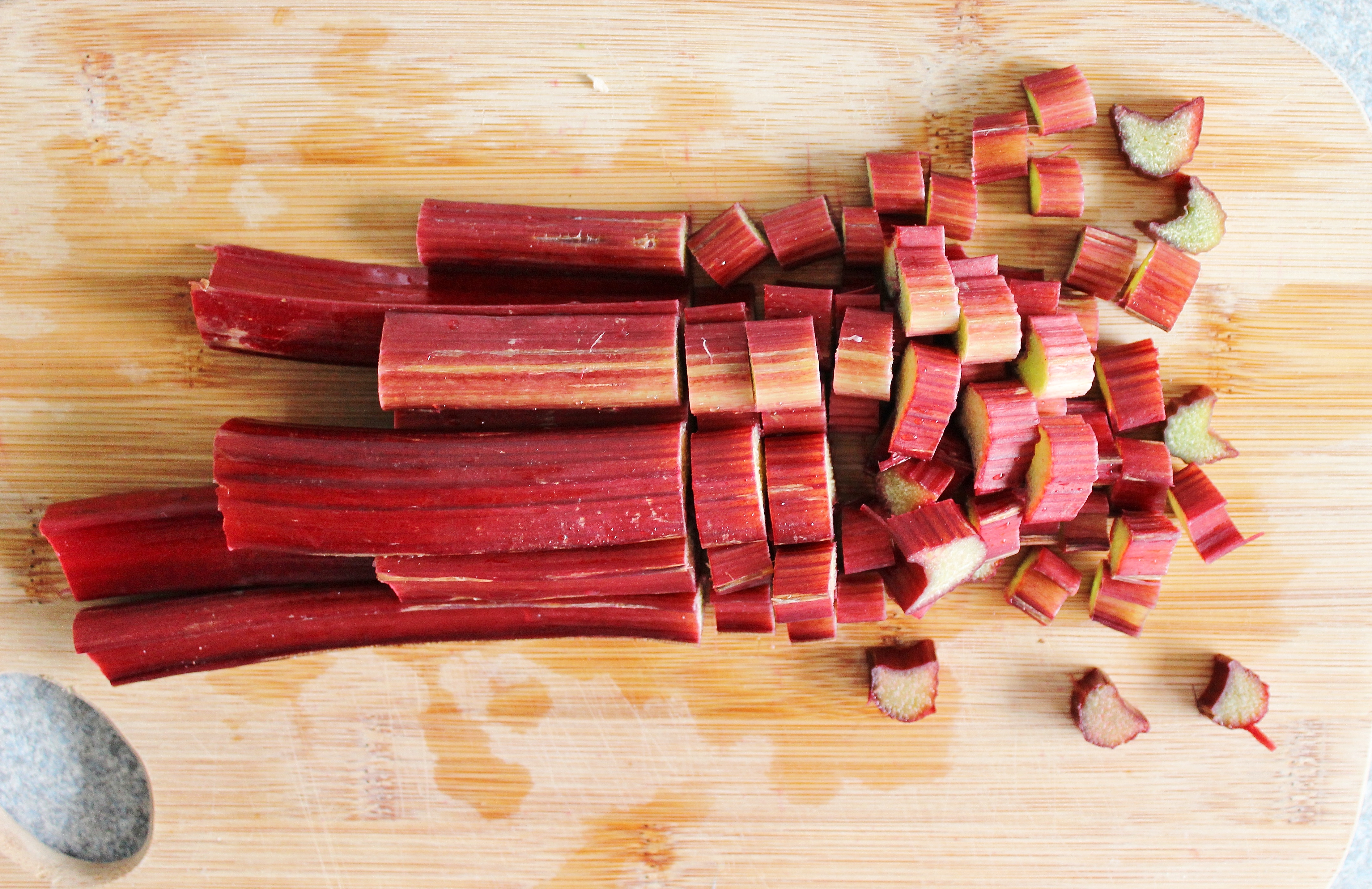 rhubarb aboveGrab your rhubarb and fold it into the mixture. Your rhubarb will cook and soften with the batter, for those of you worried about putting raw rhubarb into the mixture.
