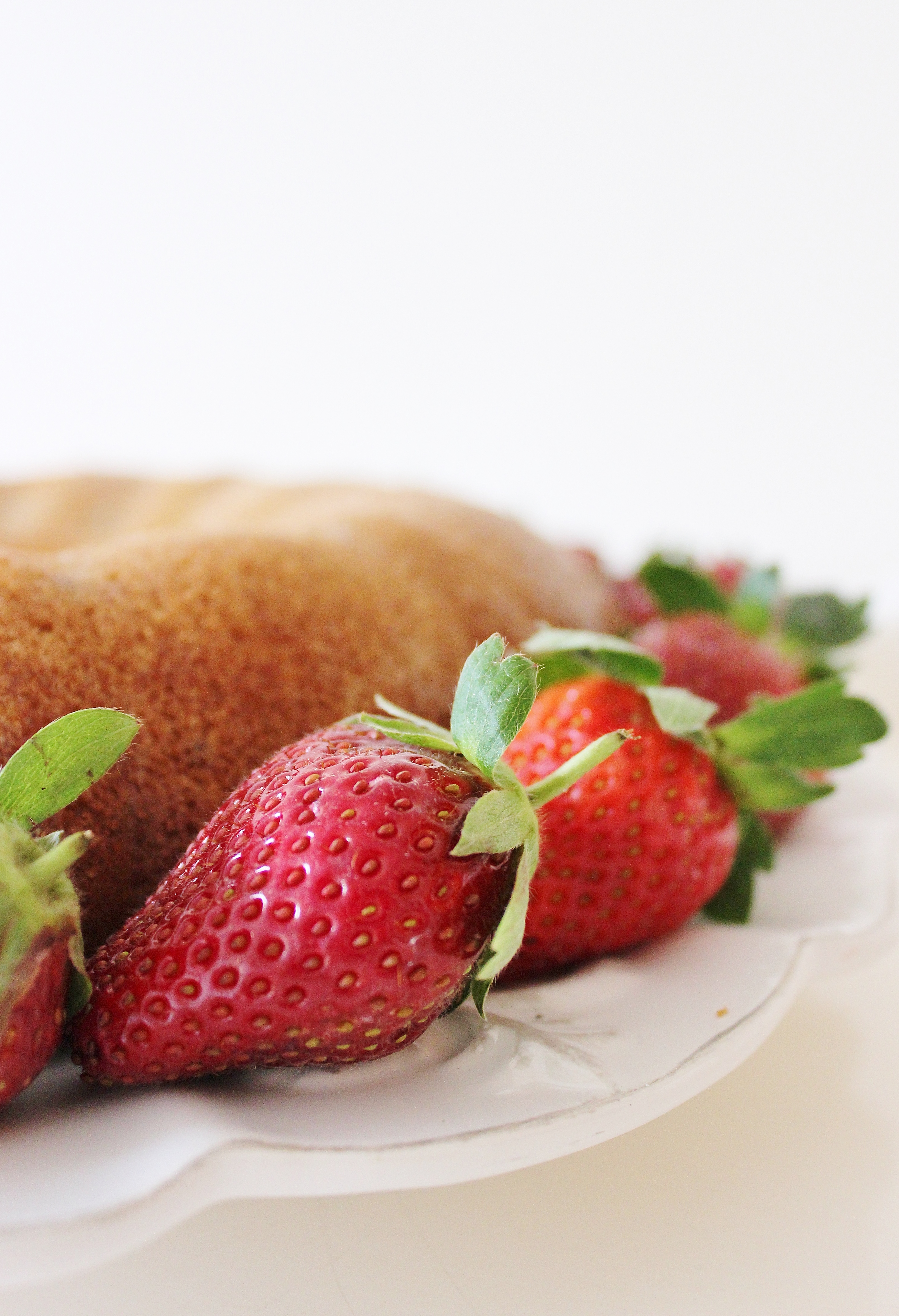 strawberryA skewer inserted into the cake should come out with only a few crumbs on it. It won’t come out completely clean like a regular cake because of the heavier flour and almond meal. Allow to cool for ten minutes, then serve with whipped cream and fresh strawberries.