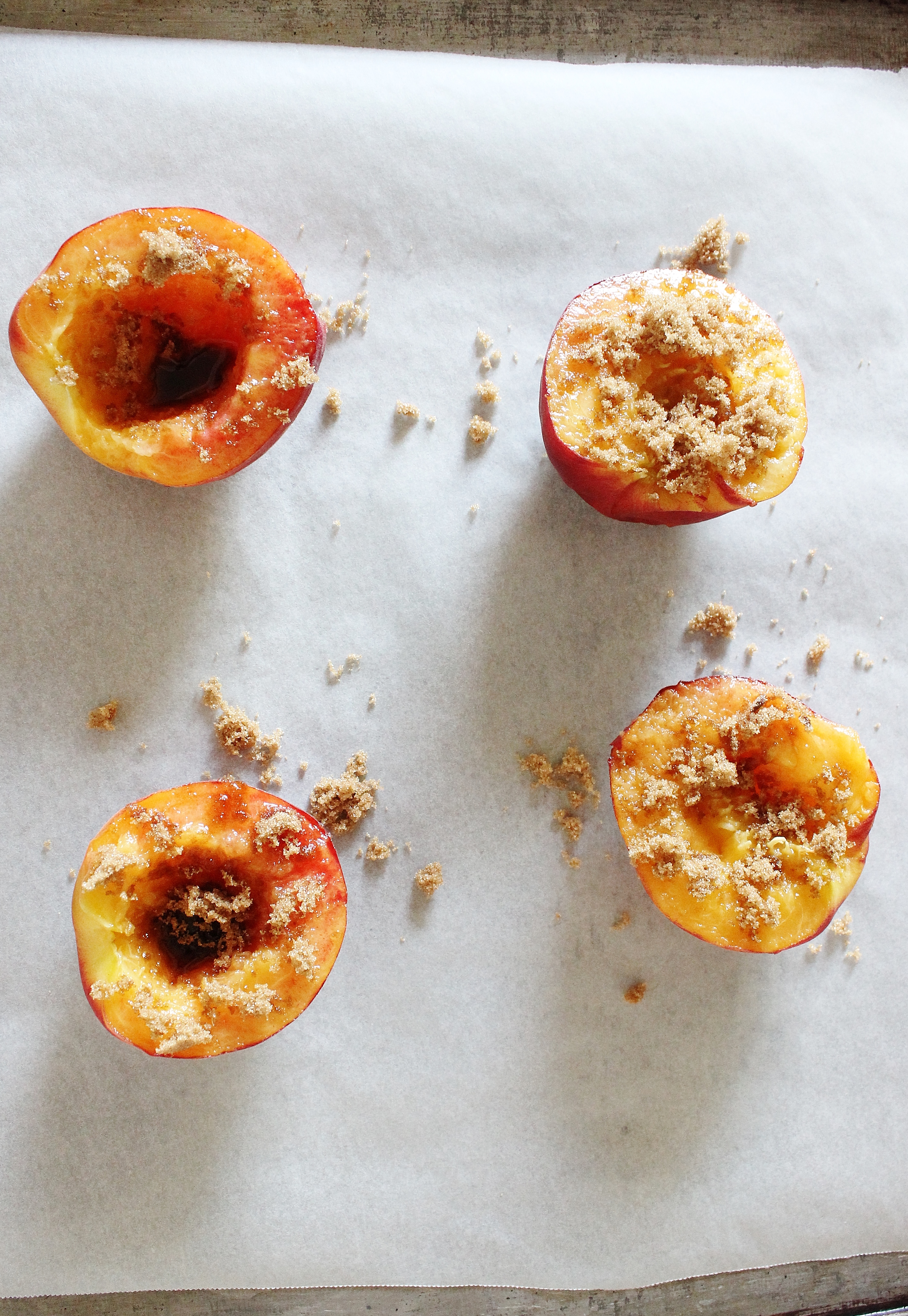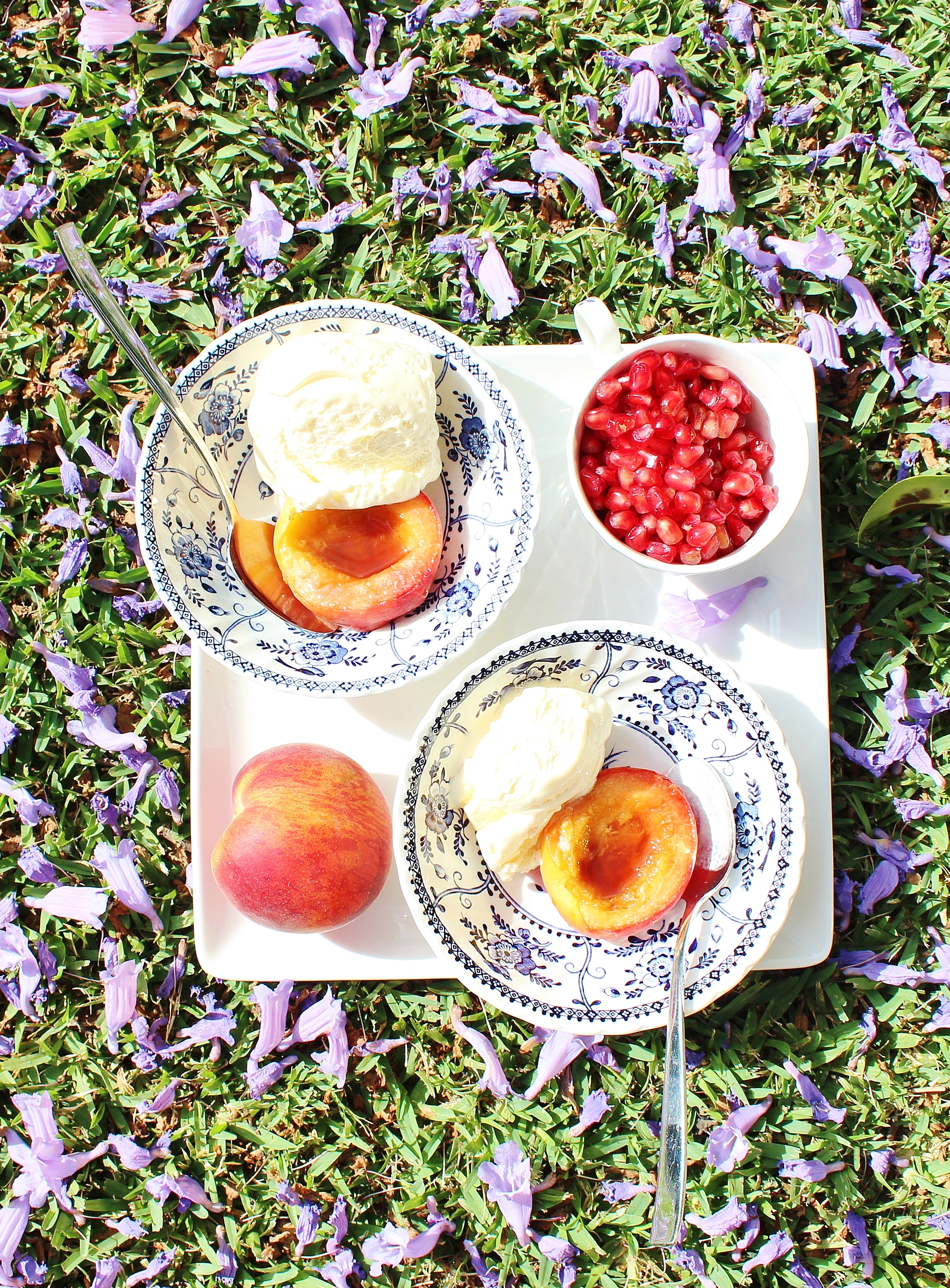 Slice peaches in half and remove the seed. Sprinkle with brown sugar. Pop them in the oven for 20-25 minutes until just soft. Allow to cool for two minutes. Serve with vanilla icing and a sprinkling of pomegranate seeds for the perfect Summer treat.