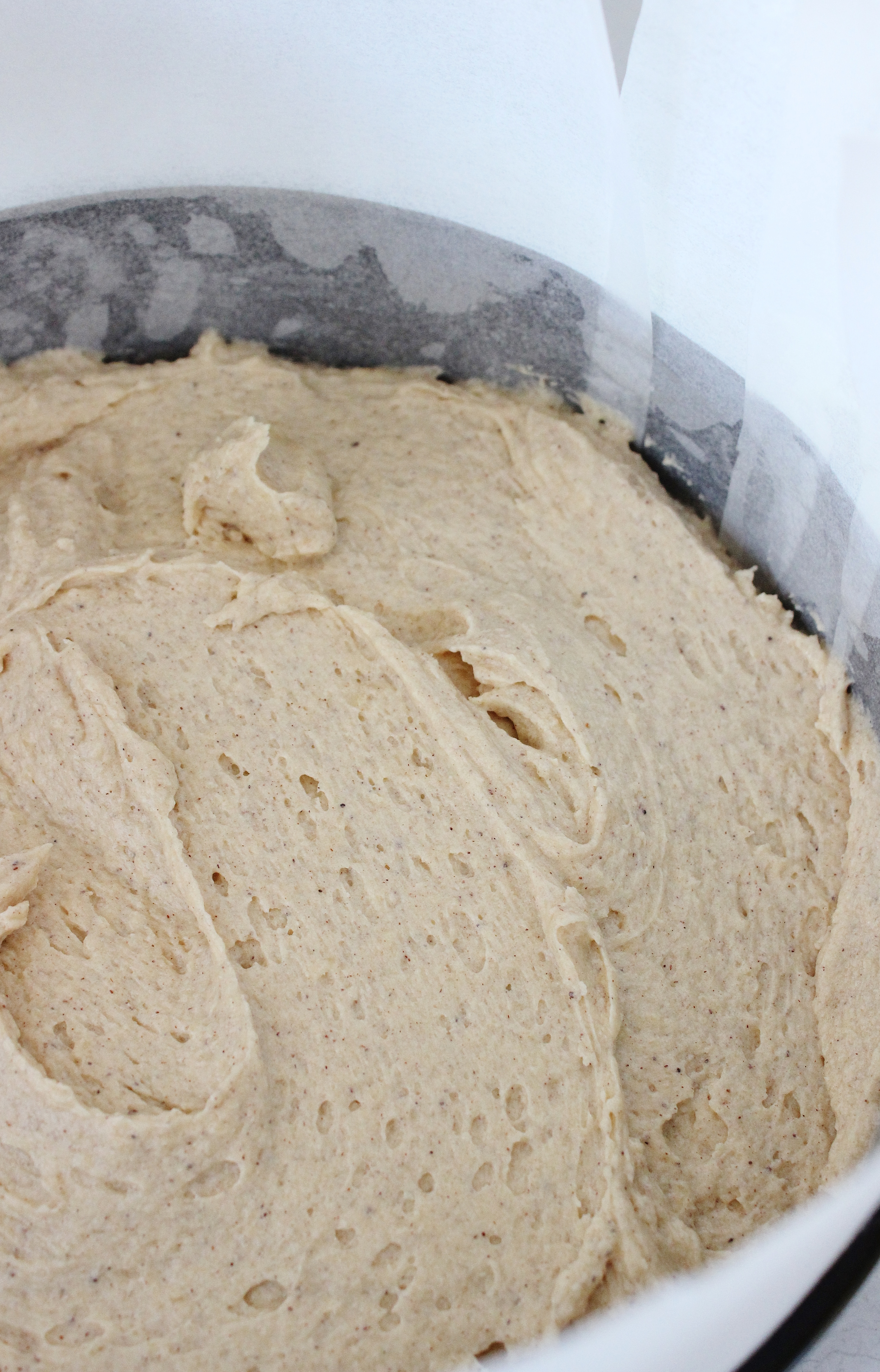 batterCream together your butter and sugar until pale. Add in the eggs, two at a time, and mix well. Slowly add the flour while mixing. Pour in the almond meal and the bicarb, followed by the milk, cinnamon and nutmeg. Mix well.
