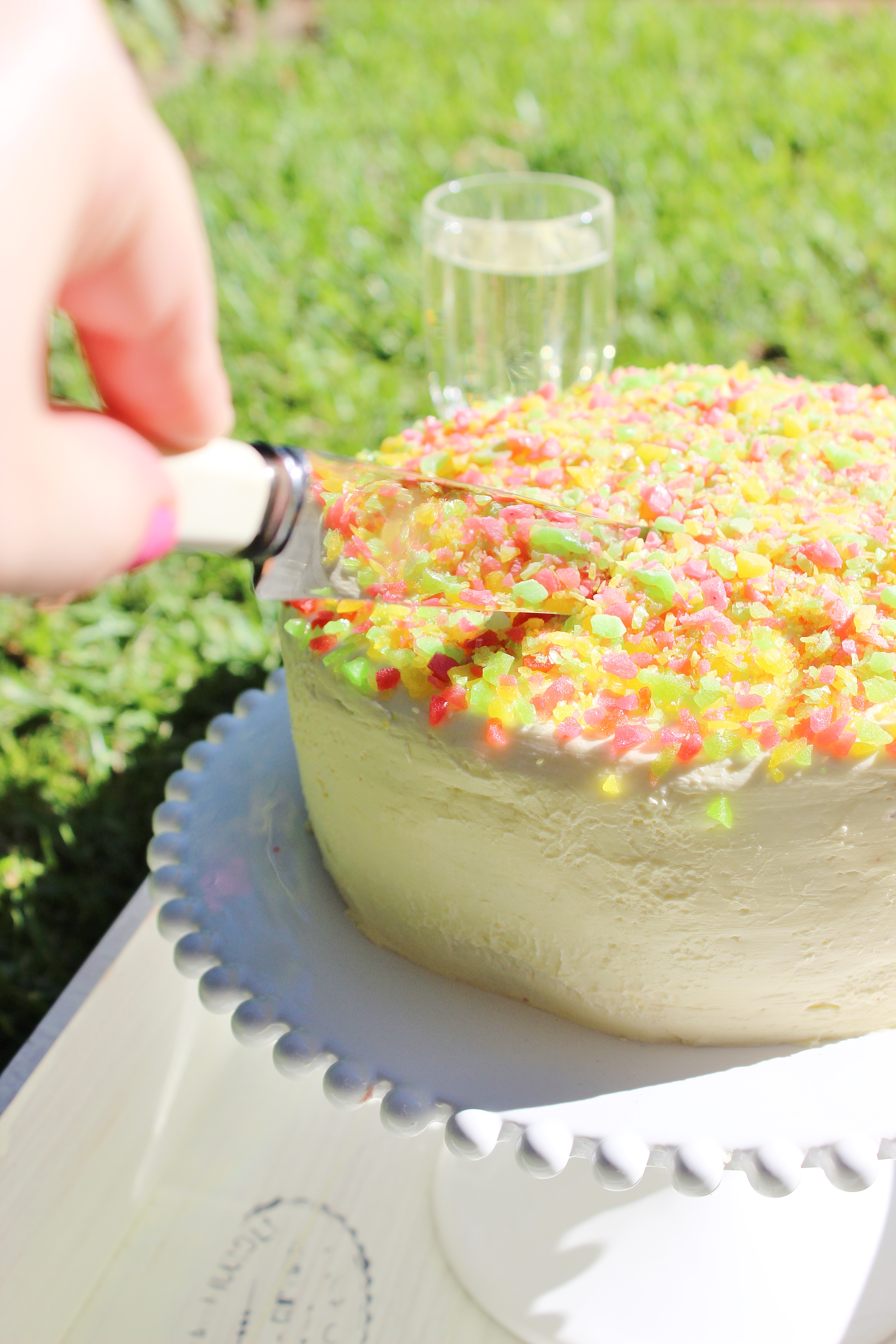 cutIf you’ve got pop rocks (or popping candy), sprinkle it over the top of the cake. Use a baking paper collar around the outside of the cake if you want the pop rocks to stay just on the top of the cake, like mine. You may need to smooth down the sides again.