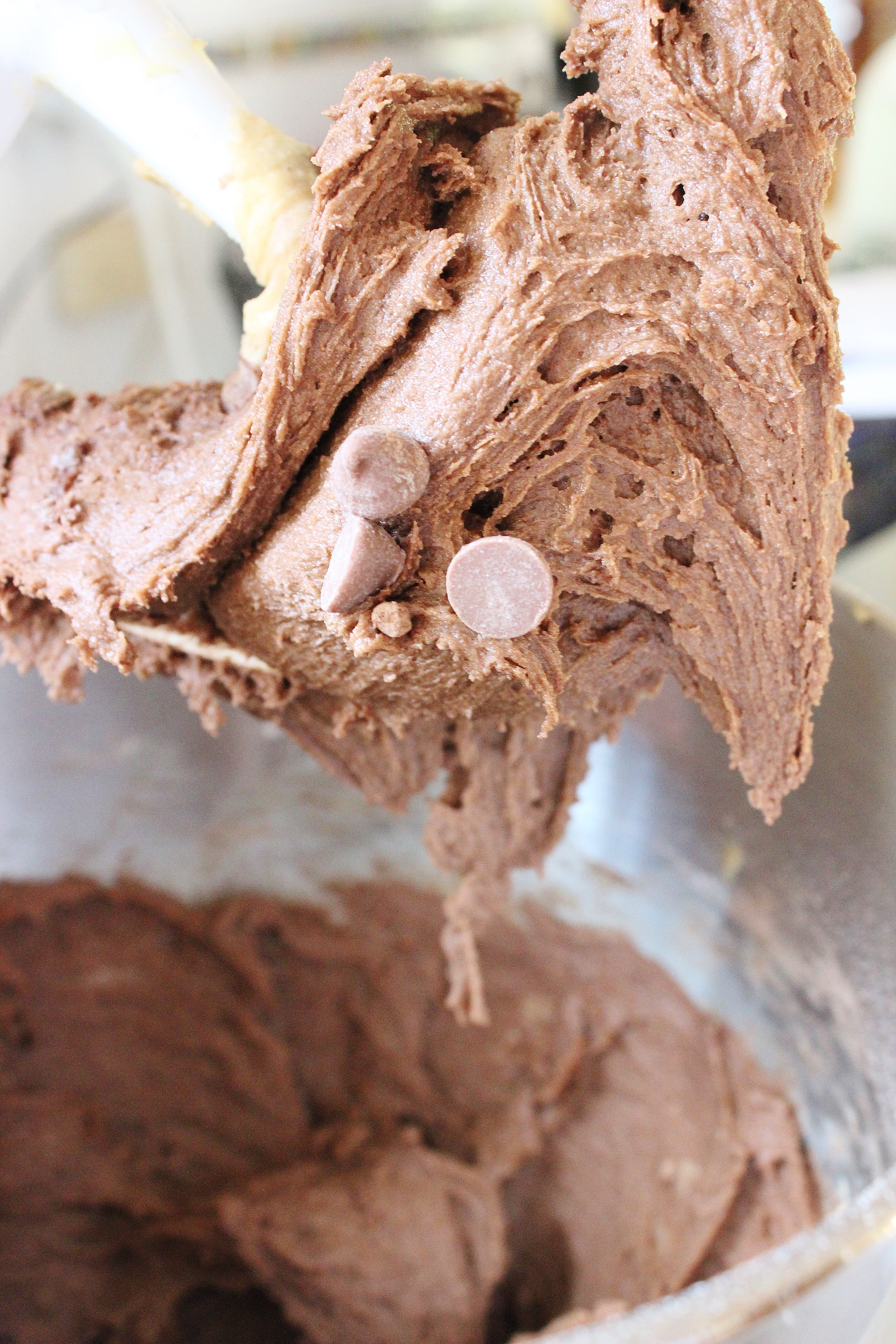 Using the paddle attachment of your mixer, beat the butter and both types of sugar together on a medium speed until pale. Add in the eggs and mix to combine, scraping down the sides of the bowl if needed. Add in the flour and cornflour, mixing well. Mix in the cocoa at a slow-medium speed (this will avoid creating cocoa dust clouds!) Stir in the chocolate chips.