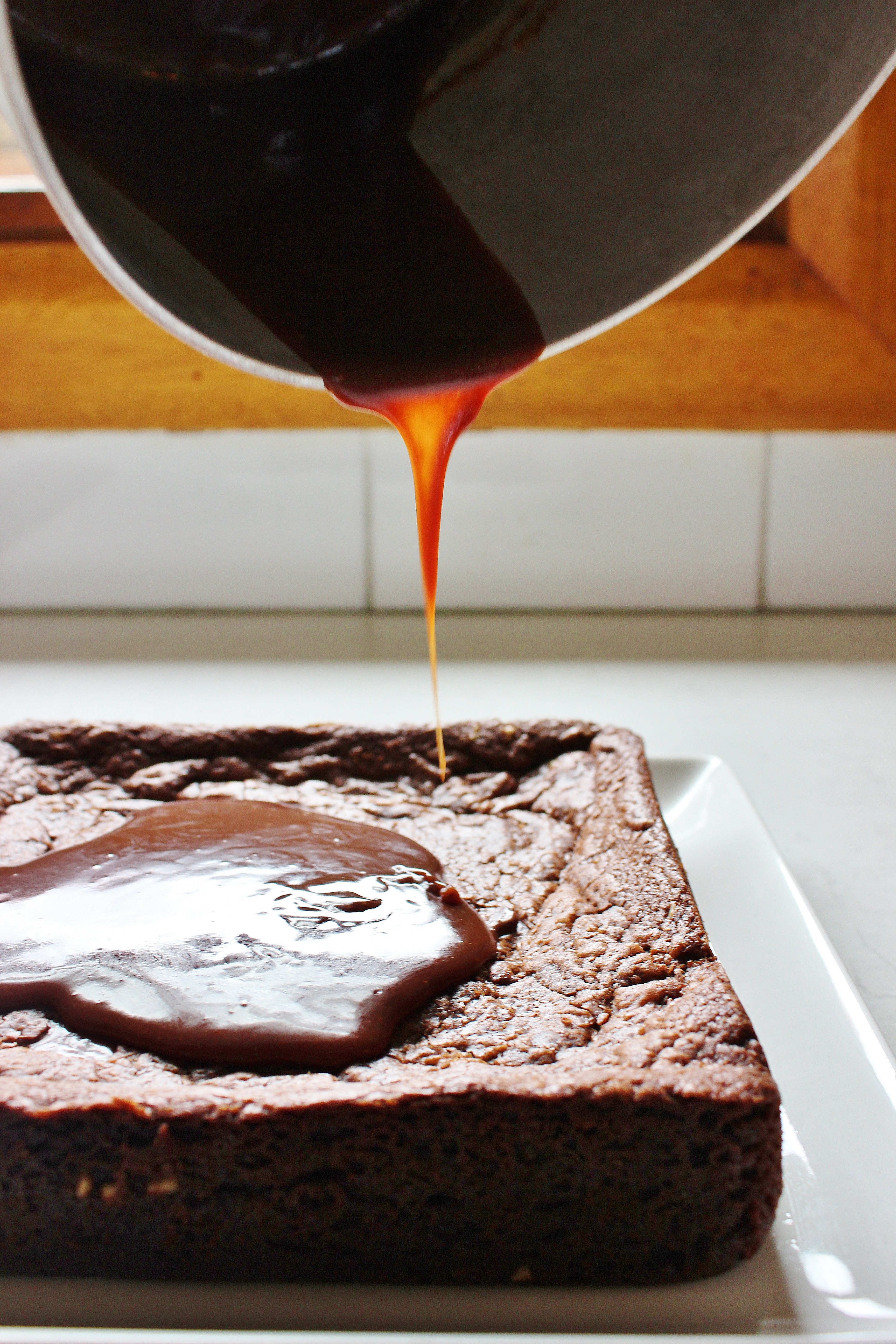 Pour this chocolate over the brownie, which should have sunken (like a good brownie should) in the centre, leaving you a nice basin to fill with chocolate.
