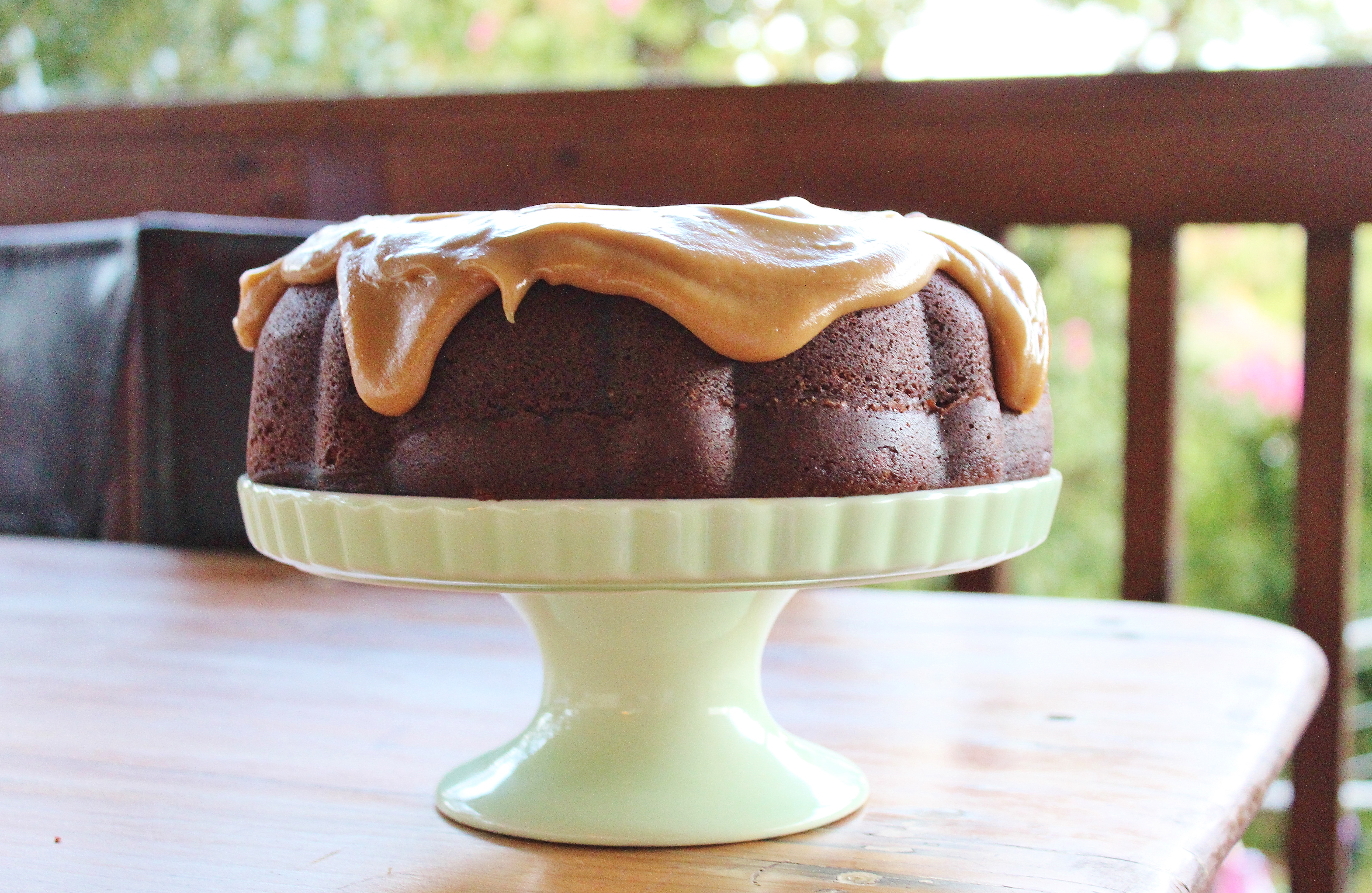 After about 4 minutes cooling, spoon the caramel mixture over the cooled cake generously. You’ll have a little too much icing, but this isn’t a bad thing.
