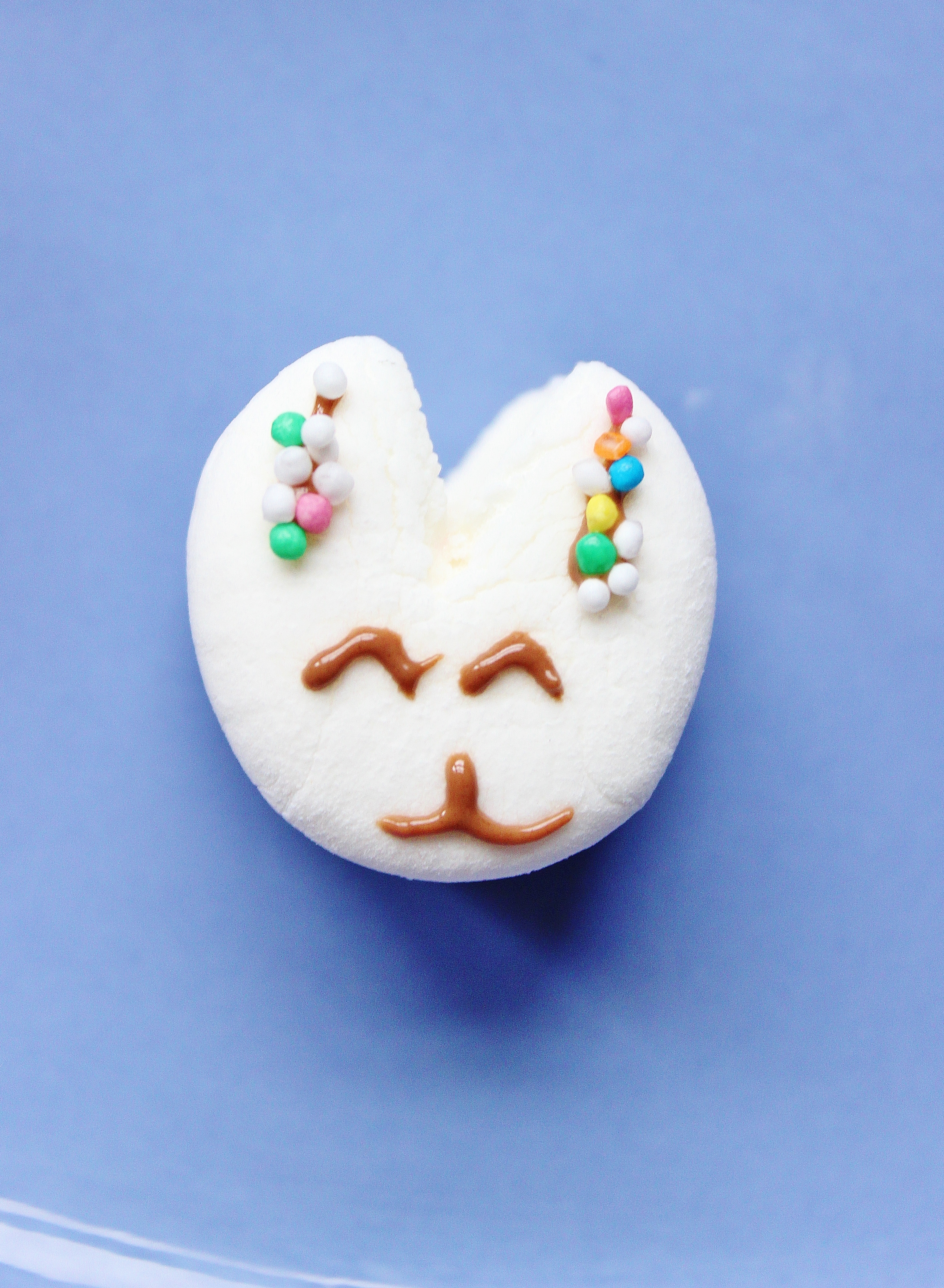 Sprinkles are also an important part of my first Easter recipe (yayyy!) Teeny little marshmallow rabbits. They also kind of look like cats, but I don’t really mind. Marshmallow ambiguity isn’t necessarily a bad thing! They’re really easy, and can be eaten as a treat on their own, or as a decoration for cupcakes, or a nice Easter pav (like the one I made last year.)