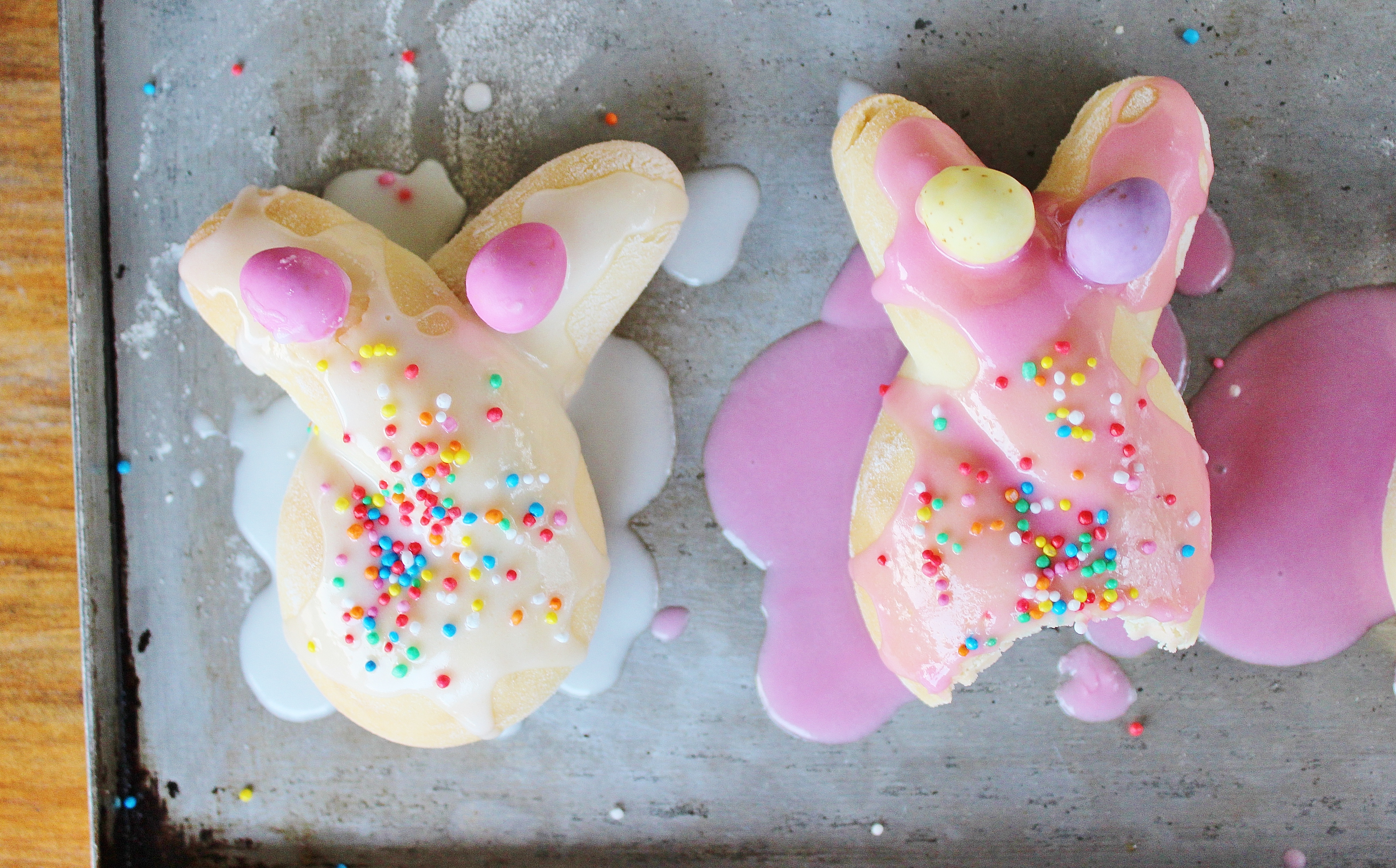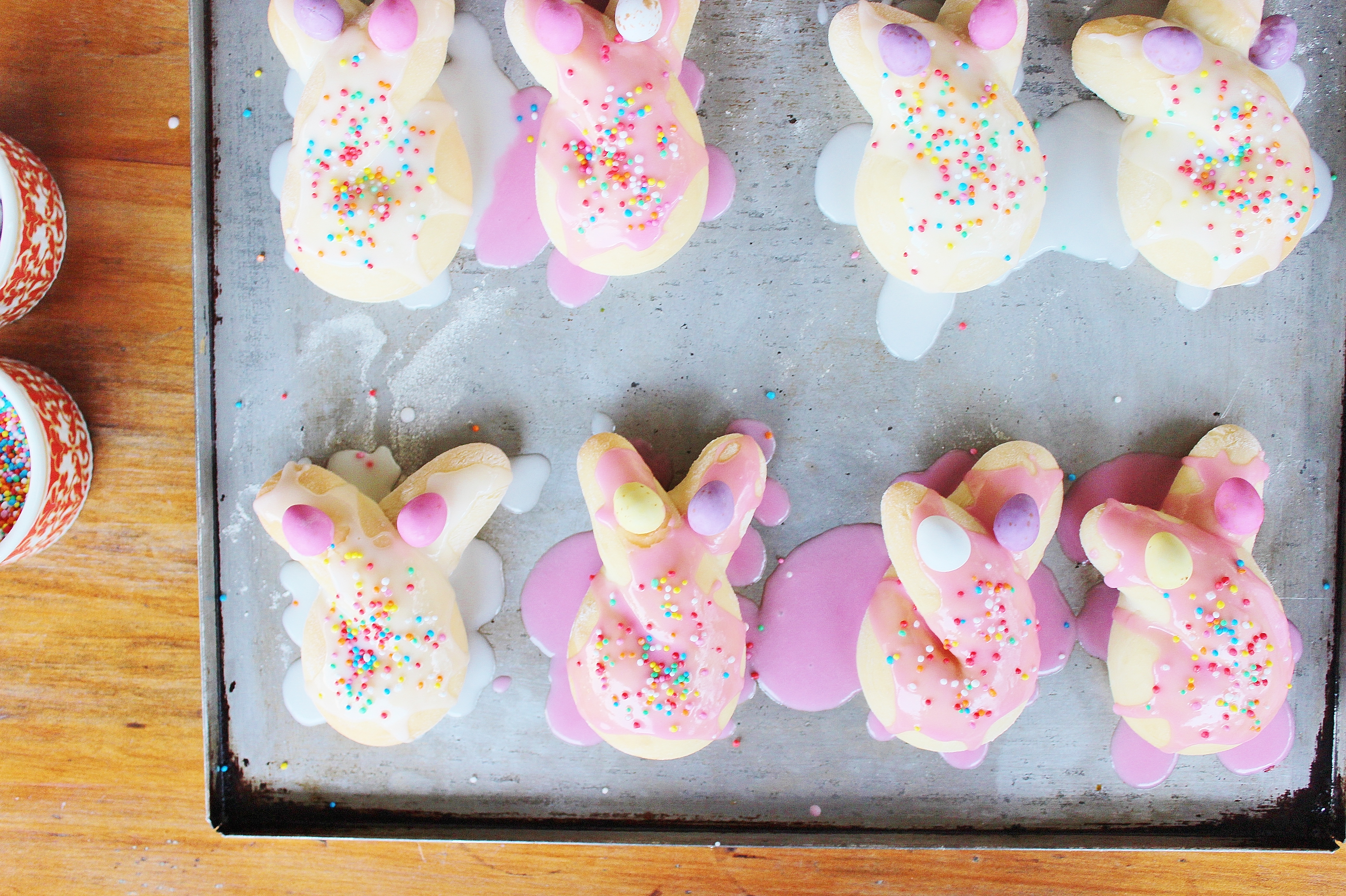 pairAllow to cool for 10 minutes before spooning the icing over the top. Don’t worry about being too neat, the mess is part of the fun. Place the mini eggs on the ears and scatter your sprinkles over the rest of the bunny. You can allow the icing to set, or you can eat them while they’re all gooey and sticky and still warm – I’d recommend the messier option!