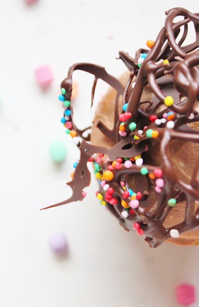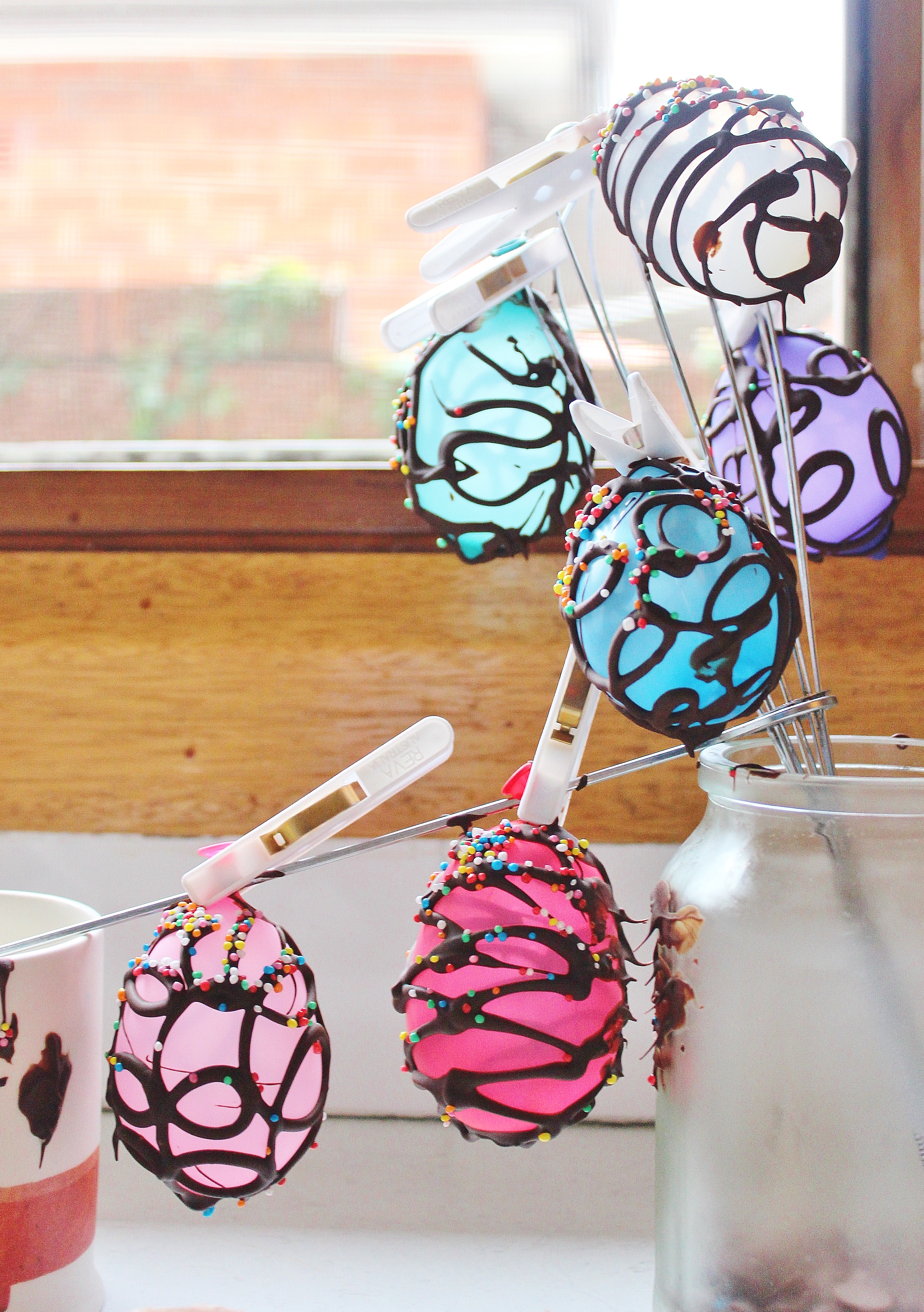 Peg to your skewer and repeat with remaining balloons, then scatter sprinkles over the top of them. You’ll end up with a weird little Easter art installation if you take the same approach as me.